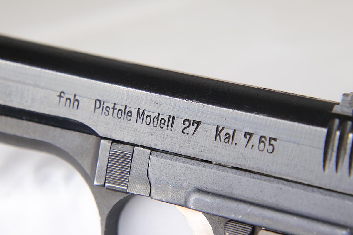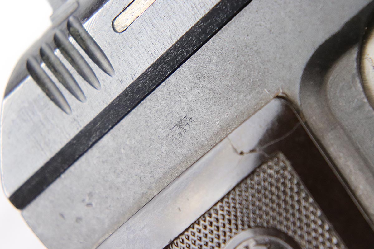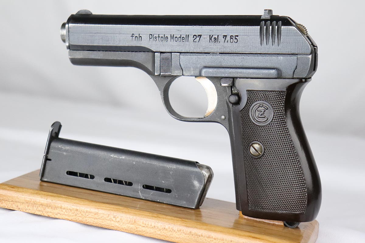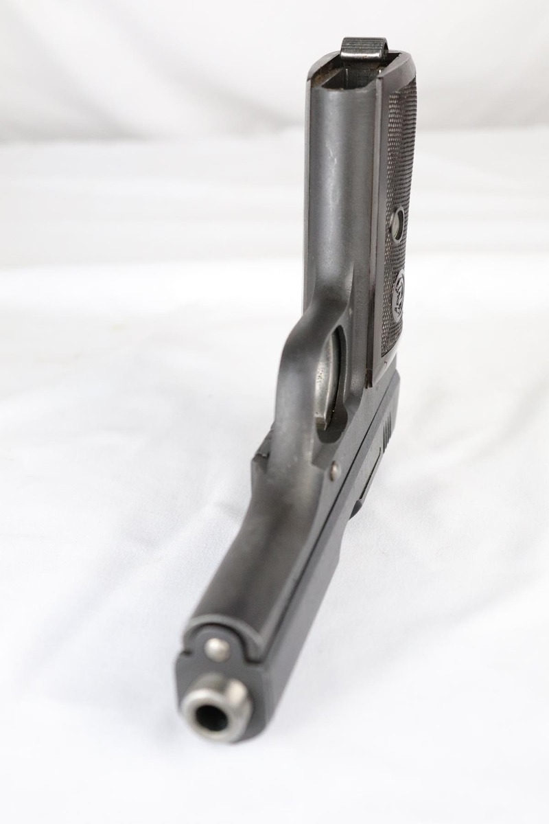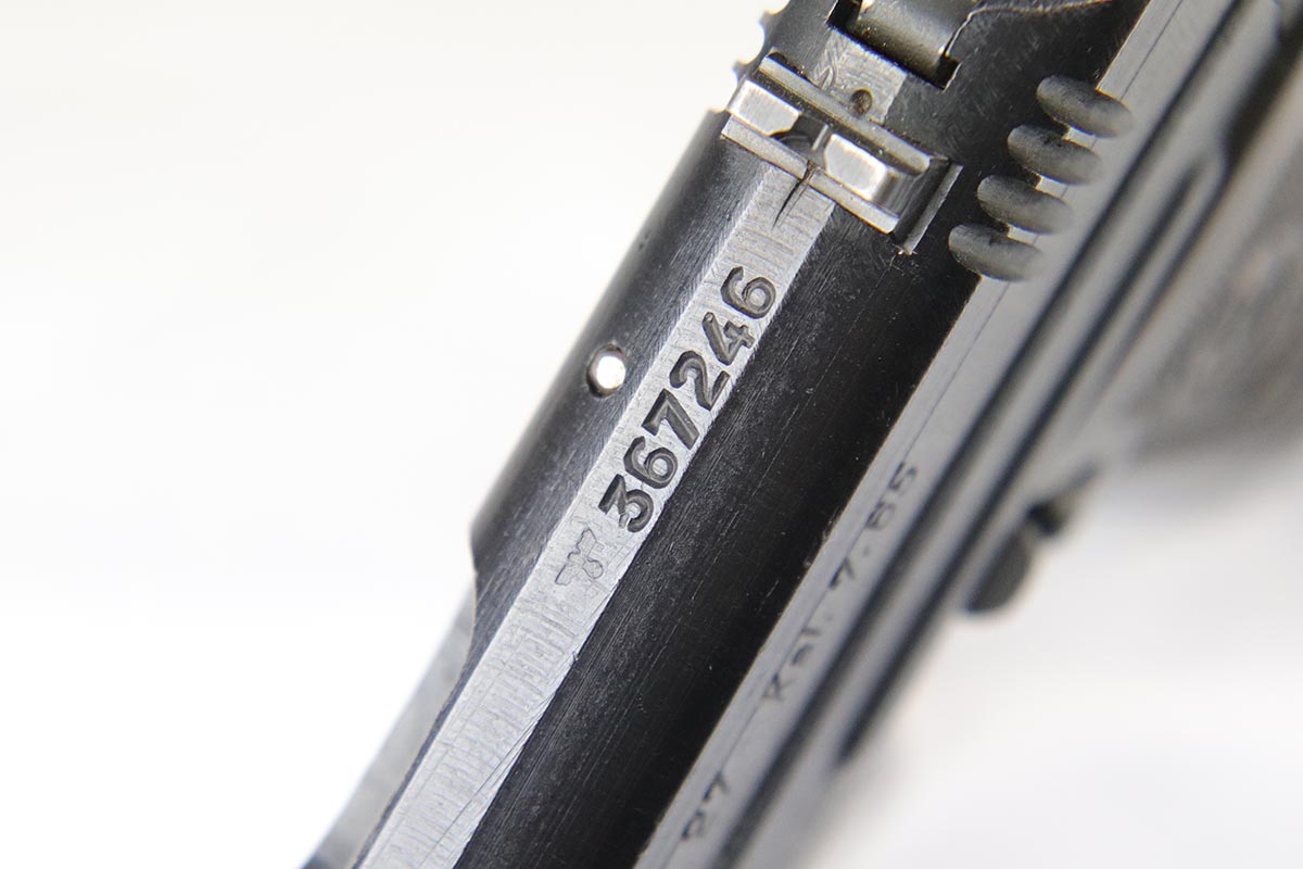 4/30/18 – This is an excellent wartime production example of a CZ model 27. The pistol is in excellent condition overall that we rate in 98%. The only wear is some straw finish loss on the trigger, and a small hairline crack on the right grip panel (top right corner – see photos). The pistol finish is excellent overall though and the ejector has nice straw finish. The bore is minty condition as well. Comes with a period correct magazine, and is guaranteed original and fully functional.