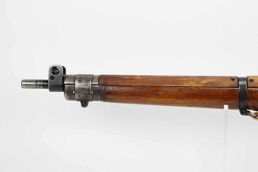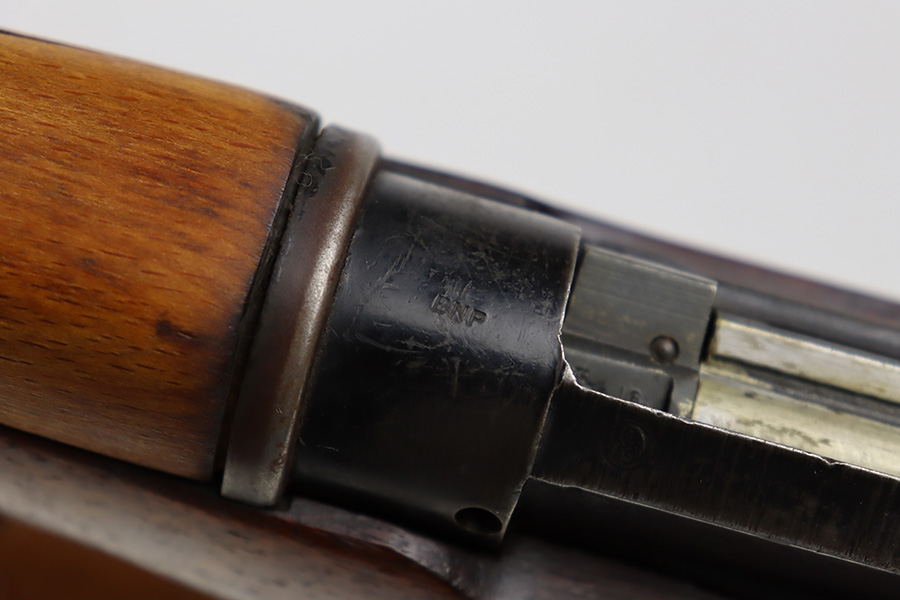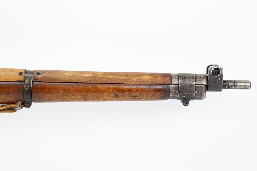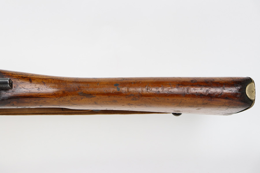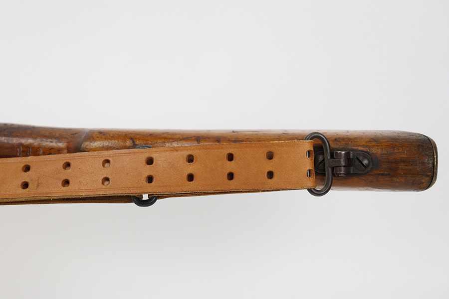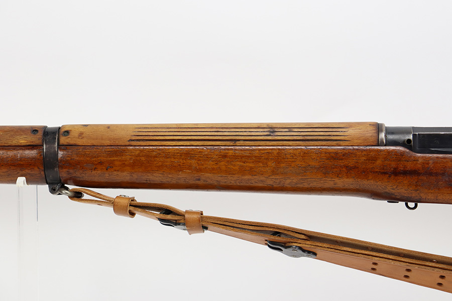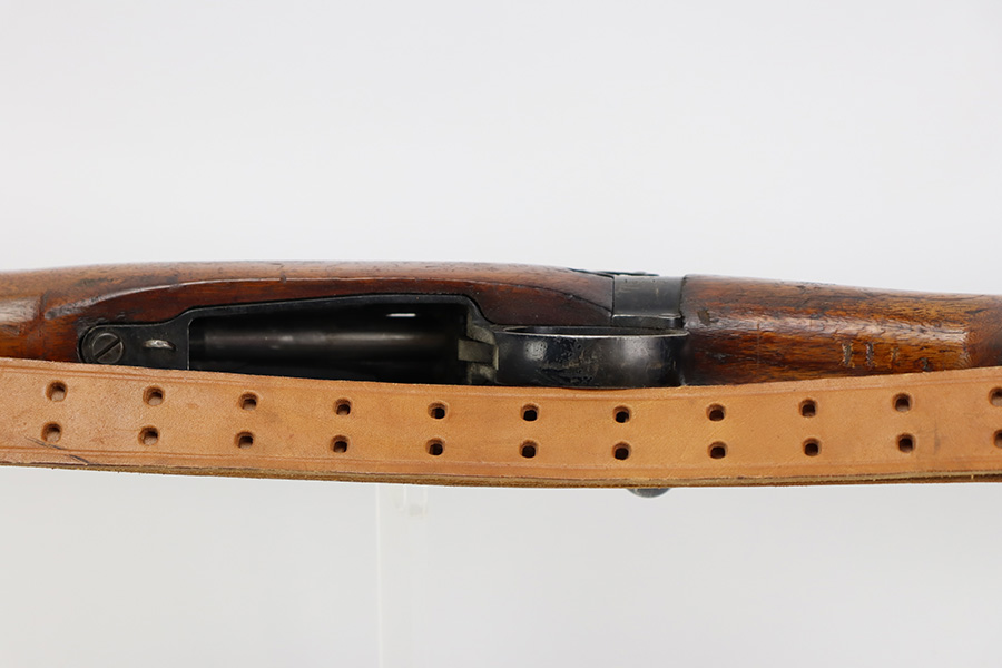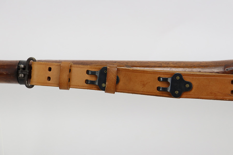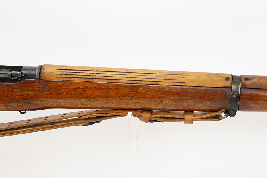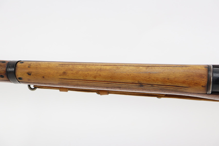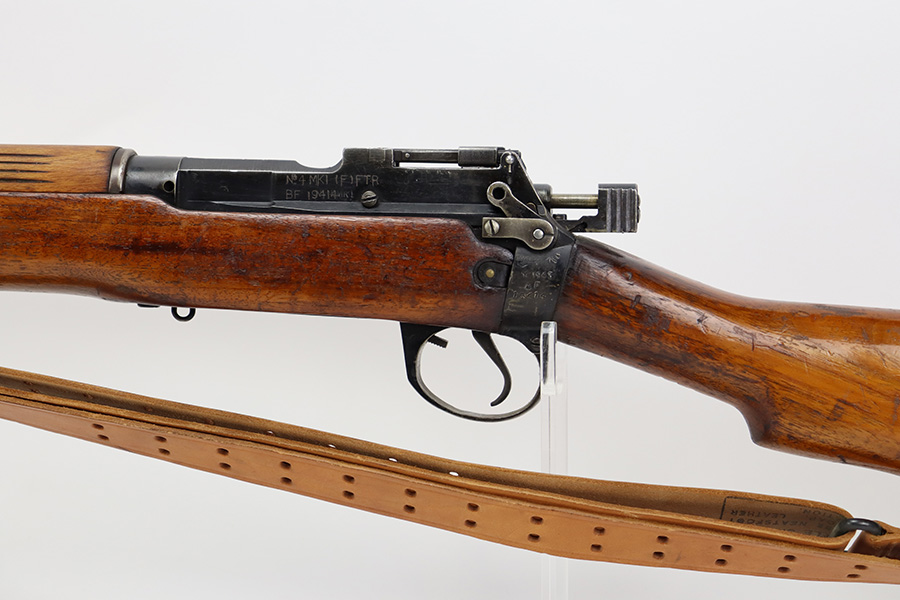7/24/23 – This is a nice example of an Enfield No 4 Mk 1 made by Fazakerley in 1943. The bolt is mismatched, and the magazine is missing. The front barrel band was made by Savage. The receiver is marked “FTR” for Factory Thorough Repair. The metal parts have retained roughly 60% of their finish. There is general high edge wear, but the majority of the finish loss is towards the muzzle. The wood furniture shows obvious scratching and bruising throughout, and the upper handguards have been lightly sanded. The bore has good rifling, but there is minor frosting throughout. Comes with an excellent reproduction leather sling.