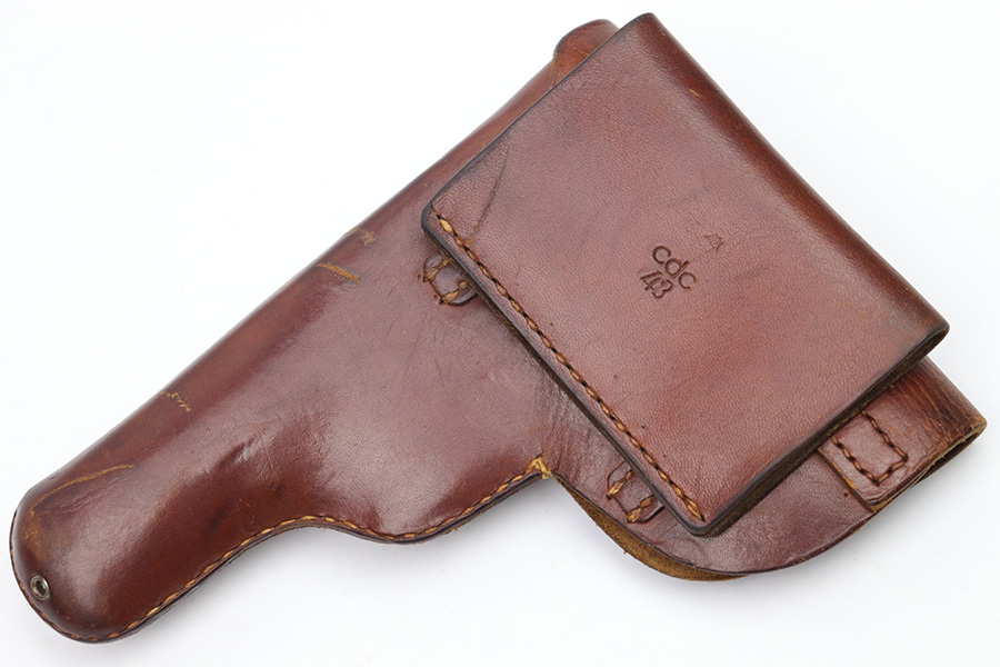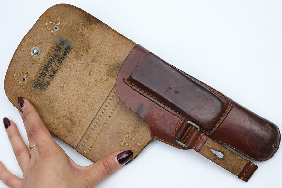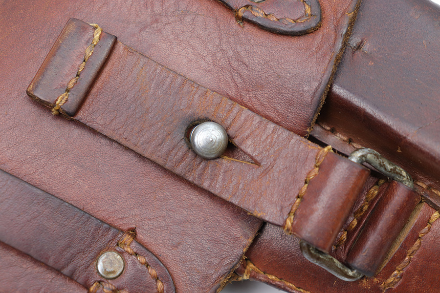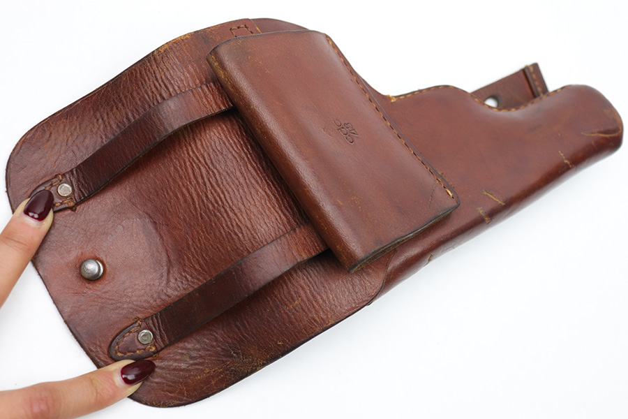 1/11/23 – This is an original 1943 dated Femaru 37M dropping style leather holster. The holster is maker stamped, dated, and luftwaffe proof stamped on the back belt loop. The Luftwaffe proof is small but still visible above the maker stamp. The leather is soft and pliable with some surface wear and mild wrinkling. The interior leather shows evidence of previous use but no major issues. All original stitching is intact and without issue.
