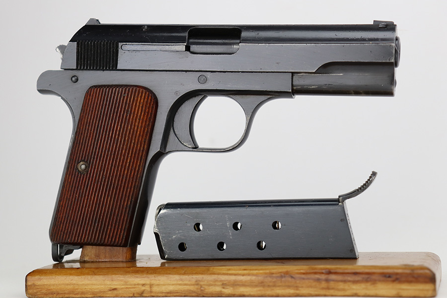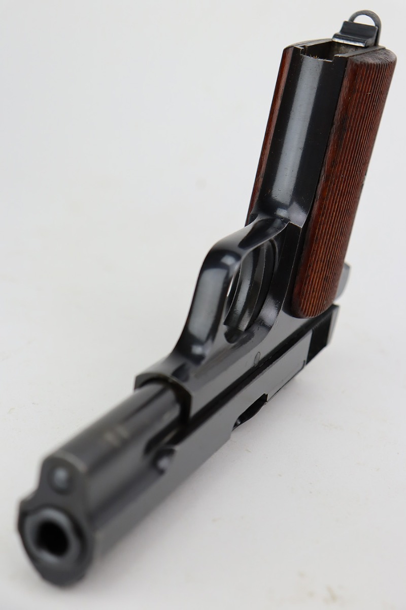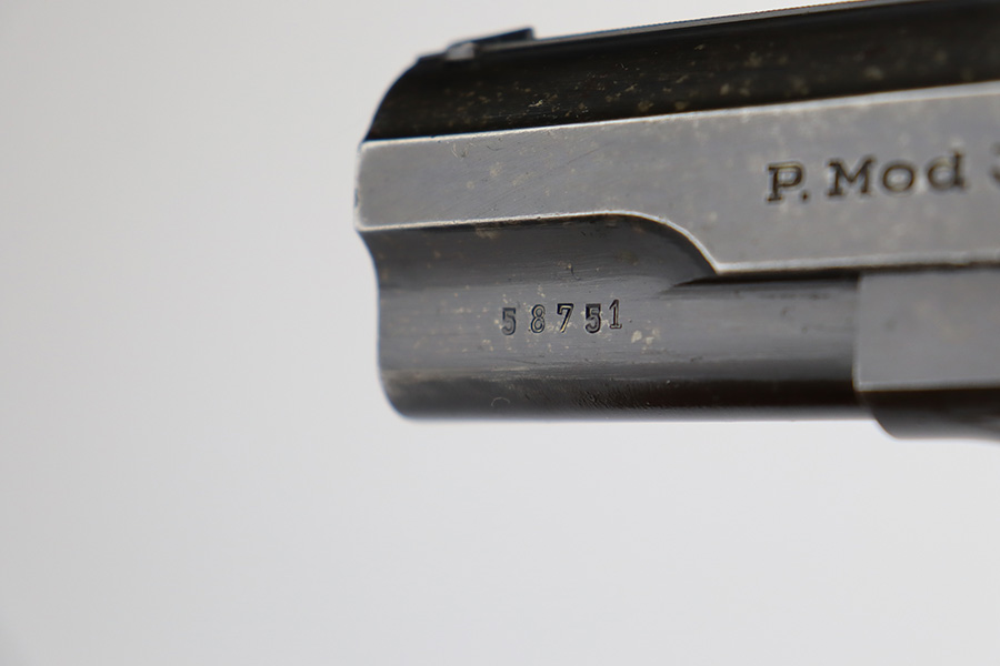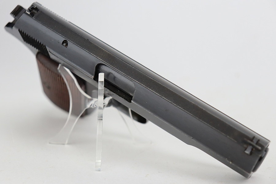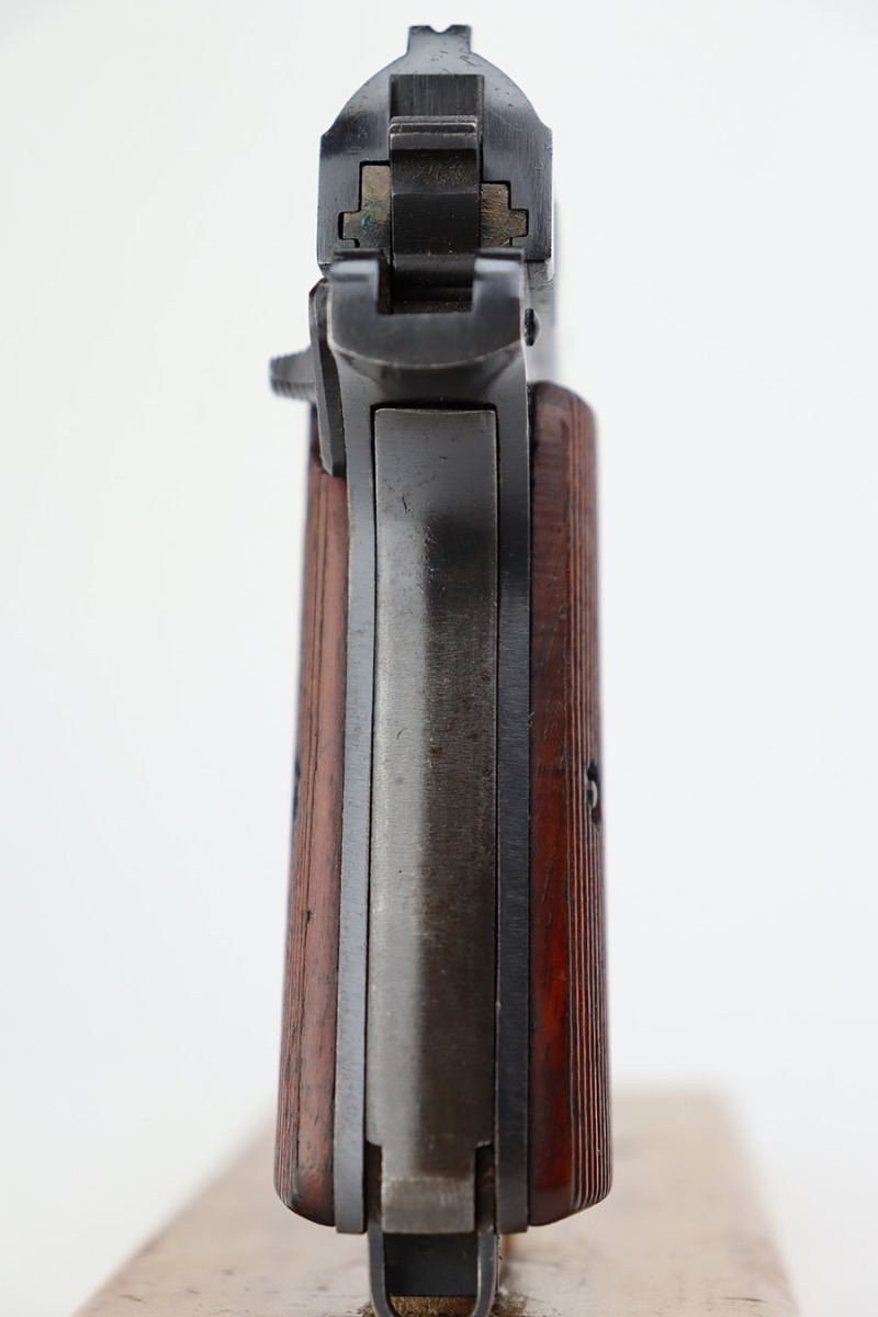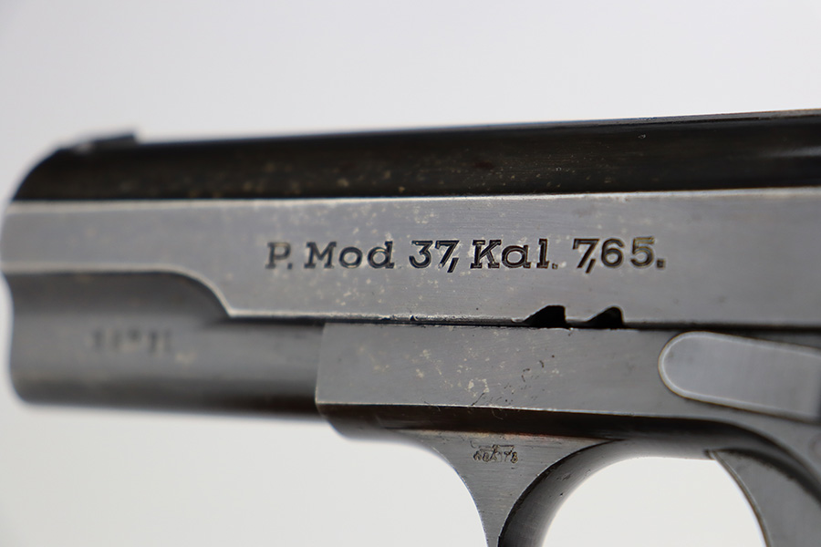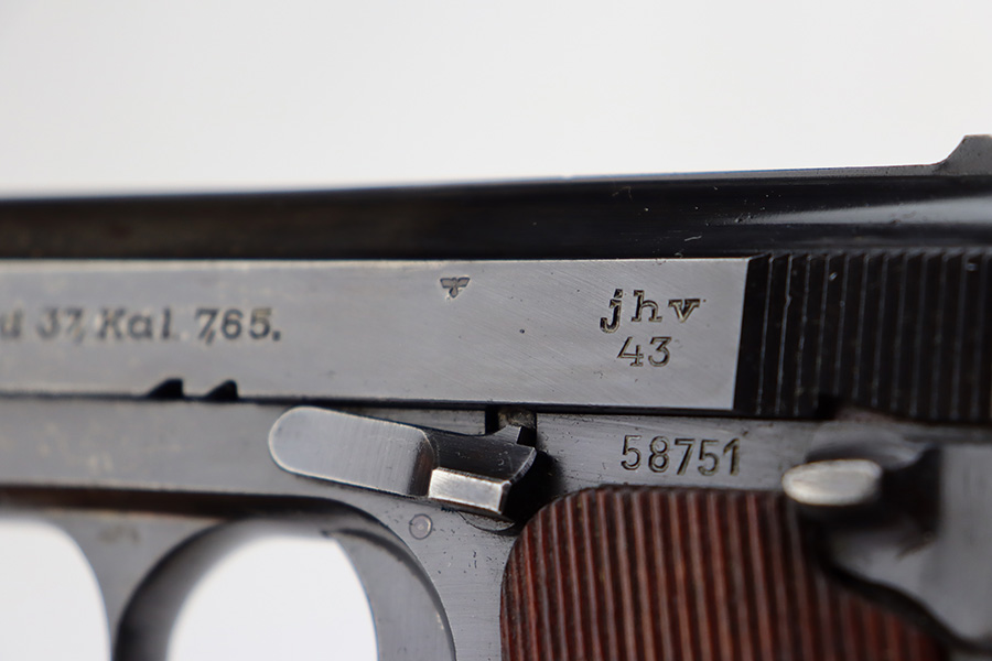 8/1/23 – This is an excellent example of a Femaru Model 37 issued to the Luftwaffe in 1943. All matching with the proper Nazi military acceptance proof on the left side of the trigger guard. Comes with one original matching-numbered magazine. The gun has retained about 95% of its original finish. While there isn’t much much actual bluing loss, there is noticeable light spotty discoloration along the left side of the gun. Fitted with excellent period-correct wood grips. Mint bore.