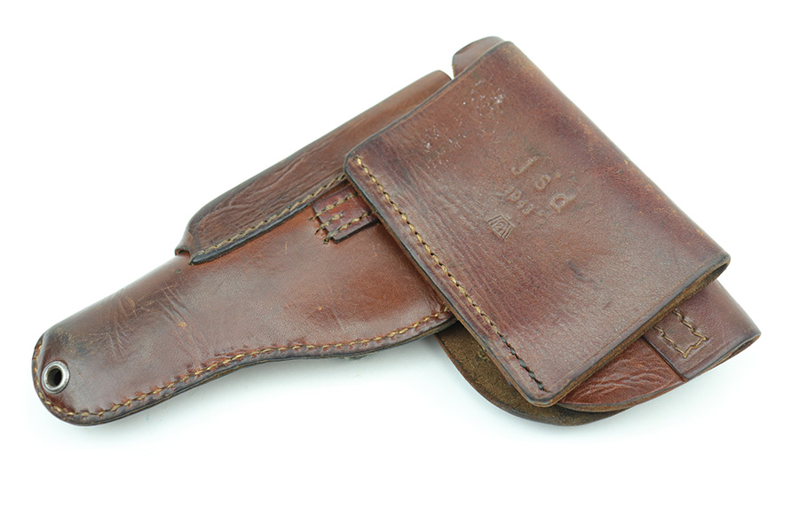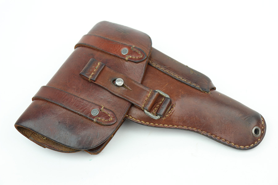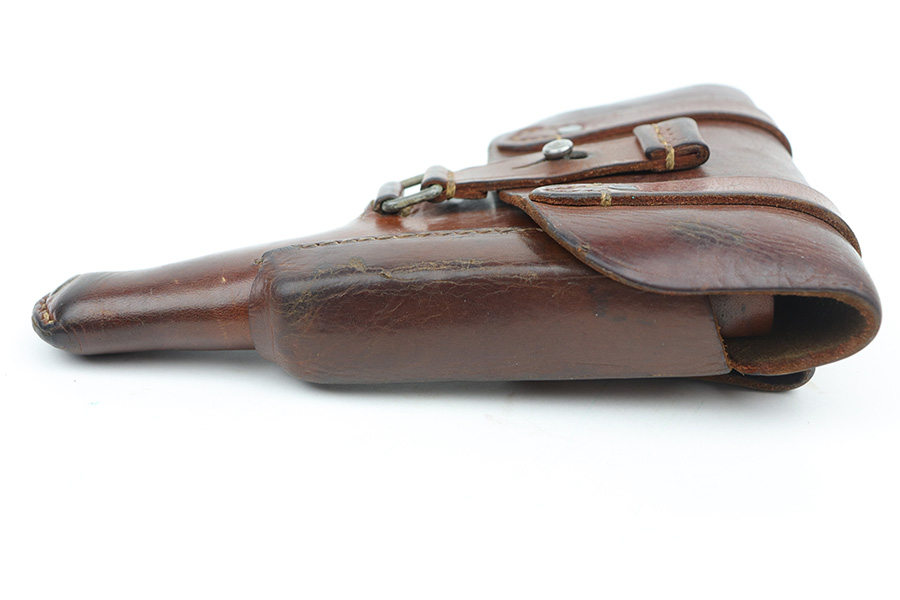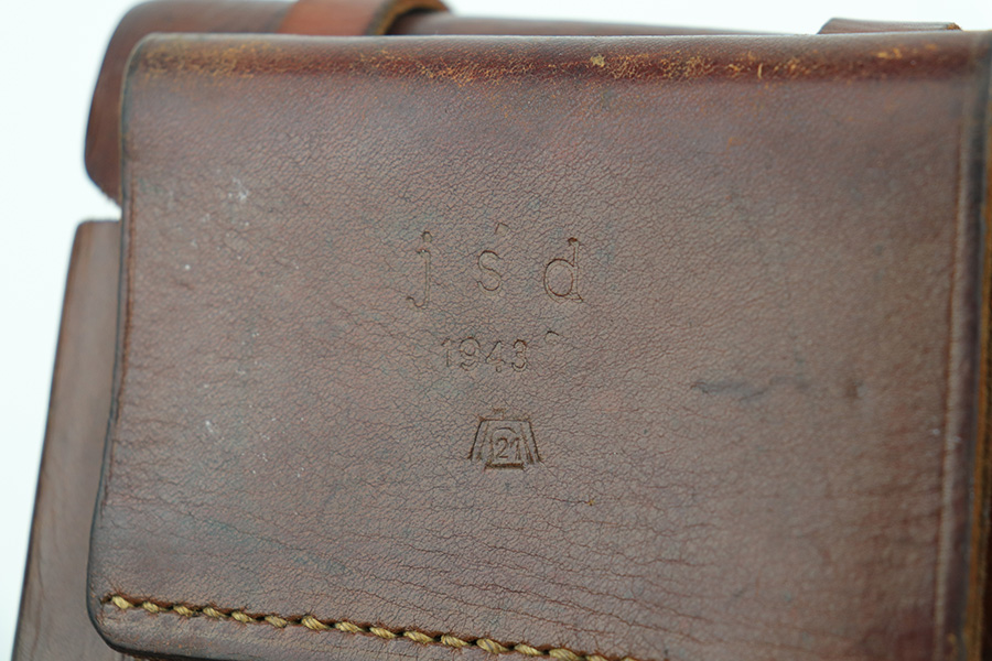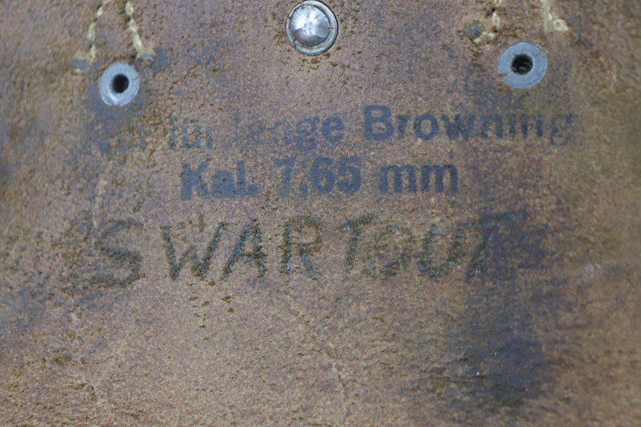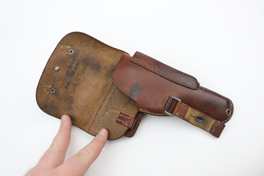 10/11/21 – This is an original 1943 production FN Browning M1922 holster. The holster is maker stamped, dated, and luftwaffe proof stamped on the back belt loop. The holster also has an interior ink stamp that’s still visible. The leather is pliable with normal wear and aging but no excessive damage. All original stitching in tact. There is a name lightly scratched into the interior leather.
