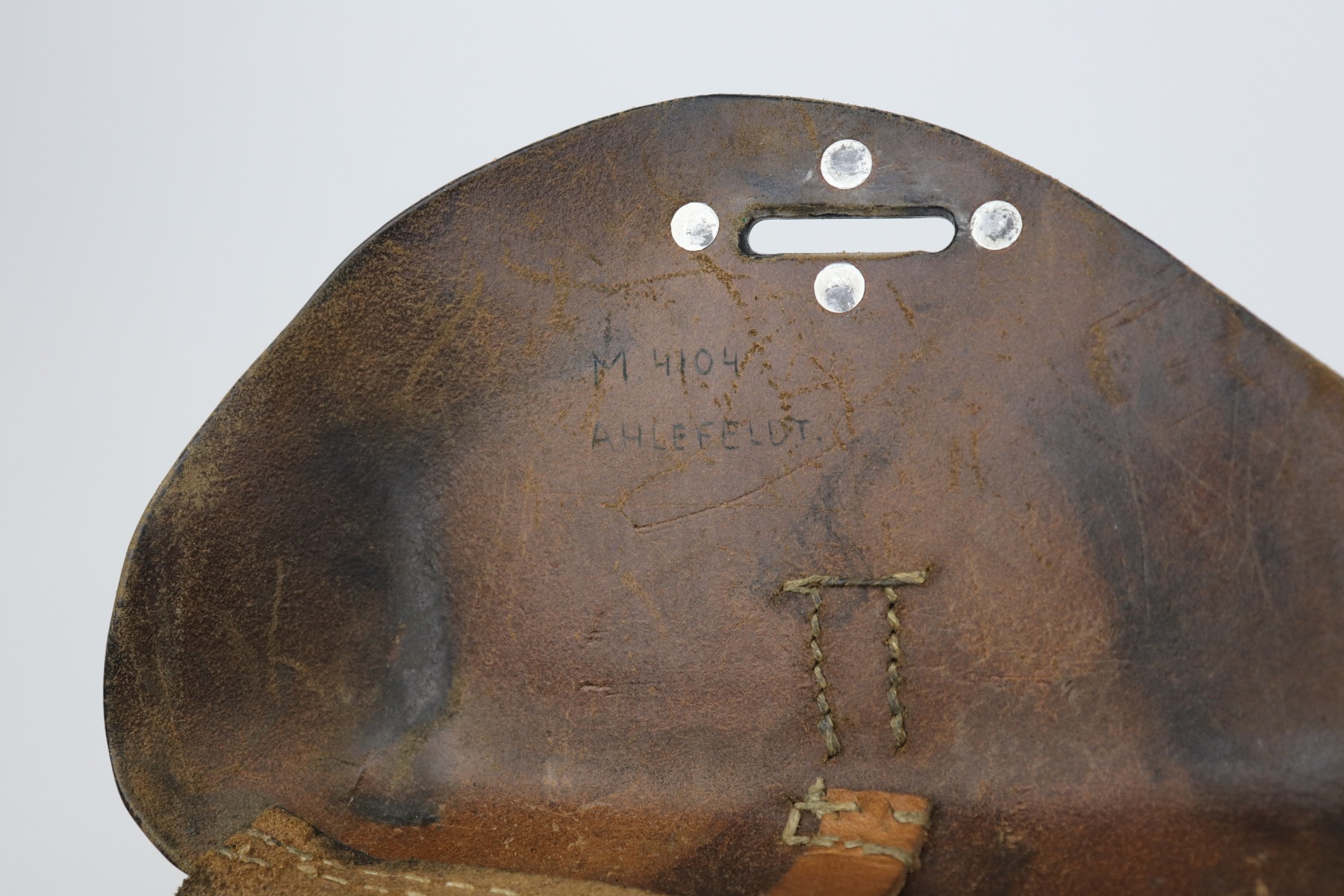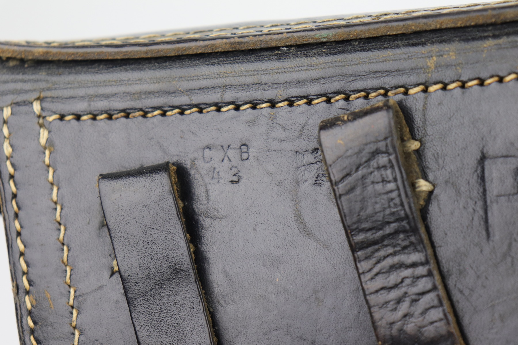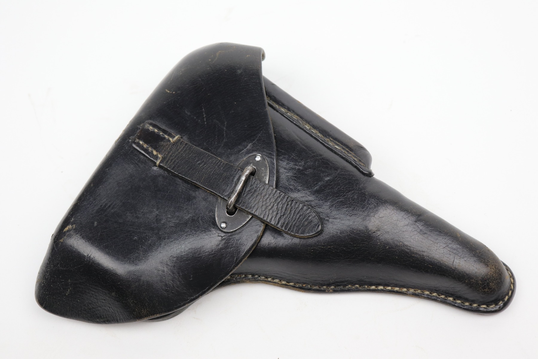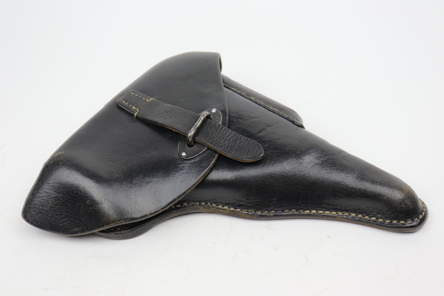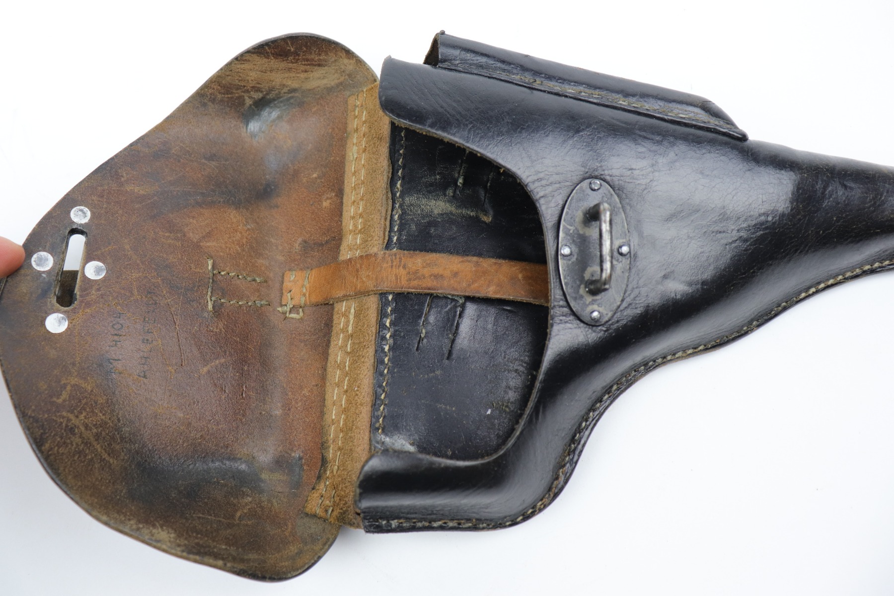 10/14/20 – This is an excellent example of a WW2-era black leather hardshell P.38 holster. It has a rare 1943 date, makers marked, and waffenamt. Overall in excellent condition except for some light surface cracking and handling marks on the front. Most of the black paint on the fittings is in tact. Excellent stitching. There is a name scratched into the leather on the inside.