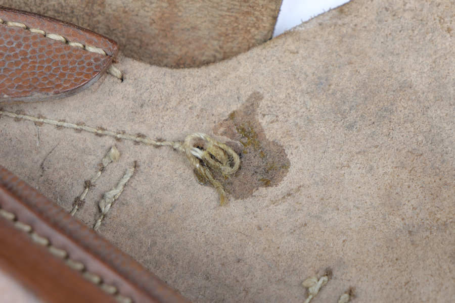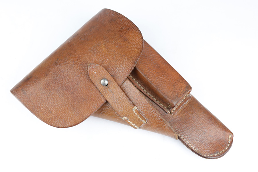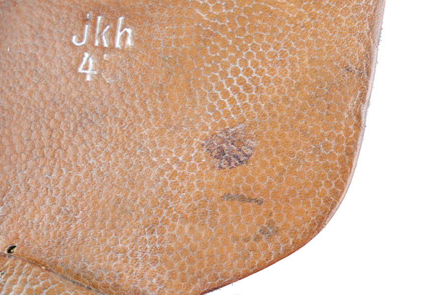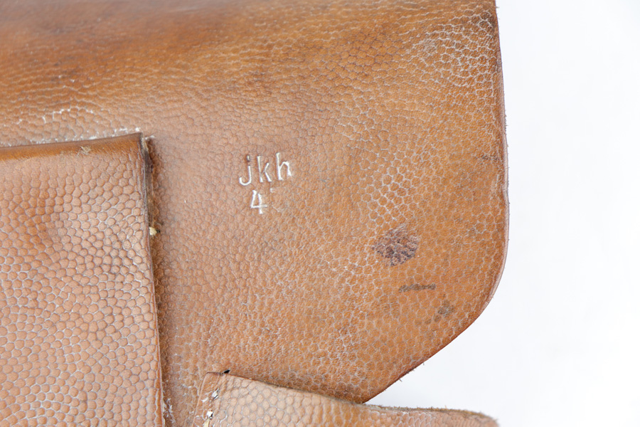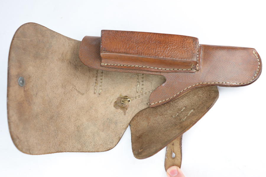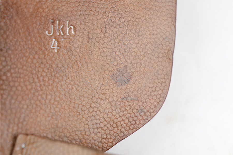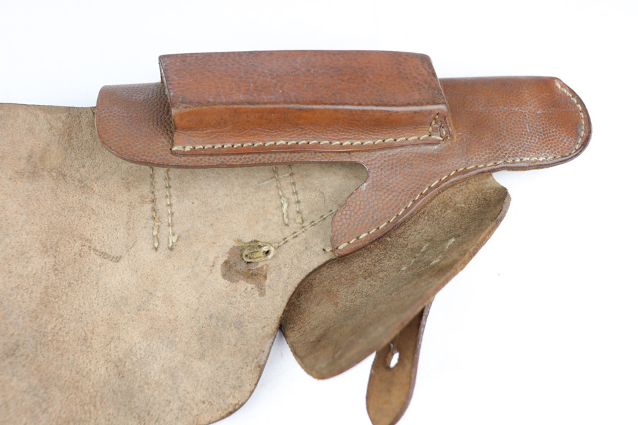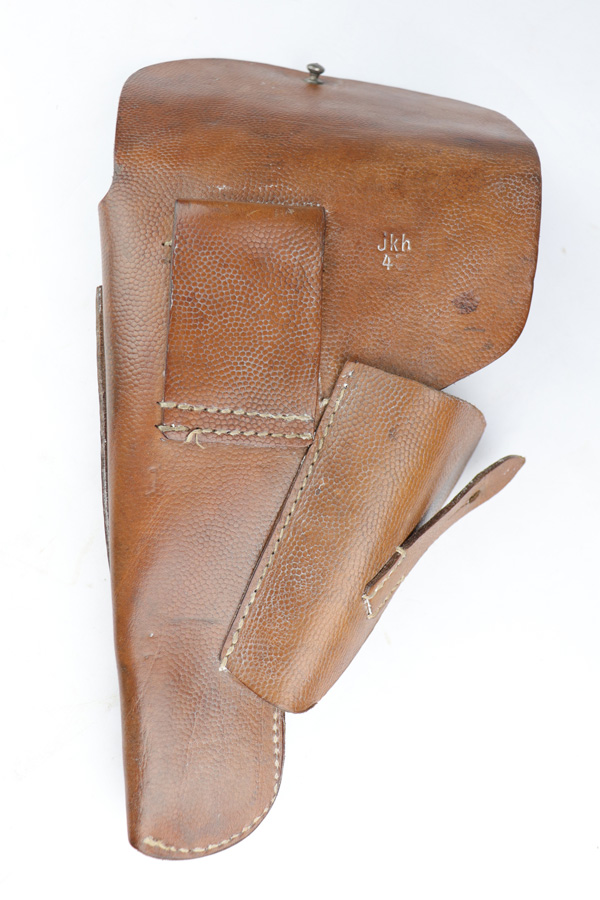 12/19/18 – This is an original 1943 dated Hi Power holster from WW2. The holster has very nice, minty brown pebble grain leather with a clean interior. The backside of the leather is “jkh” maker stamped and ’43 dated with a small waffen proof stamp. The stitching is all tight and in tact with the only notable flaw being the interior leather is glued down in one area. Looks like the stitching was beginning to unravel and this was the solution at the time. Otherwise an excellent piece. Guaranteed original and authentic.