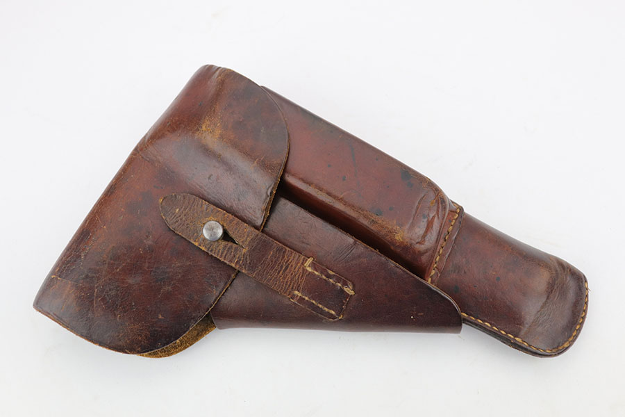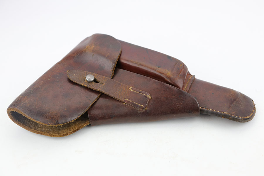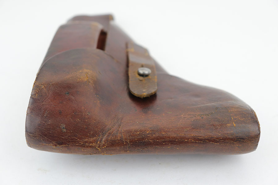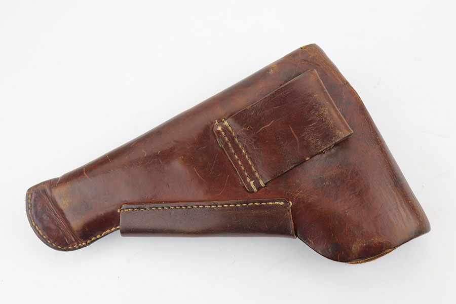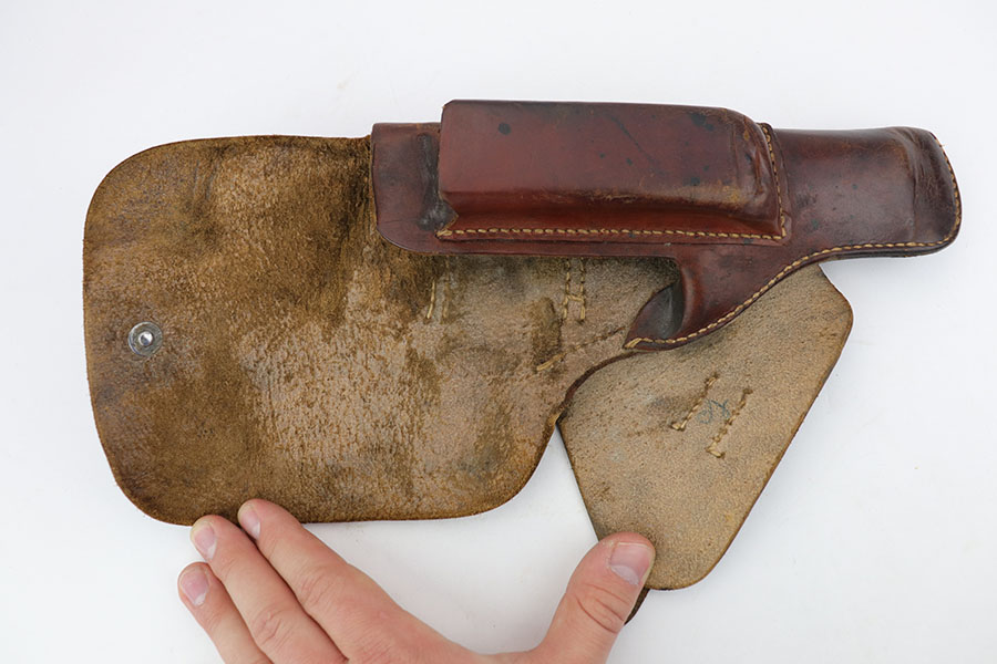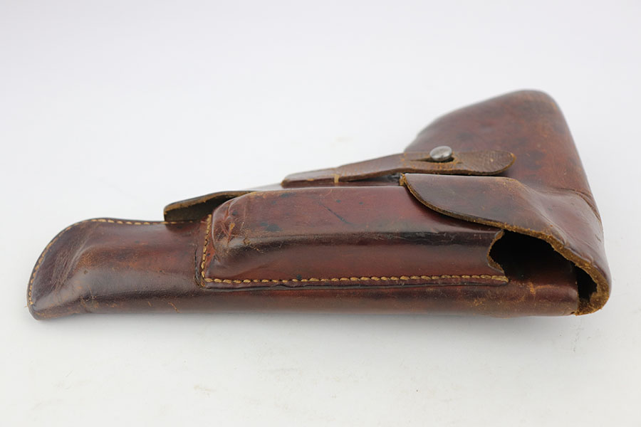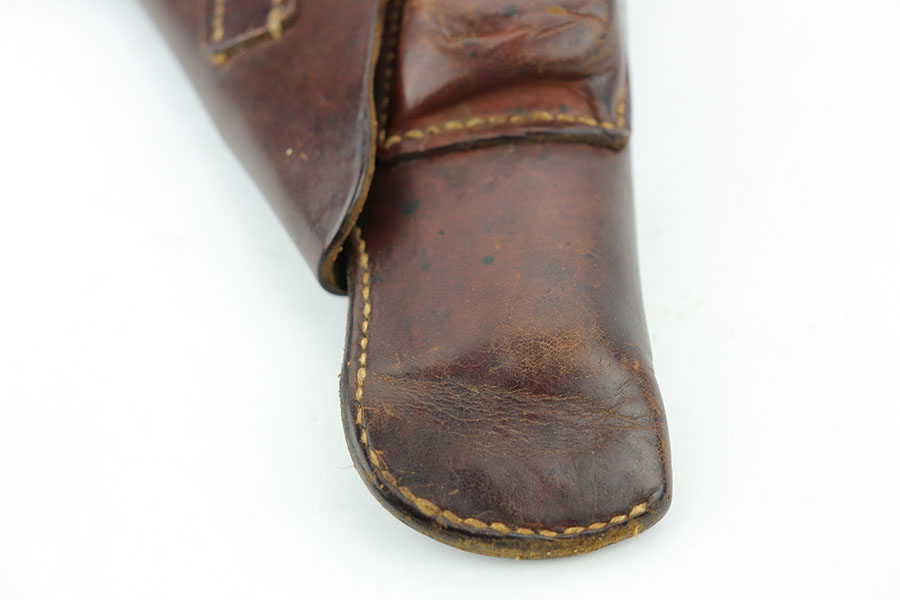 12/17/19 – This is a very nice 1943 dated waffen proofed Hi Power holster. The holster is “bdt” (somewhat unusual maker code for a hi power holster) and 1943 dated with a waffen eagle under the closure strap. The brown leather shows signs of use and having held a gun, but doesn’t have excessive wear. Normal pliability and some surface wrinkling / staining, but nothing excessive. All original stitching in tact.