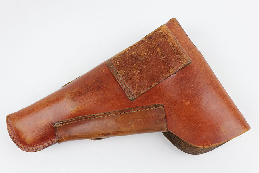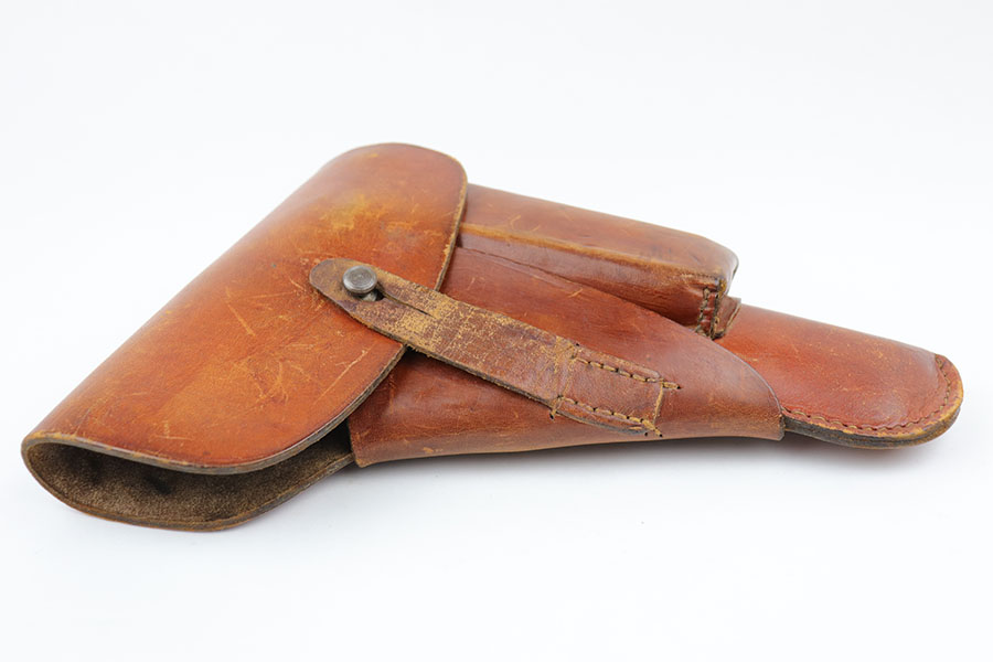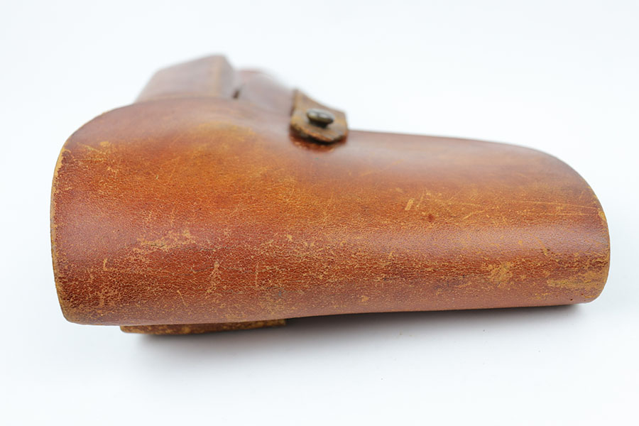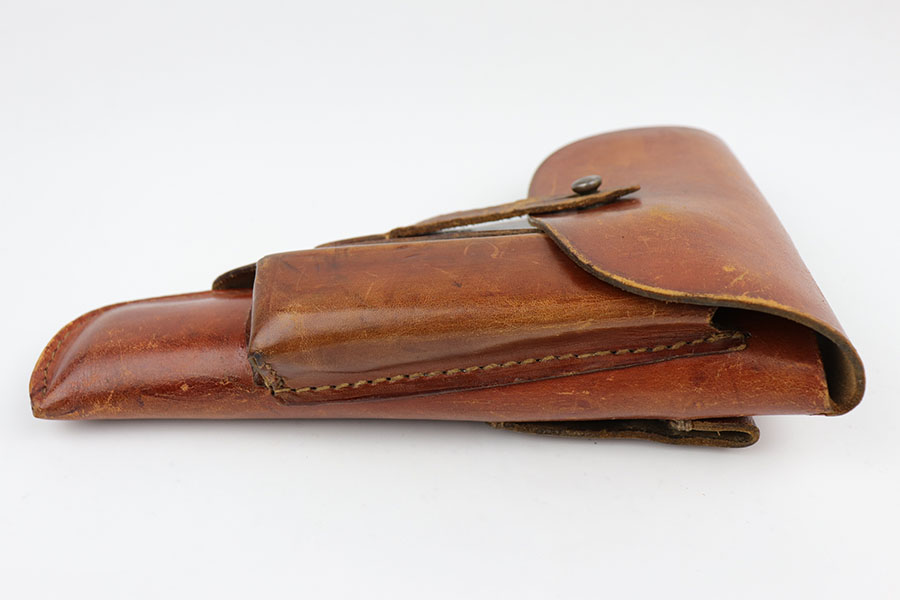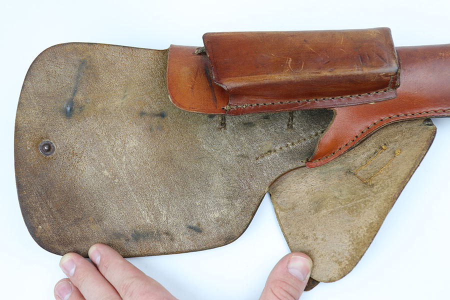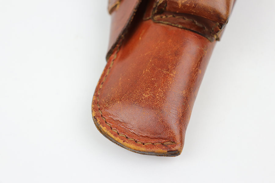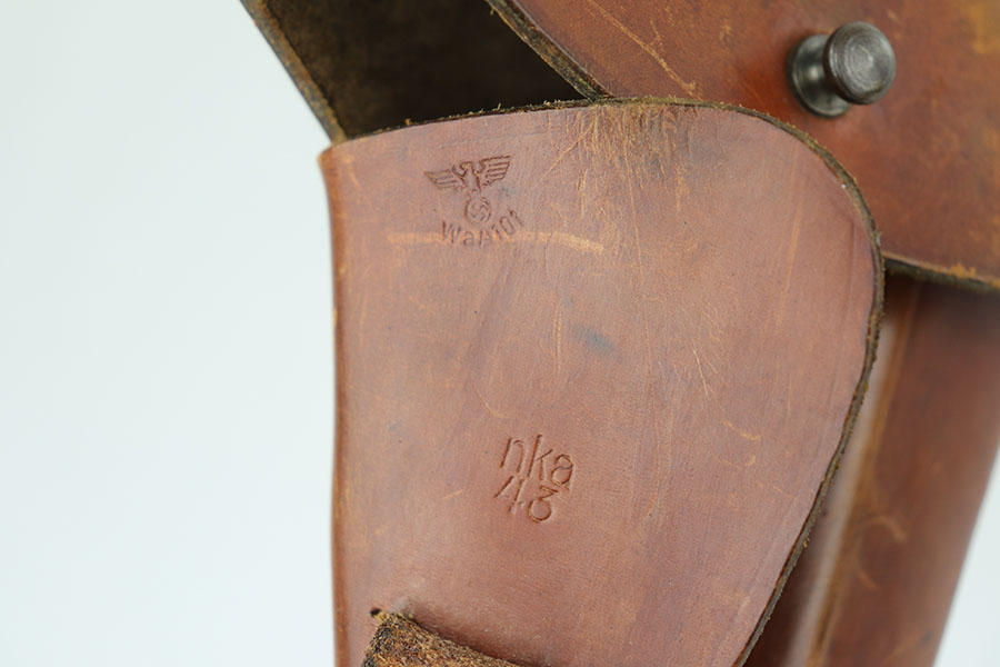 3/2/20 – This is an original 1943 dated hi power holster from WW2. The holster has nice brown leather that’s completely in tact. There is some scuffing on the top leather, on the magazine pouch, and on the closure strap. Under the closure strap is a maker stamp, waffen eagle, and ’43 date stamp. The stitching is all original and in tact. Fairly clean interior leather as well.