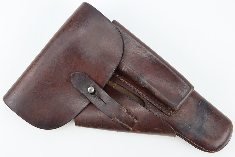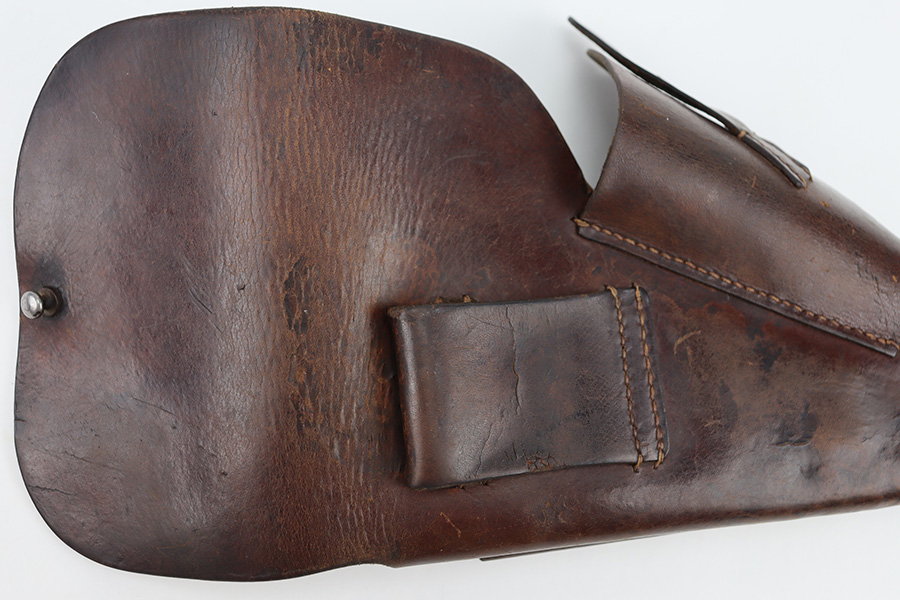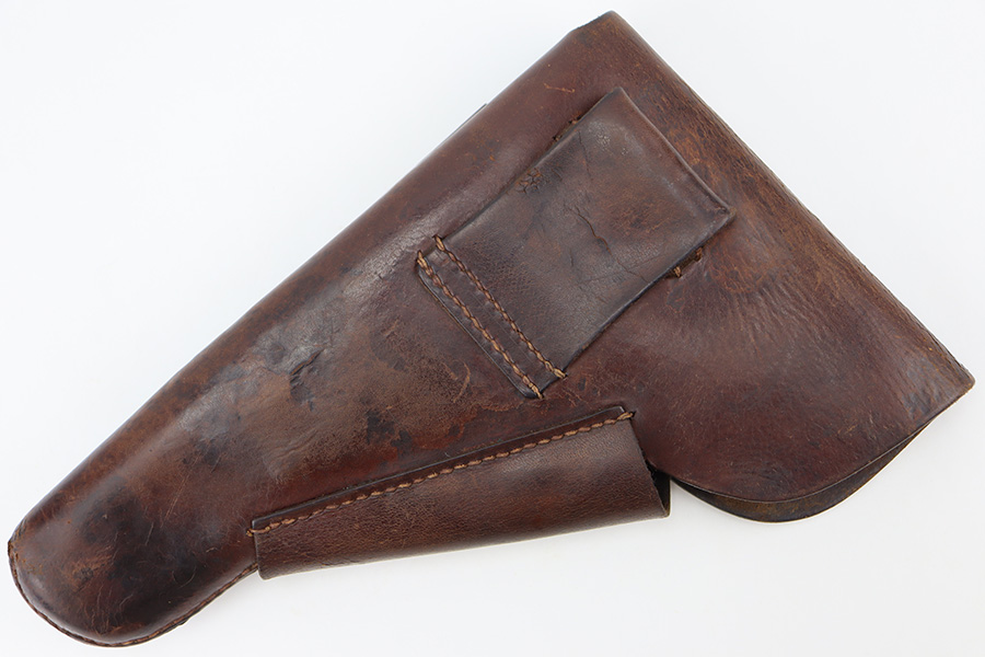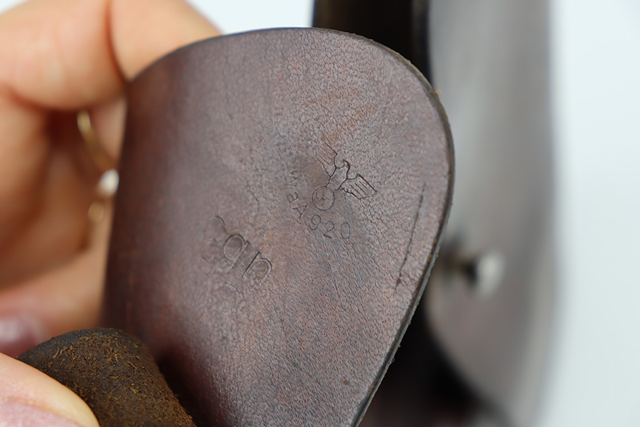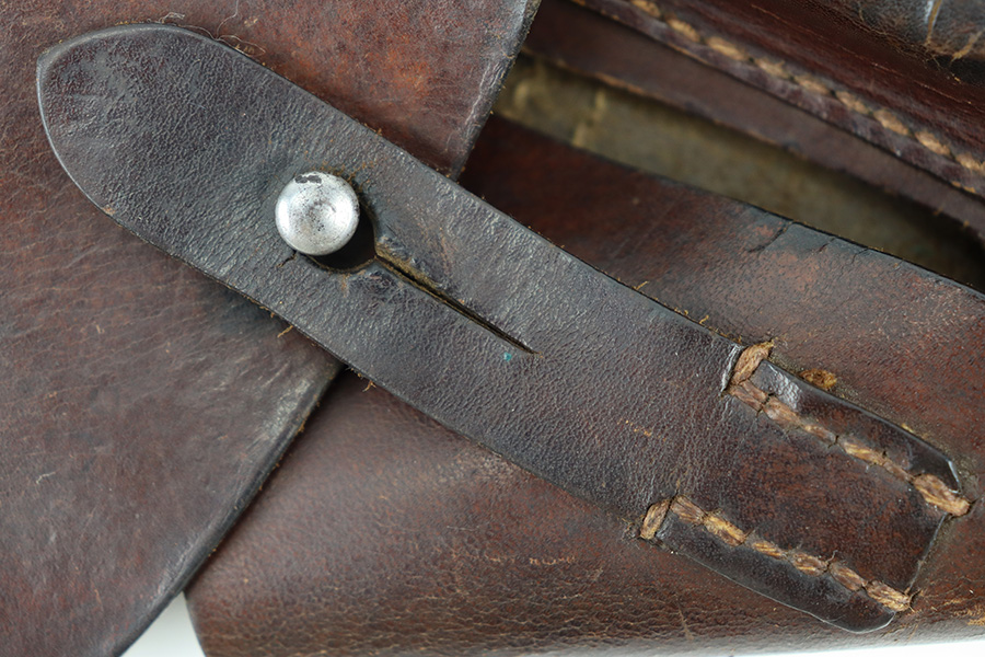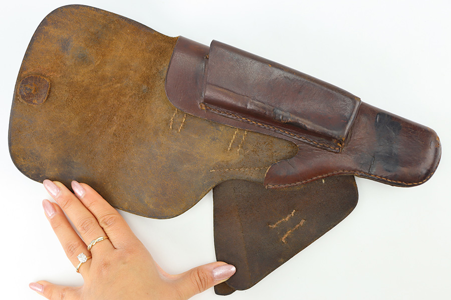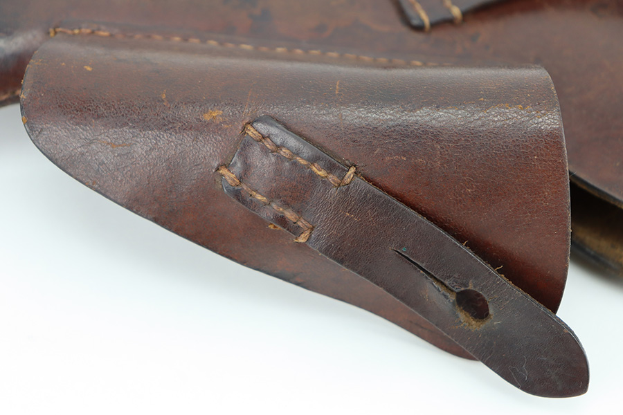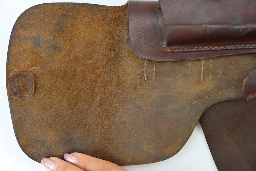 12/27/23 – This is an original 1943 dated High Power holster from WW2. The holster is in very good overall condition with some mild surface cracking and scuffs near the front toe. There’s wrinkling and typical surface wear on the rounded top leather as well as the back belt loop. Excellent original stitching throughout. Maker stamped on the side flap “cgn” with a very faint “43” date underneath. The side flap is also waffen proof stamped. Normal pliability.