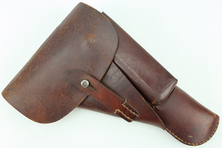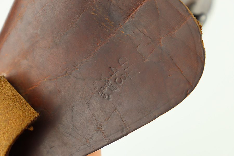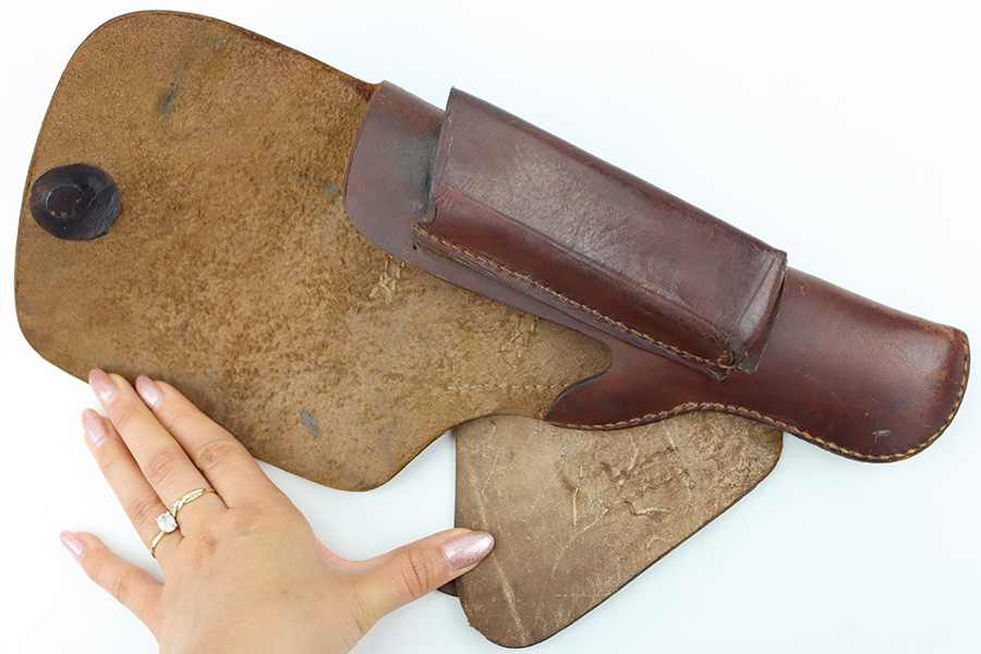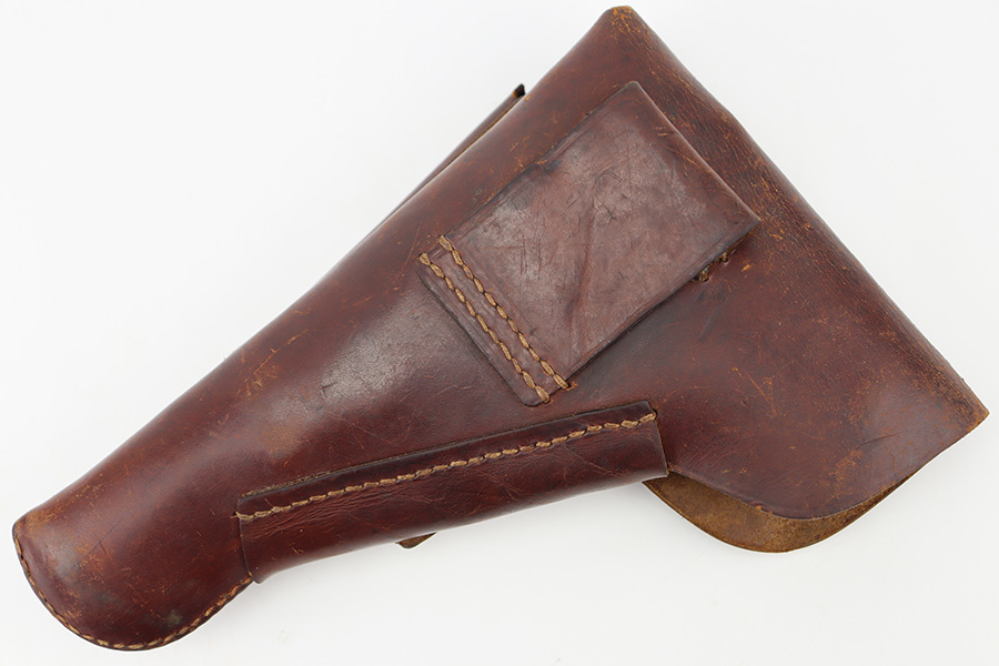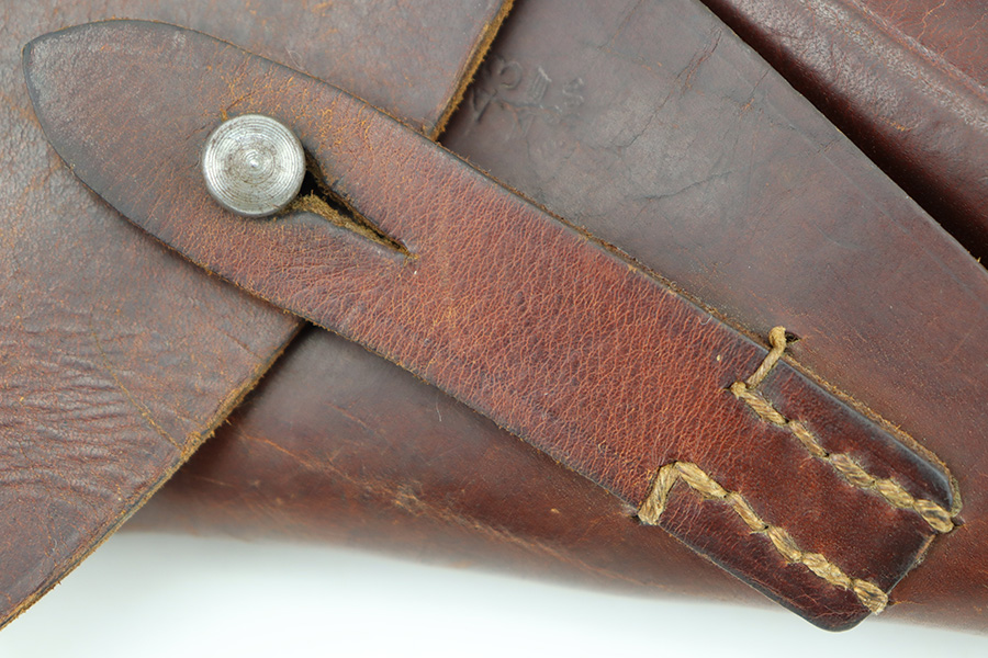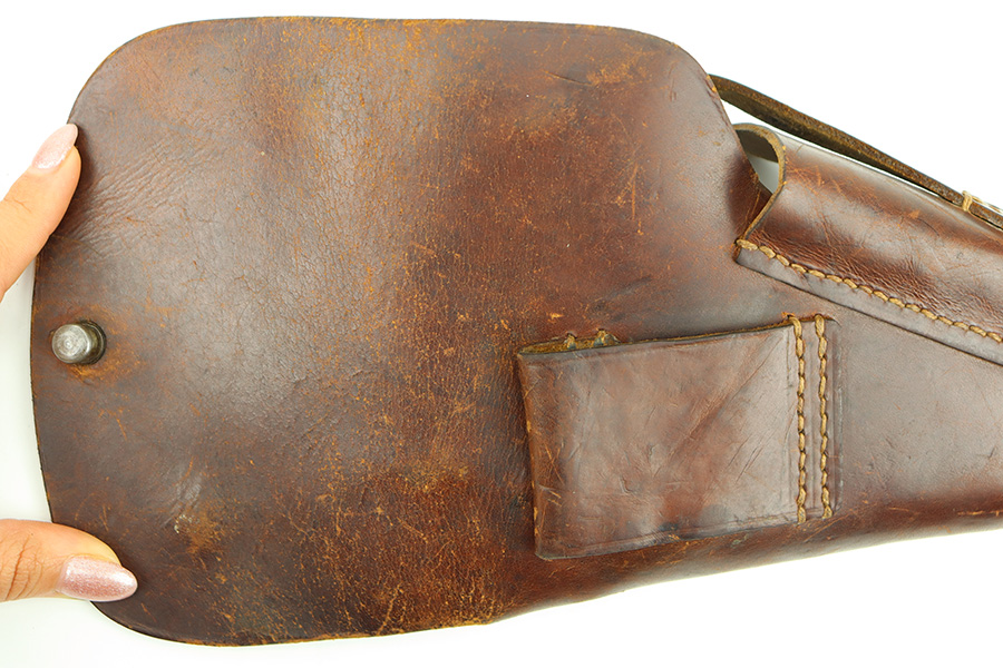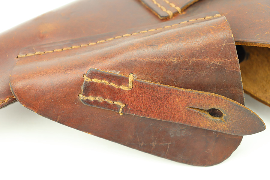 1/2/24 – This is an original WW2 production High Power holster. The holster is stamped with a maker code (dla), date (43), and waffen eagle military proof on the side flap, underneath the closure strap. The holster leather is all original and in great condition with normal softness and pliability. The front leather (top lid portion) has wrinkling and light surface wear. The interior leather has normal use wear but no major issues. The stitching is all original and intact throughout.
