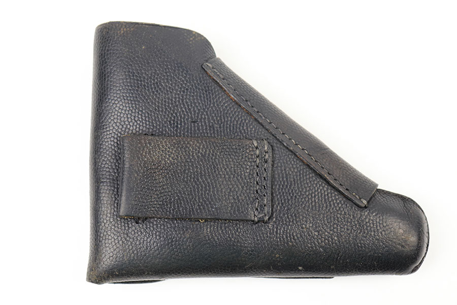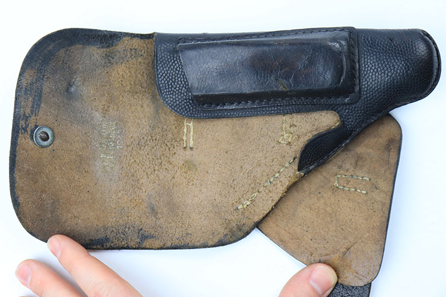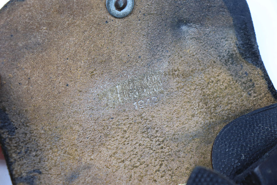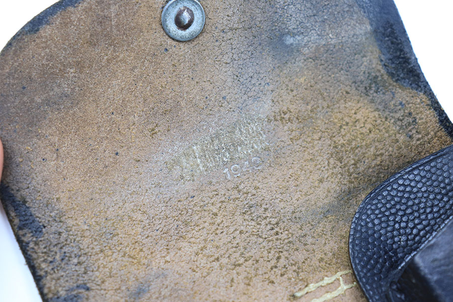12/28/22 – This is an original 1943 dated pebble-grain leather holster for a 7.65mm axis pistol. The interior leather is dated and maker stamped, though the maker stamp is too faint to decipher. The pebble grain leather has normal signs of aging and pliability. The stitching is tight and original. All leather and stitching is original throughout.