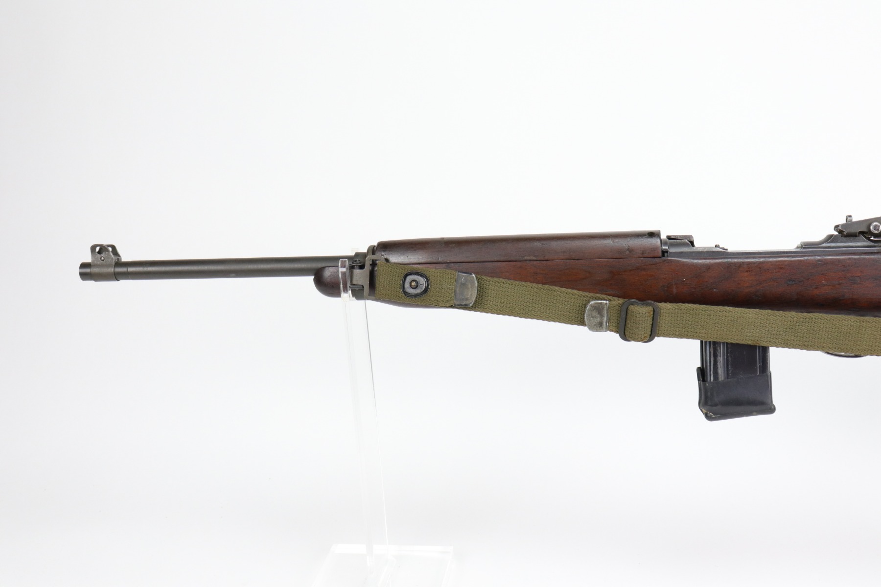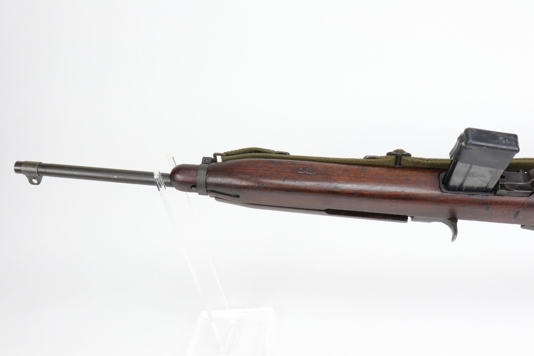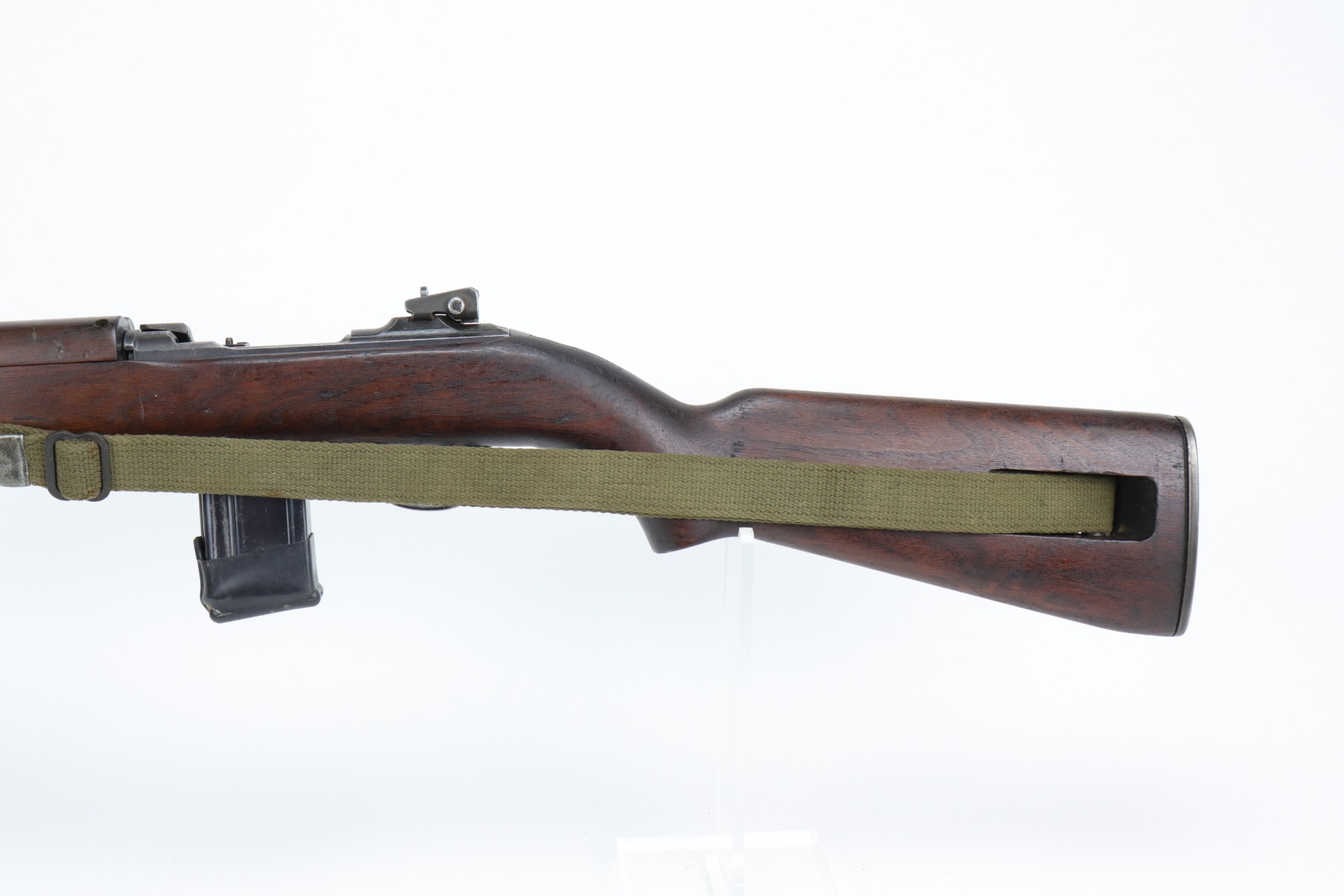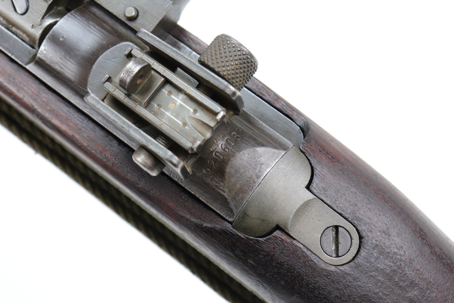 2/23/21 – This is an excellent example of an Inland M1 Carbine issued to the US military in 1943. The barrel is dated October of 1943. This could be original to the gun, but the receiver dates to about the summer of 1943. The gun has an Inland stock, handguard, and barrel. Winchester trigger group and safety. The hammer is marked “I-I”. The front barrel band is Underwood. The adjustable rear sight was likely added later for the Korean war. Overall, the gun is excellent, retaining almost all of its finish. There is minor wear on the edges of the ejection port, a few marks on the barrel, and some light spotty oxidation most noticeable on the receiver. The stock is excellent – just a few minor dings here and there, most noticeable on the right side. Comes with an oiler, sling, and a period-correct magazine. Mint bore.