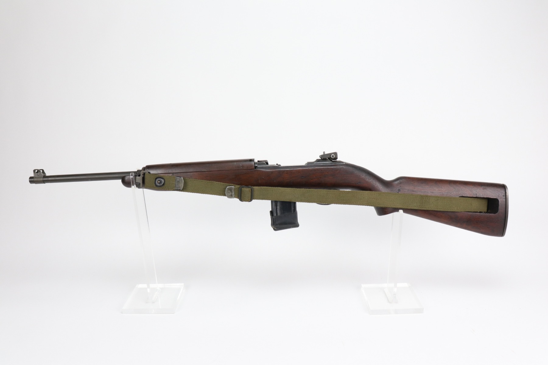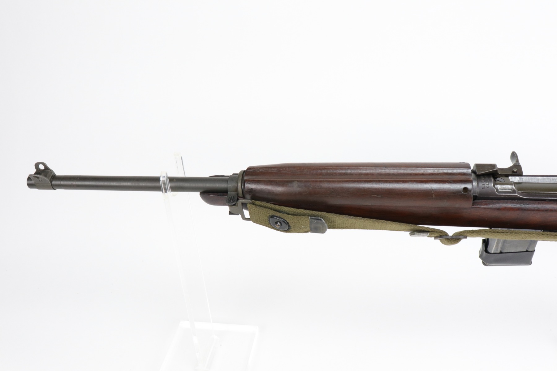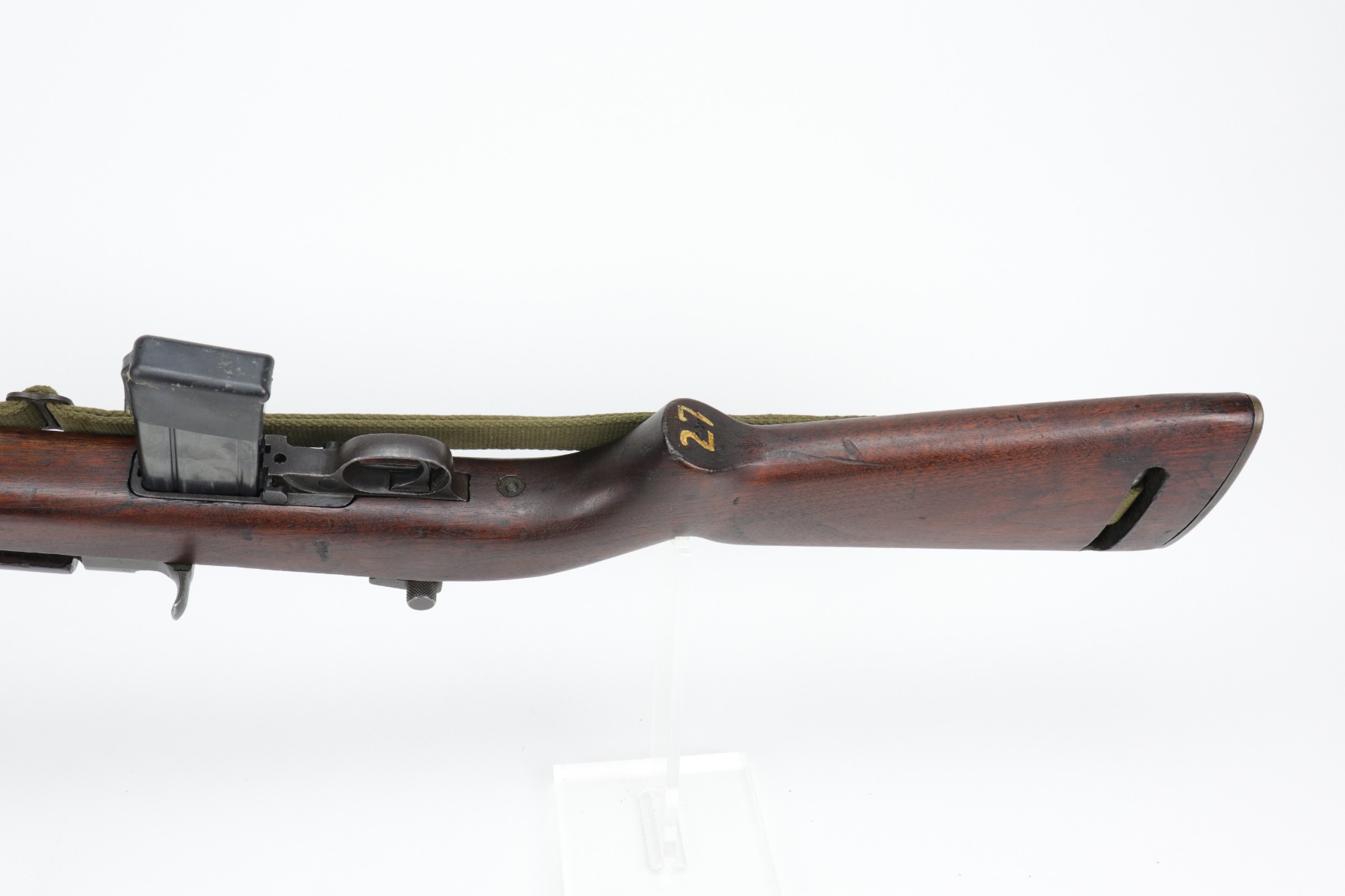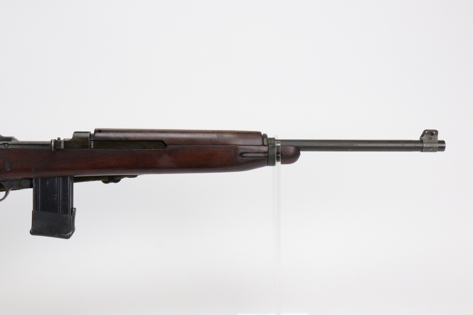 2/23/21 – This is an excellent example of an Inland M1 Carbine issued to the US military in 1943. The barrel is dated October of 1943. This could be original to the gun, but the receiver dates to about the summer of 1943. The gun has an Inland stock, handguard, and barrel. Winchester trigger group and safety. The hammer is marked “I-I”. The front barrel band is Underwood. The adjustable rear sight was likely added later for the Korean war. Overall, the gun is excellent, retaining almost all of its finish. There is minor wear on the edges of the ejection port, a few marks on the barrel, and some light spotty oxidation most noticeable on the receiver. The stock is excellent – just a few minor dings here and there, most noticeable on the right side. Comes with an oiler, sling, and a period-correct magazine. Mint bore.