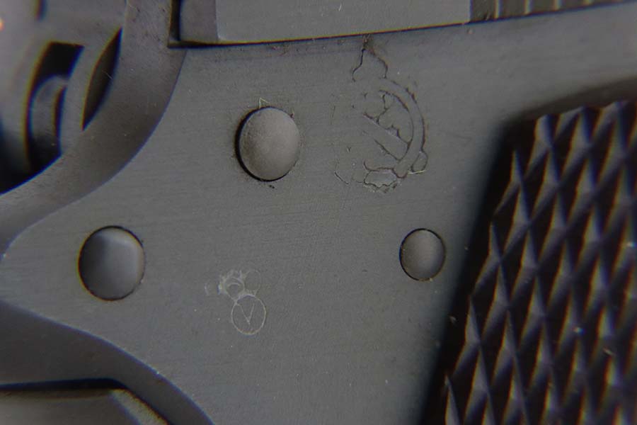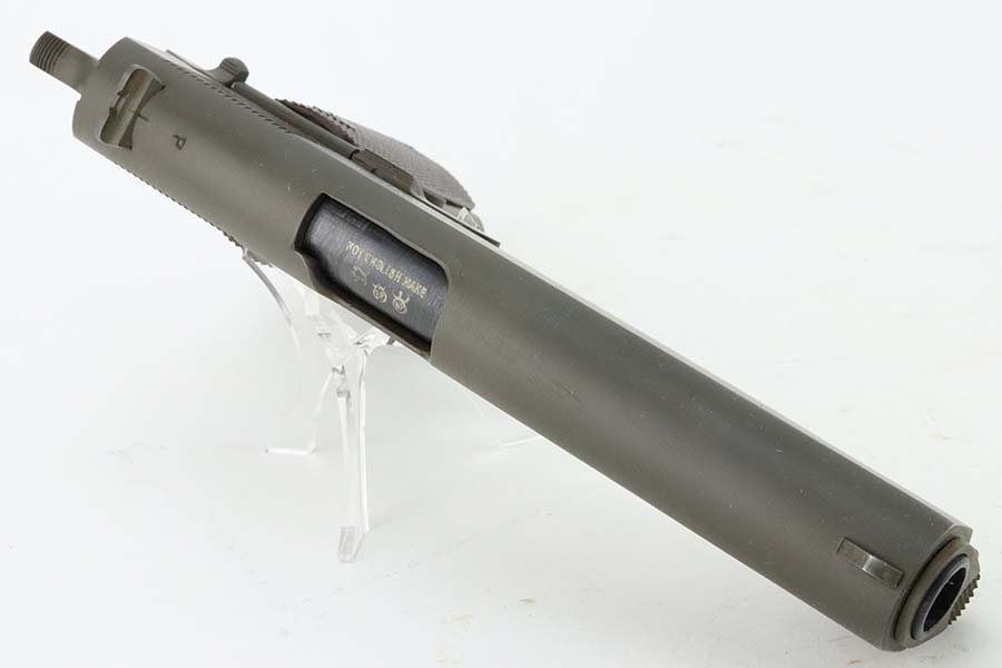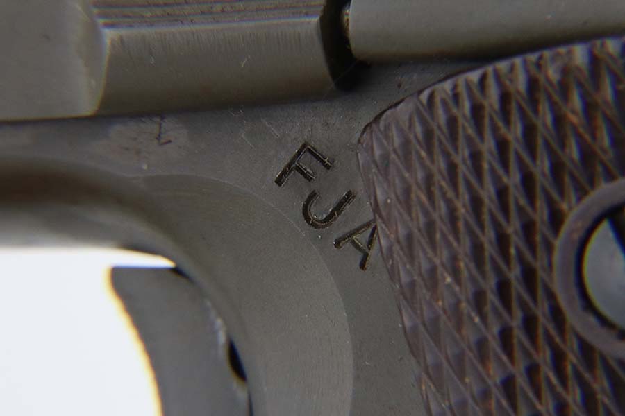 3/28/24 – This is an excellent example of an Ithaca Model 1911A1 issued to the US military in 1943. British proofs on the slide, frame, and barrel. High Standard barrel. The entire gun has been arsenal reworked and refinished. The finish is now beautiful with no signs of wear or use. Fitted with period-correct reddish plastic grips and comes with a proper “S” marked magazine. Mint bore.