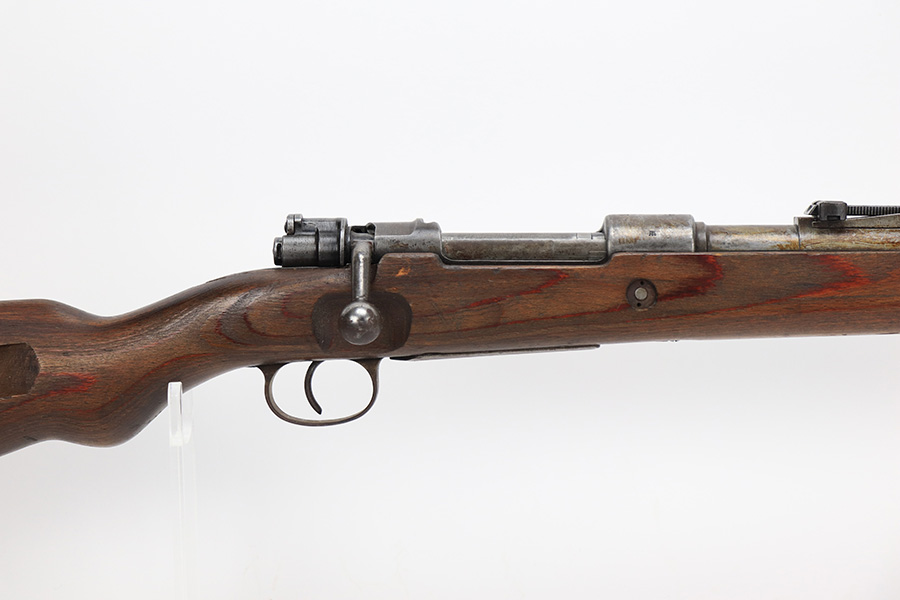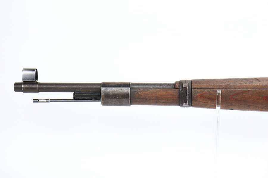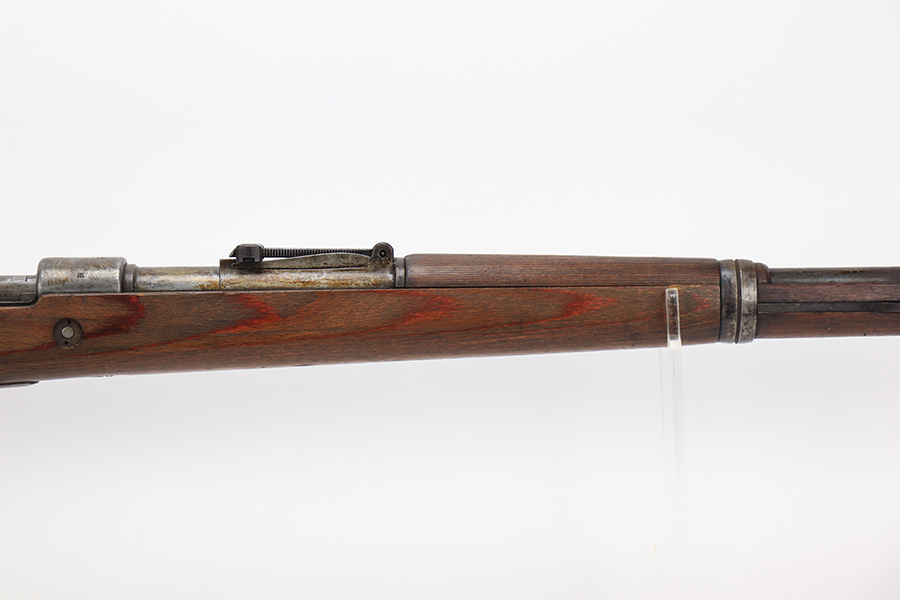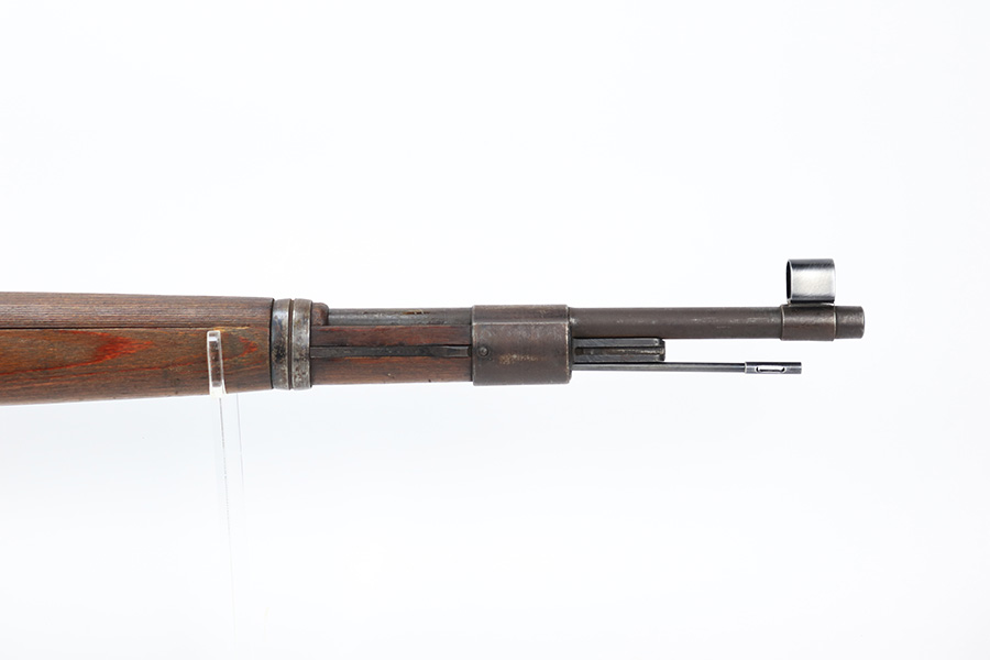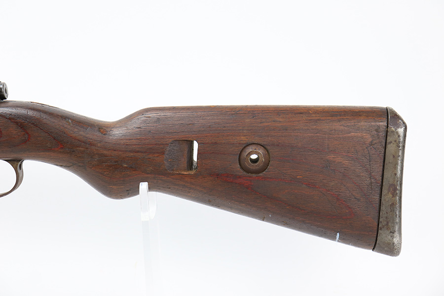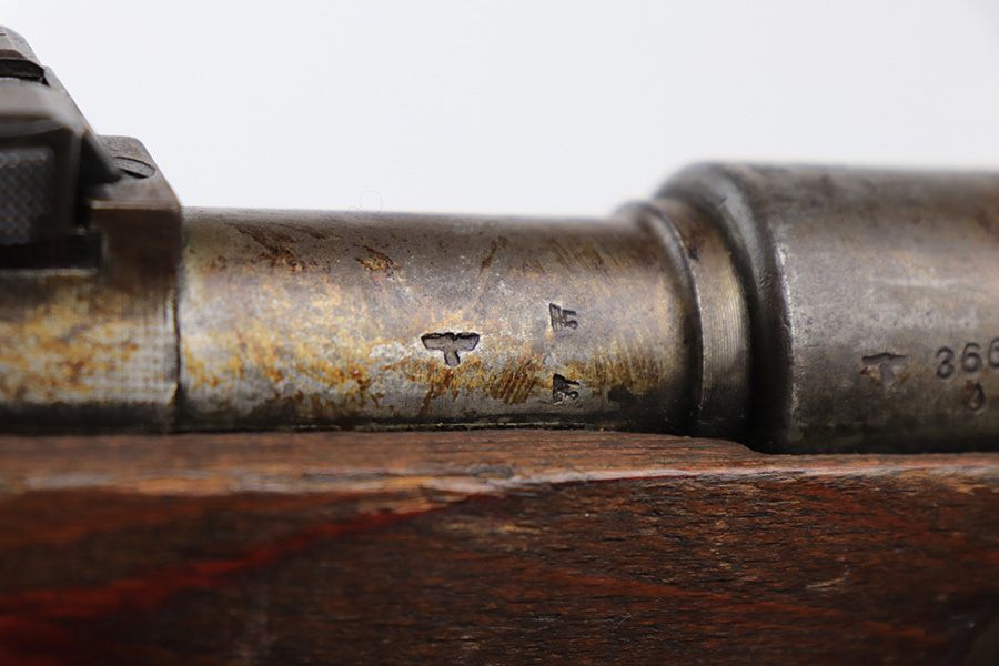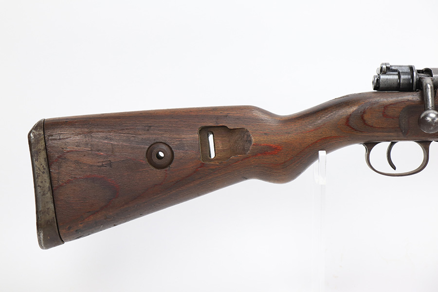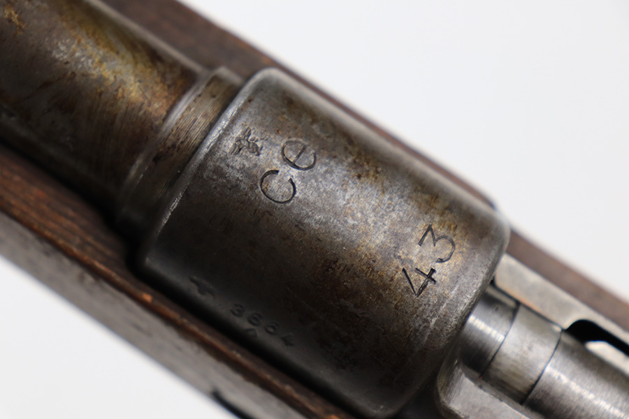 5/11/23 – This is a nice example of a “CE Code” JP Sauer K98 issued to the Nazi military in 1943. The gun is all matching except for the bolt, which is mismatched. Proper waffen military proofs throughout. The metal parts have lost nearly all of their finish with obvious splotchy discoloration and brown patina throughout. The patina is heaviest on the front portion of the barrel, on the barrel bands, and on the floor plate / trigger group. The wood furniture has no major damage, but there are obvious signs of use throughout. It has a correct “Eagle H” marking on the right side of the butt stock. Surprisingly enough, the bore is mint.