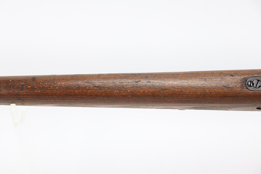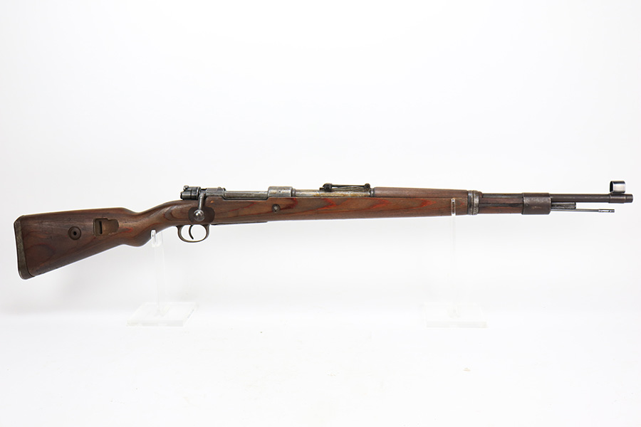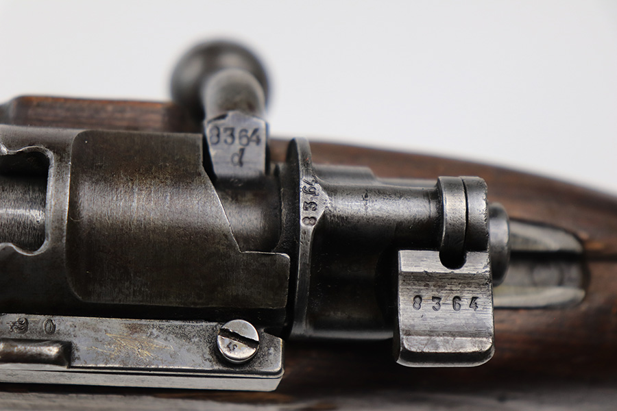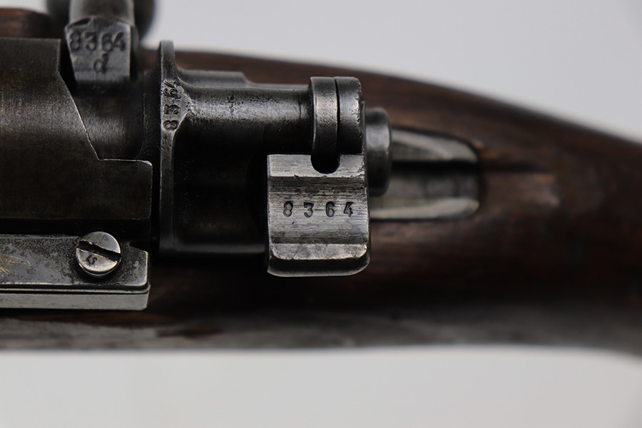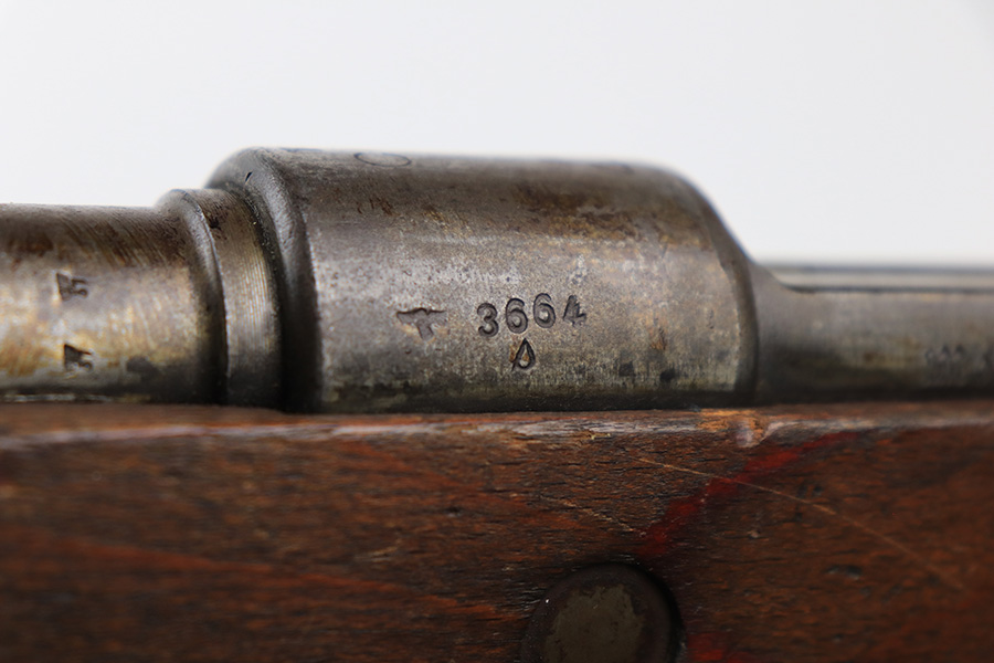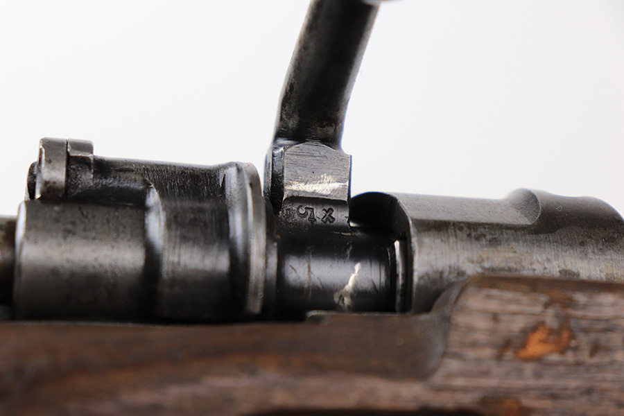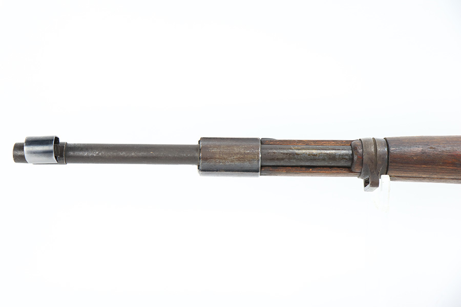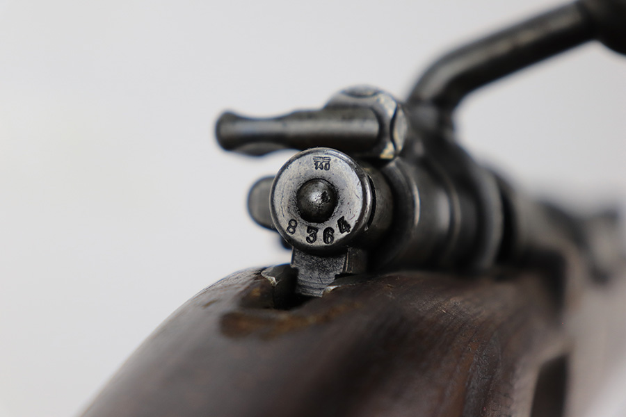 5/11/23 – This is a nice example of a “CE Code” JP Sauer K98 issued to the Nazi military in 1943. The gun is all matching except for the bolt, which is mismatched. Proper waffen military proofs throughout. The metal parts have lost nearly all of their finish with obvious splotchy discoloration and brown patina throughout. The patina is heaviest on the front portion of the barrel, on the barrel bands, and on the floor plate / trigger group. The wood furniture has no major damage, but there are obvious signs of use throughout. It has a correct “Eagle H” marking on the right side of the butt stock. Surprisingly enough, the bore is mint.