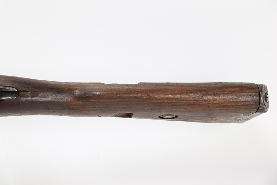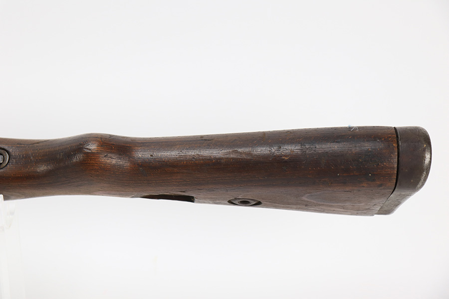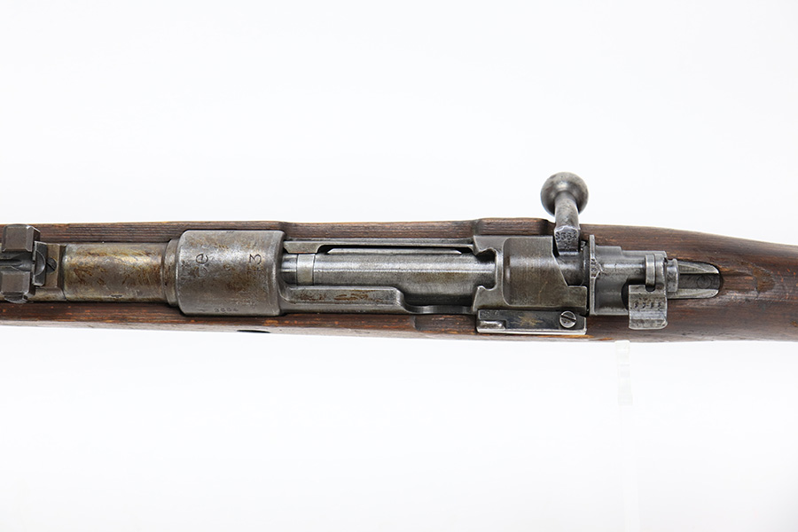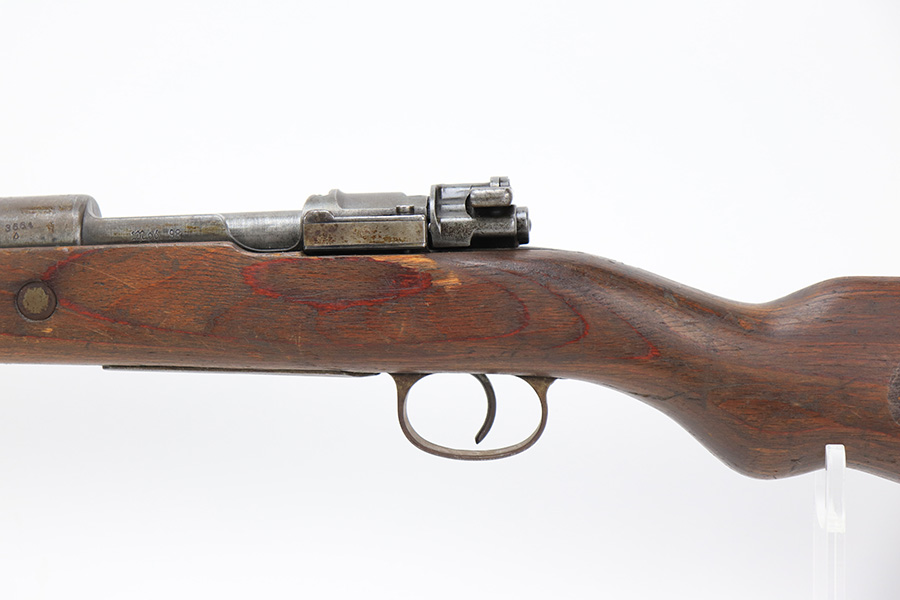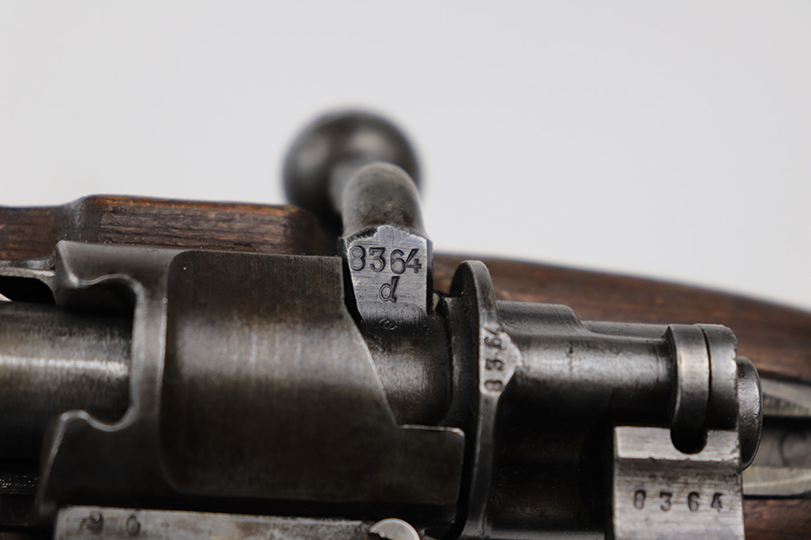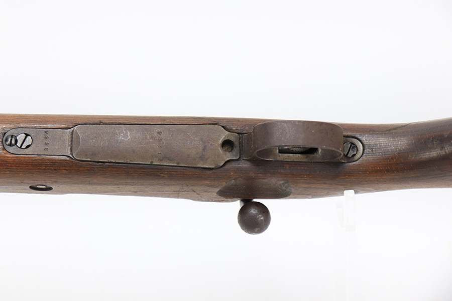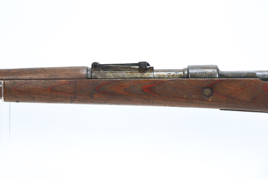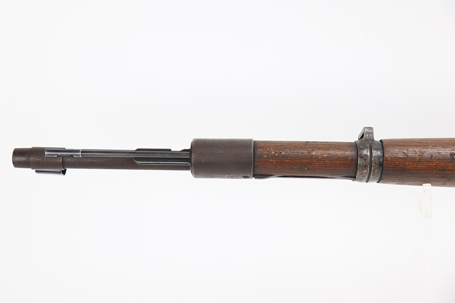 5/11/23 – This is a nice example of a “CE Code” JP Sauer K98 issued to the Nazi military in 1943. The gun is all matching except for the bolt, which is mismatched. Proper waffen military proofs throughout. The metal parts have lost nearly all of their finish with obvious splotchy discoloration and brown patina throughout. The patina is heaviest on the front portion of the barrel, on the barrel bands, and on the floor plate / trigger group. The wood furniture has no major damage, but there are obvious signs of use throughout. It has a correct “Eagle H” marking on the right side of the butt stock. Surprisingly enough, the bore is mint.