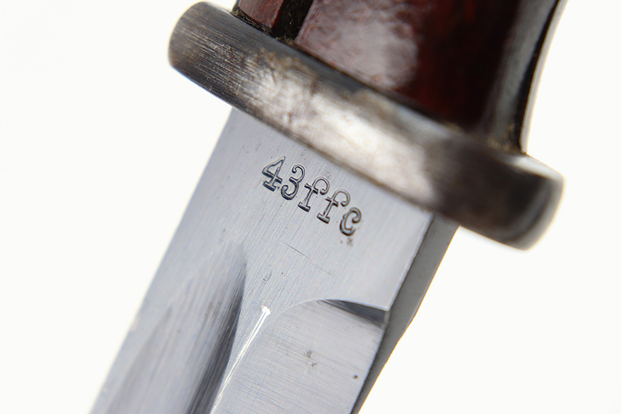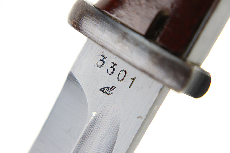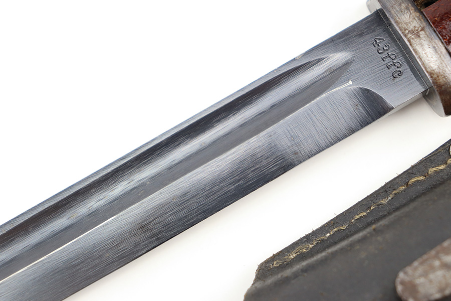 11/27/23 – This is an original 1943 production German K98 rifle bayonet. The bayonet comes with an original matching numbered scabbard with an attached leather frog. The bayonet blade is in great shape with most of the blued finish still intact. No signs of sharpening along the edge and some light scabbard rub wear. Serial numbered and maker stamped on the base of the blade. The handle is excellent and original with no cracks or chips. Some light patina and spotty discoloration on the pommel. The scabbard has most of the finish missing and has surface patina throughout. Serial numbered near the mouth. The frog is in great overall condition as well with no visible markings. All original leather and stitching.