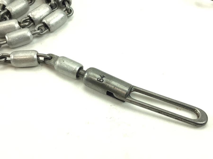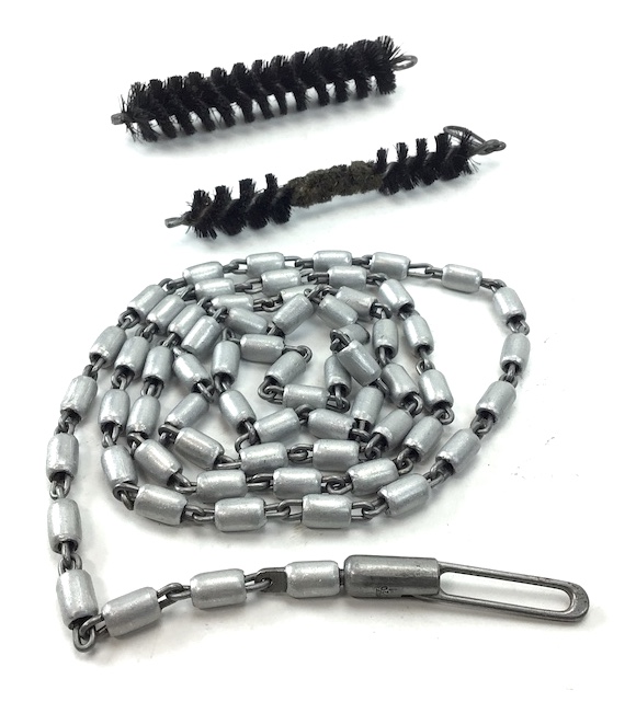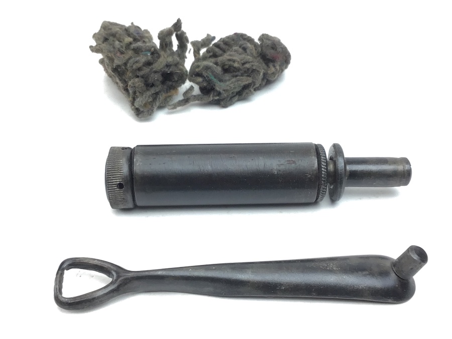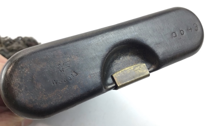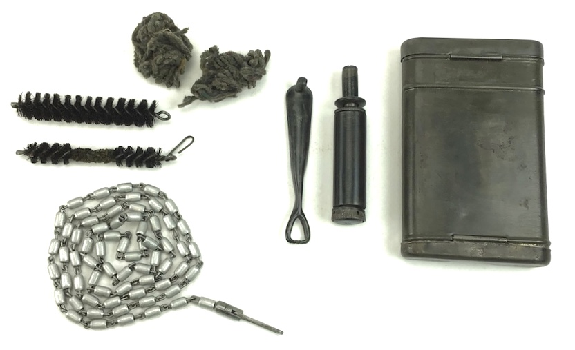 6/4/21 – Original and excellent condition cleaning kit for the Mauser K98 8mm rifle. Maker name, date and waffen military stamp on the lid. “ab 43” along with WaA313. The pull through chain is also waffen stamped with the numerals “64”. The tin has typical paint loss. The lids and clasps function properly. Nice kit.