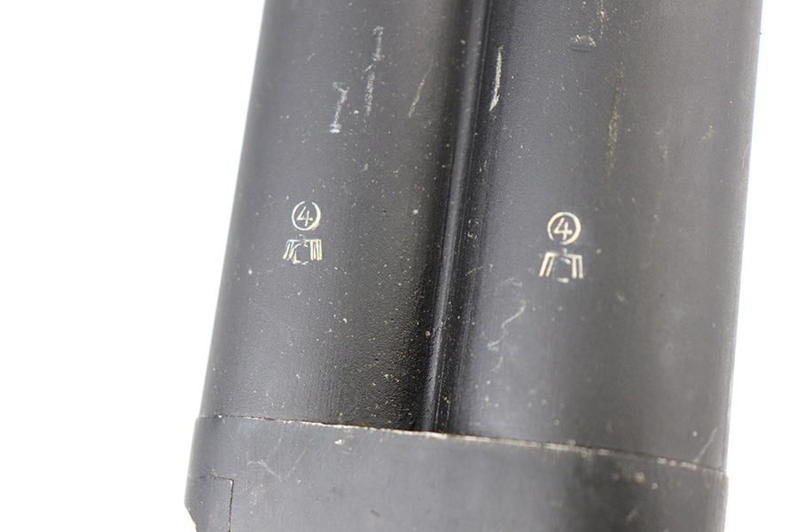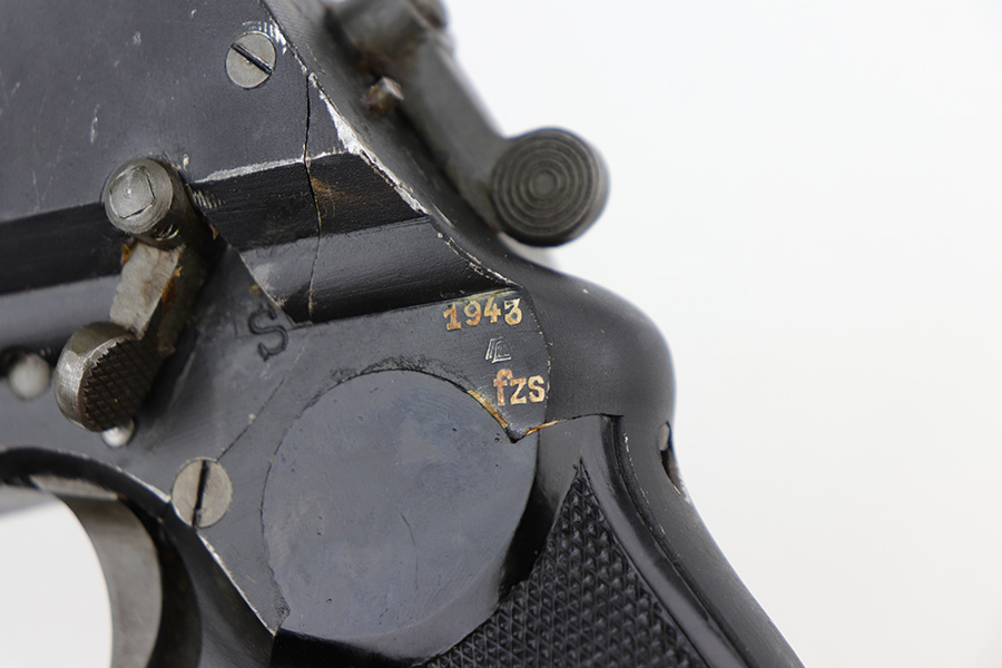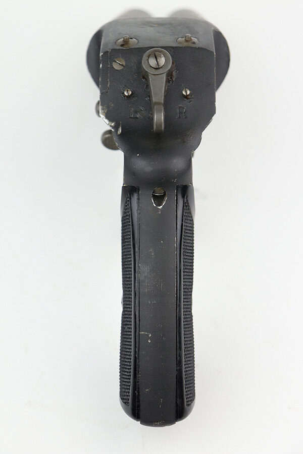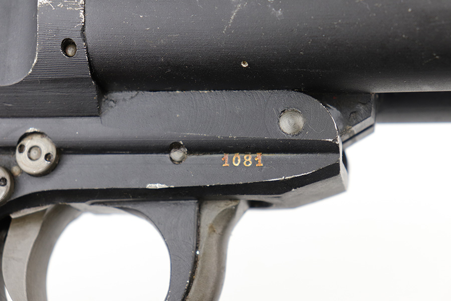 9/30/21 – This is an excellent condition example of the Luftwaffe Flieger-Leuchtpistole L or Aviators Flare Gun L. These double-barreled, 26.5mm (4 Bore) signal pistols were issued to Luftwaffe aircrews in order to give them a method of communication that did not rely on their radio transmitters. This pistol is marked with the maker code fzs, the code assigned to the extremely famous Krieghoff firearms company Ulm, Germany. The ordnance code is located under the date 1943 to the rear of the safety lever on the left side of the frame. The tops of the barrels are both marked with a 4 in a circle (4-Bore) over the Luftwaffe Stick Eagle acceptance mark. This same proof appears on the rear of the receiver between the L and R barrel selector marks, and is covered when the selector switch is in the middle or “both barrels” position. The gun has retained most of its finish with minor scuffs, scratches, and dings here and there. Comes with excellent black bakelite grips. The bores are very nice but have some heavy grease that could use a good cleaning.