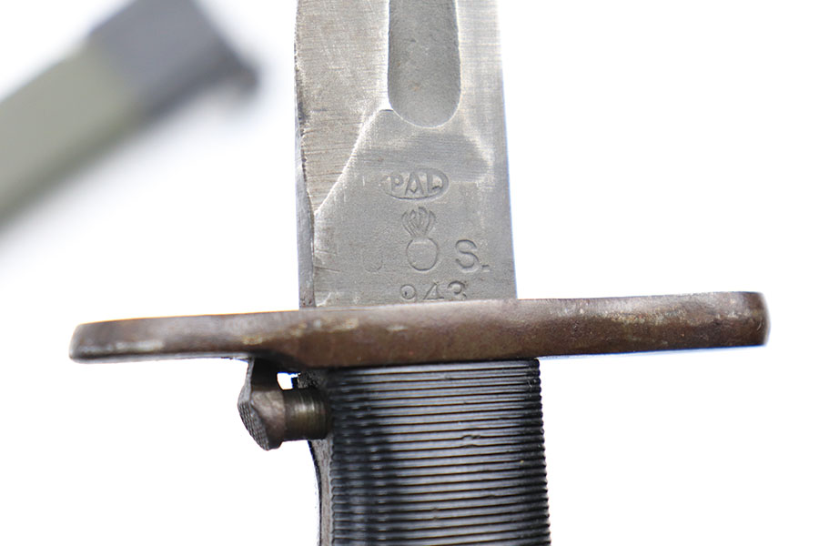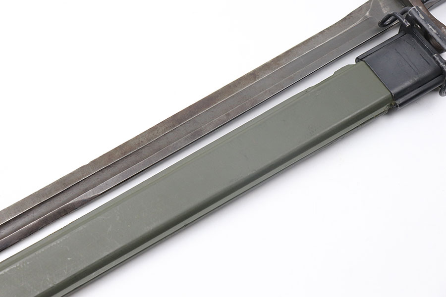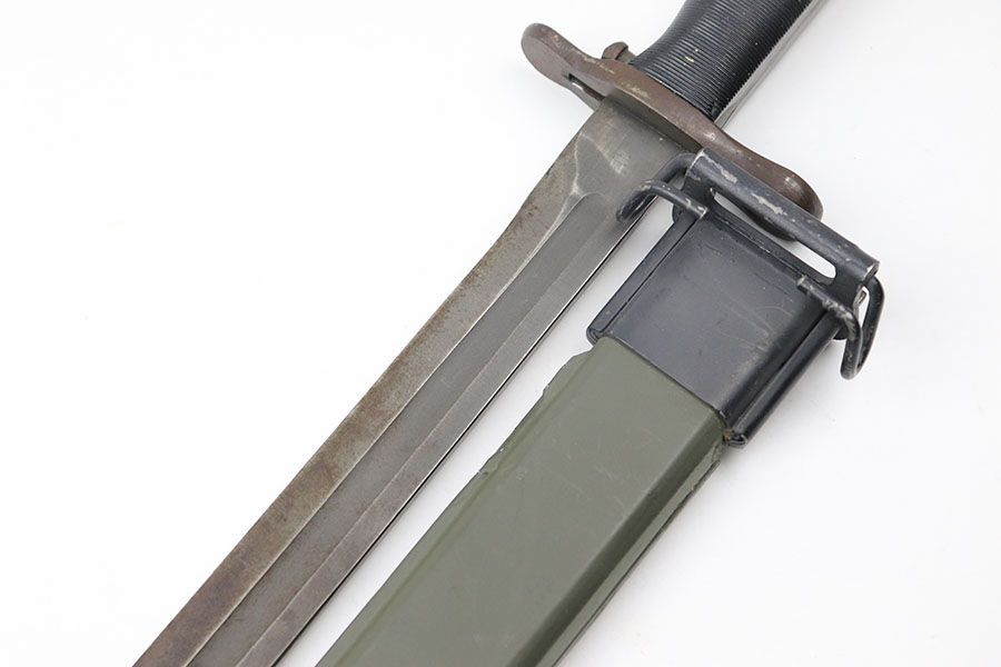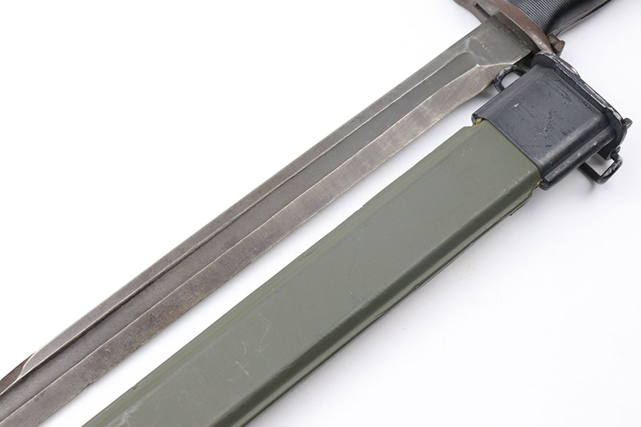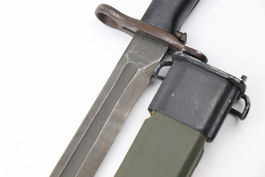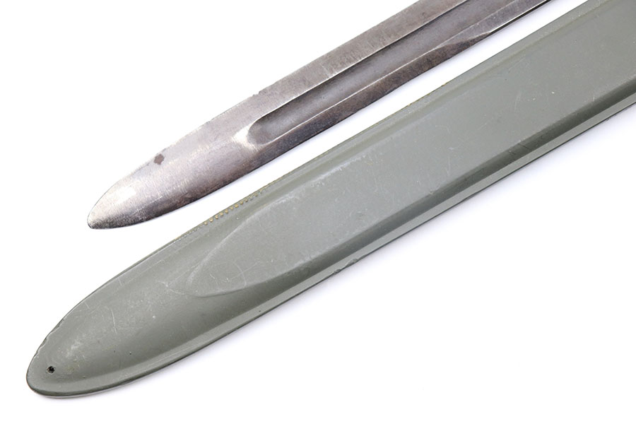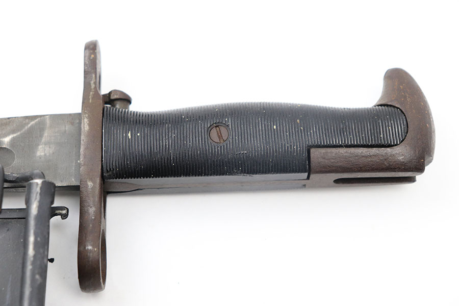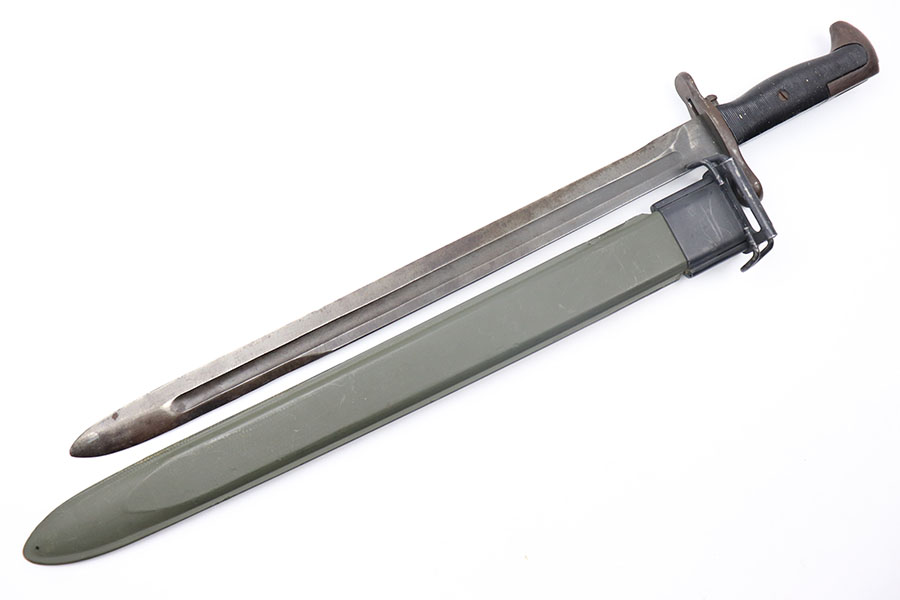 11/5/21 – This is an uncut WW2 M1 Garand bayonet. The bayonet blade is about 16 inches. There is patina and dark discoloration throughout, as well as a few small nicks in the edge from previous use on the blade. Maker stamped, dated, and ordnance stamped on the base of the blade. The handle has no cracks or chips. Comes with an original US Scabbard.