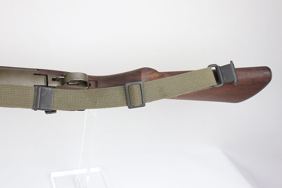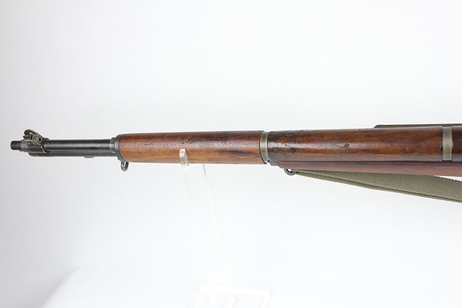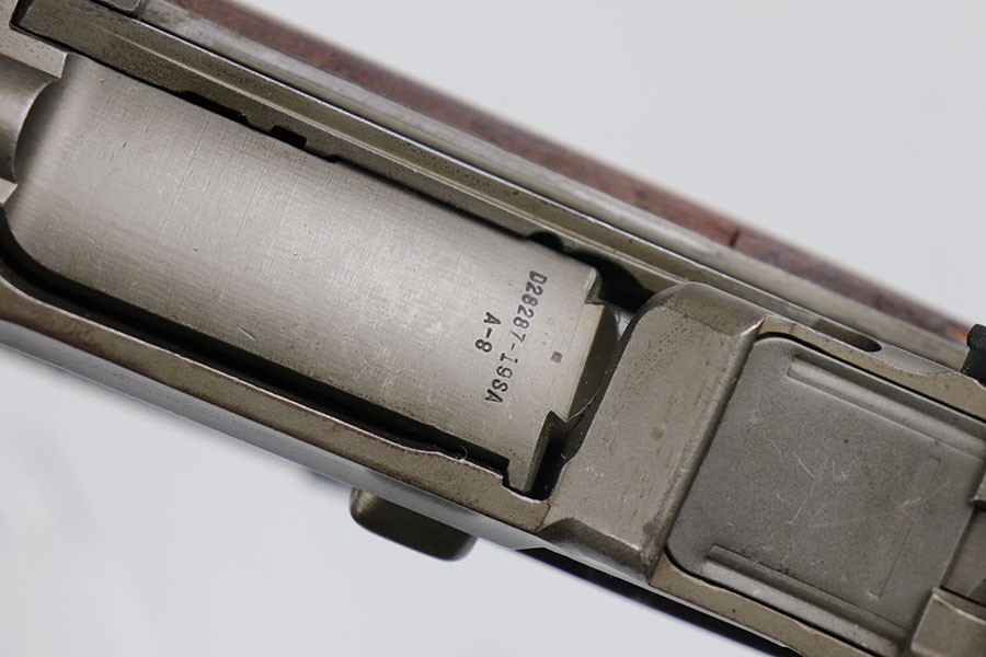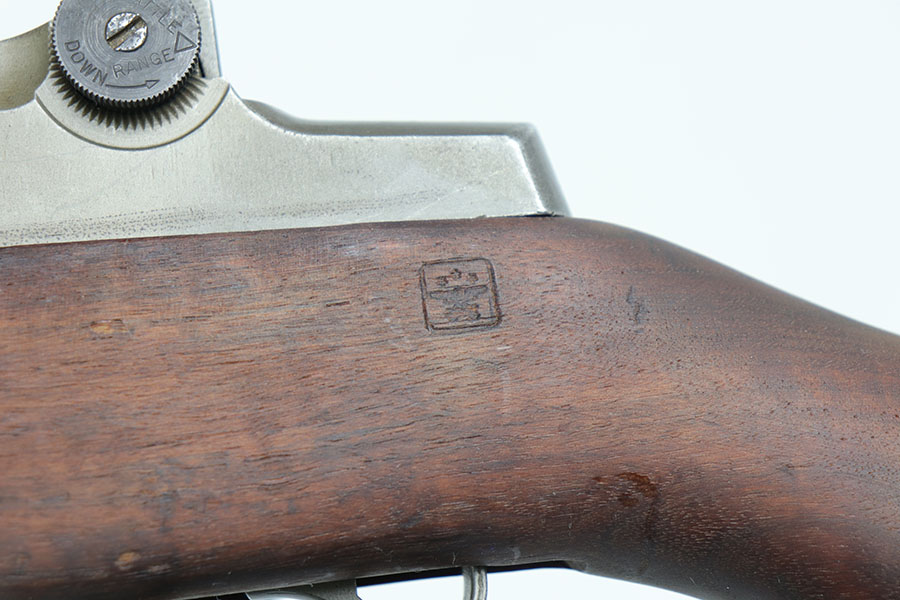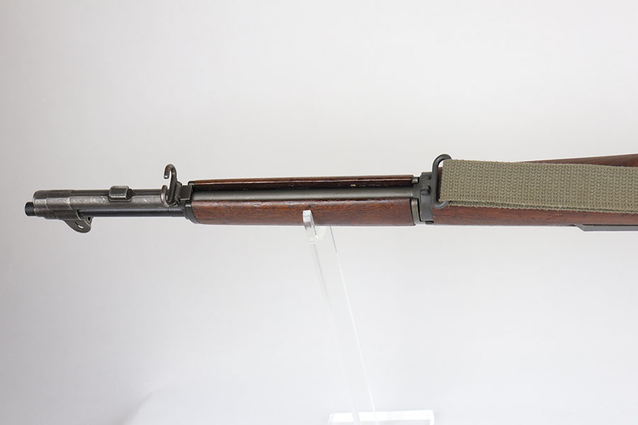 6/16/20 – This is an original 1943 production M1 Garand rifle. The rifle has a U.S. department of defense stamped stock, as shown by the eagle with 3 stars cartouche on the left side of the wood. This replacement would have been done as part of the Dept of Defense in the 1950s. The metal is all original though and in great condition. There’s some very light edge discoloration on the receiver, and some minor finish loss near the muzzle, but no major issues nor any rust or pitting. Mechanically sound with a beautiful bore that rates 9/10. The metal overall rates around 95%, and the wood has very minimal wear as well. There is one very small crack where the forward-end of the receiver meets the upper hand guard. Otherwise, no major scratches, cracks, or chips. Comes with an unmarked canvas sling.