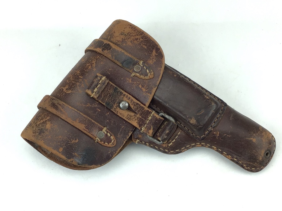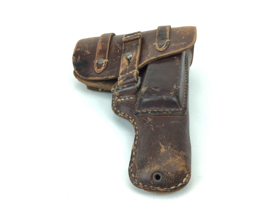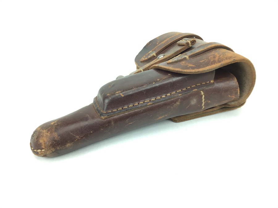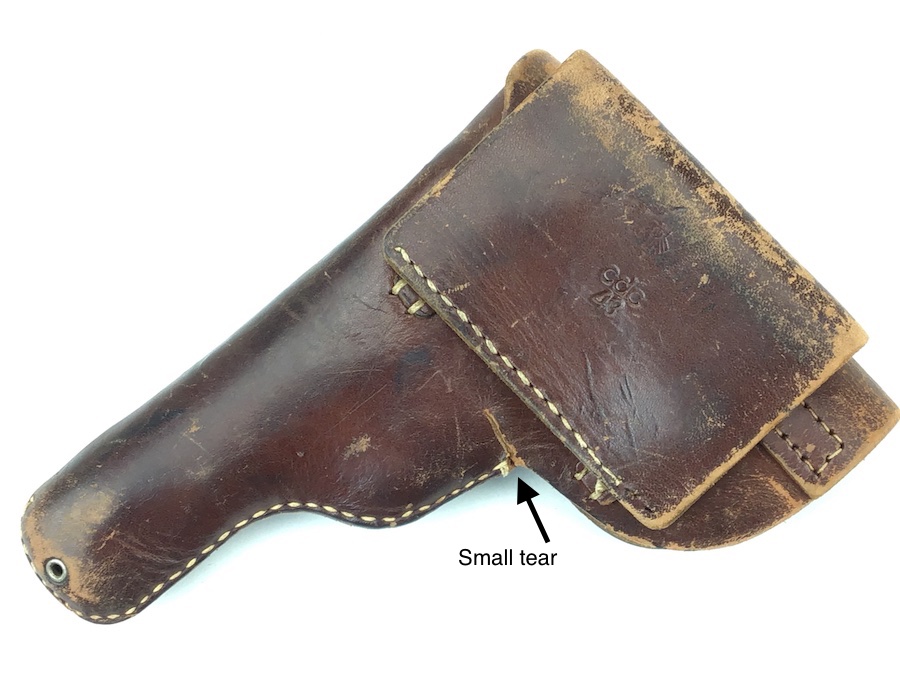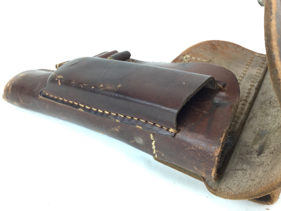 3/3/20 – Original Luftwaffe holster for the Femaru model 37. Maker stamped on the back along with the droop eagle 7 military stamp. Although faint, it is still visible. Leather is still strong, although it is showing signs of use wear. Stitching is intact and there is a small tear in the leather at the top of the left seam. (Marked in photos).