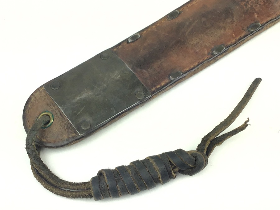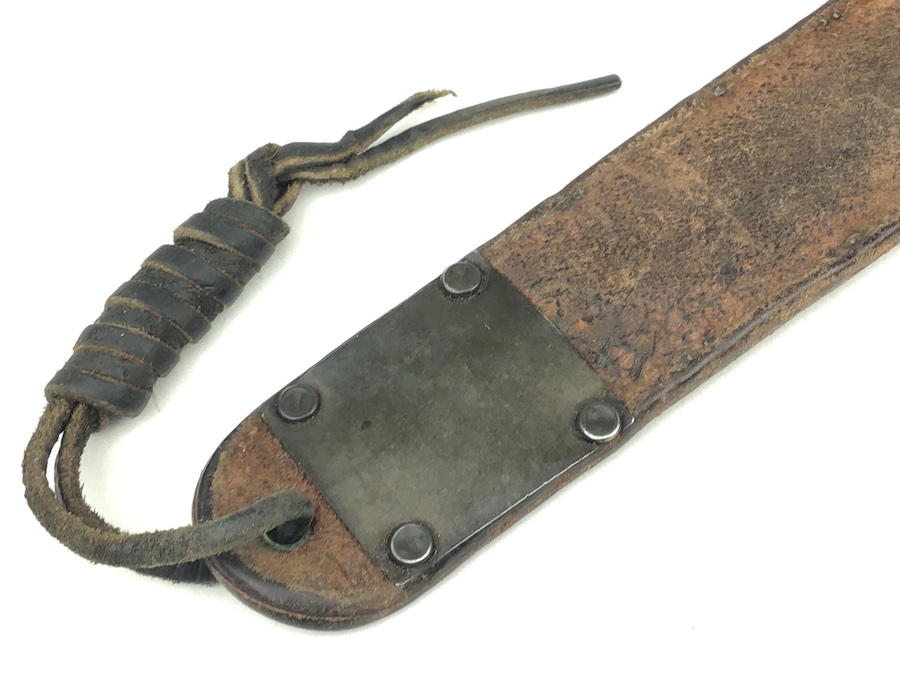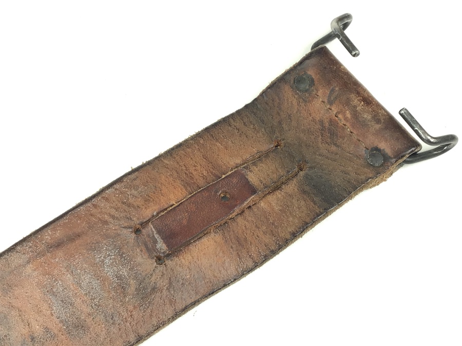 6/5/20 – Here is an original and scarce M6 leather scabbard with belt hooks. Stamped on the front “US M6 SBLCO 1943” Rivets and stitching all intact and secure. Intact leg lanyard. The only issue is a missing leather keeper loop.