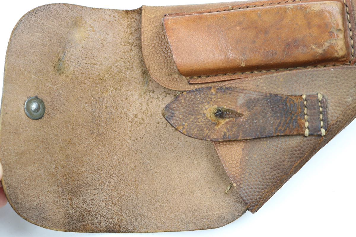 7/23/18 – This is an original WW2 production nazi pistol holster. Fits most 7.65mm axis pistols – but most popularly seen with the Mauser HSC (because of the wider toe). The leather is flattened and pliable – with some surface cracking on the exterior leather. Most of this is on the top leather and on the edge flap piece of leather (this is the piece the closure strap is attached to, attached to the main leather). The stitching is all in tact and original. The leather is all in tact but with some minor exterior wear. Interior leather is maker stamped and dated.