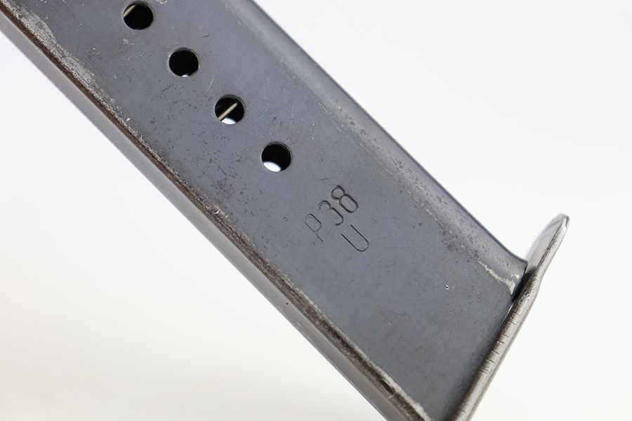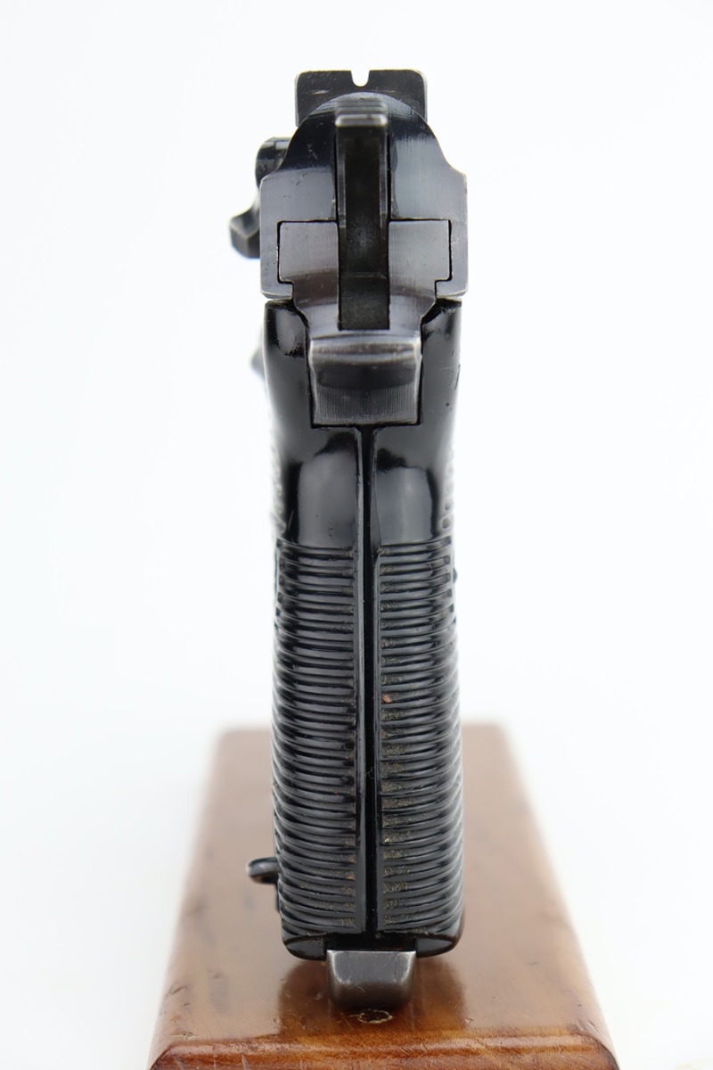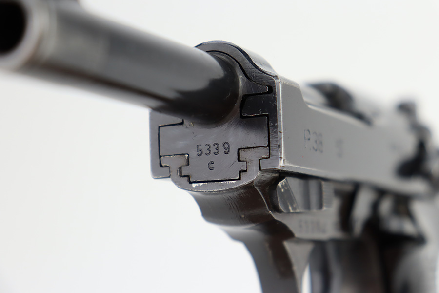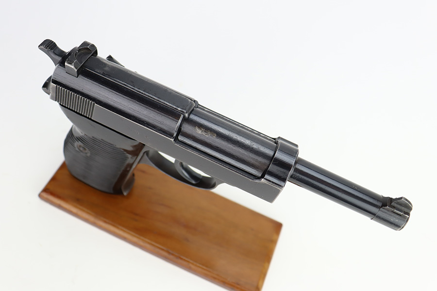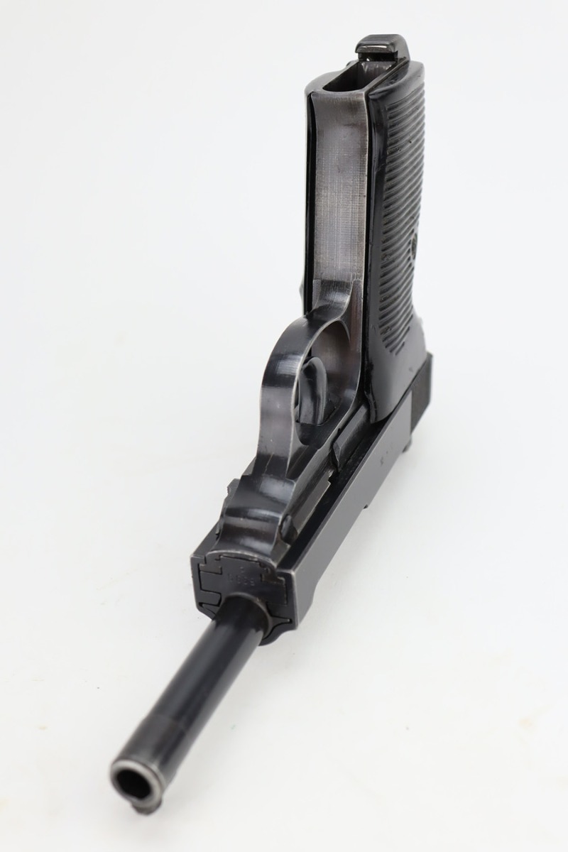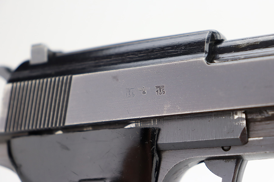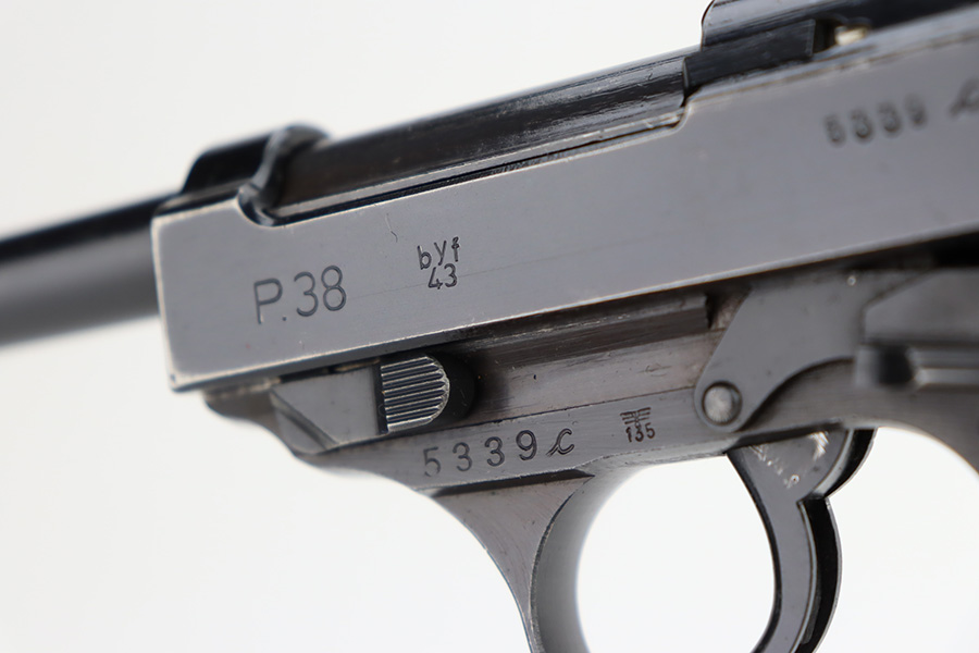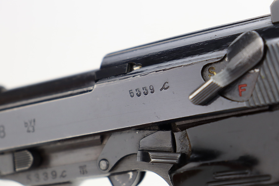 12/5/23 – This is a very nice BYF 43 Mauser P.38 issued to the German military in 1943. All matching with the proper “Eagle 135” military acceptance proofs. A hint of thinning on the front strap and minor wear around the muzzle and on the front edges of the slide. Fitted with black plastic grips – cut down along the top edges. Comes with a “U” marked magazine. Stone-mint bore. De-cocker is functional.