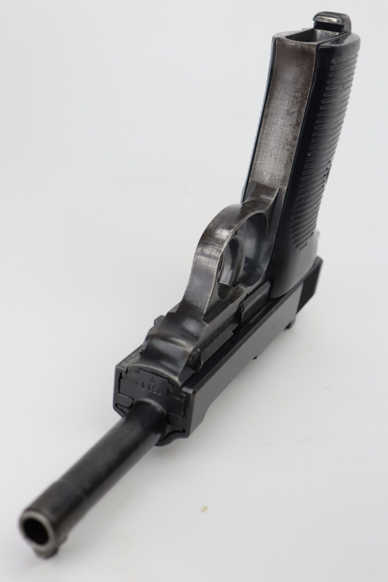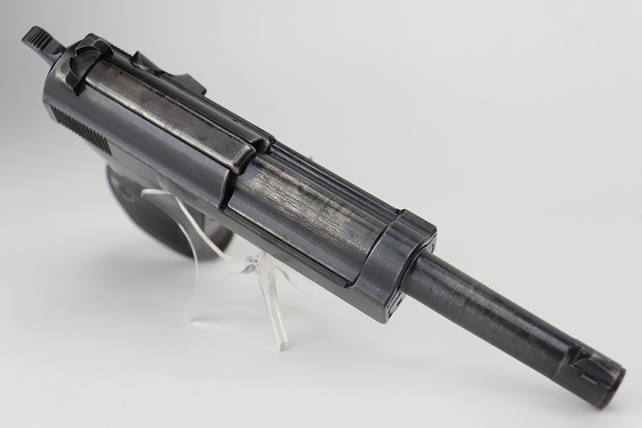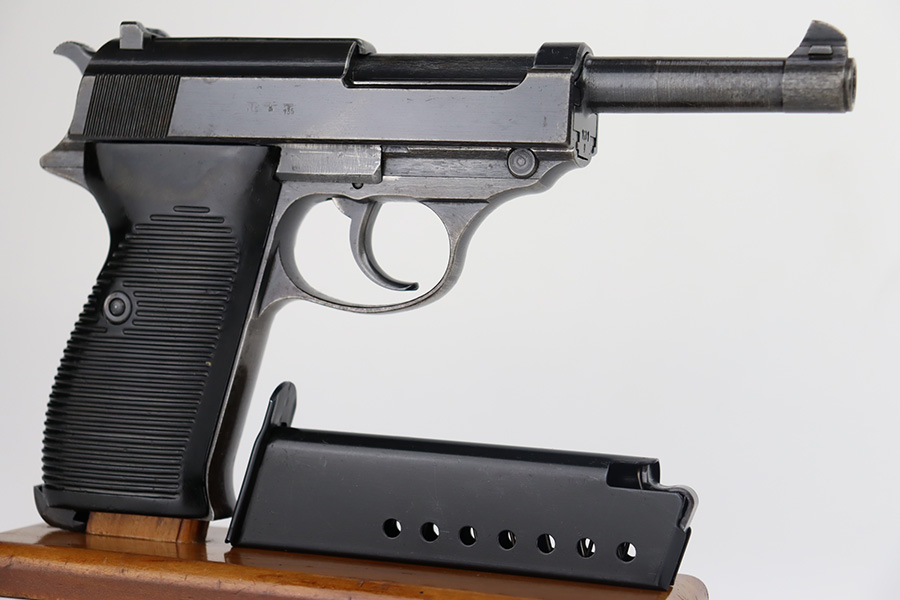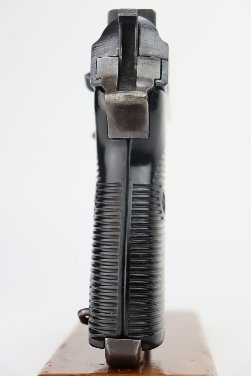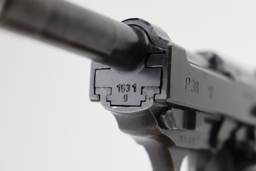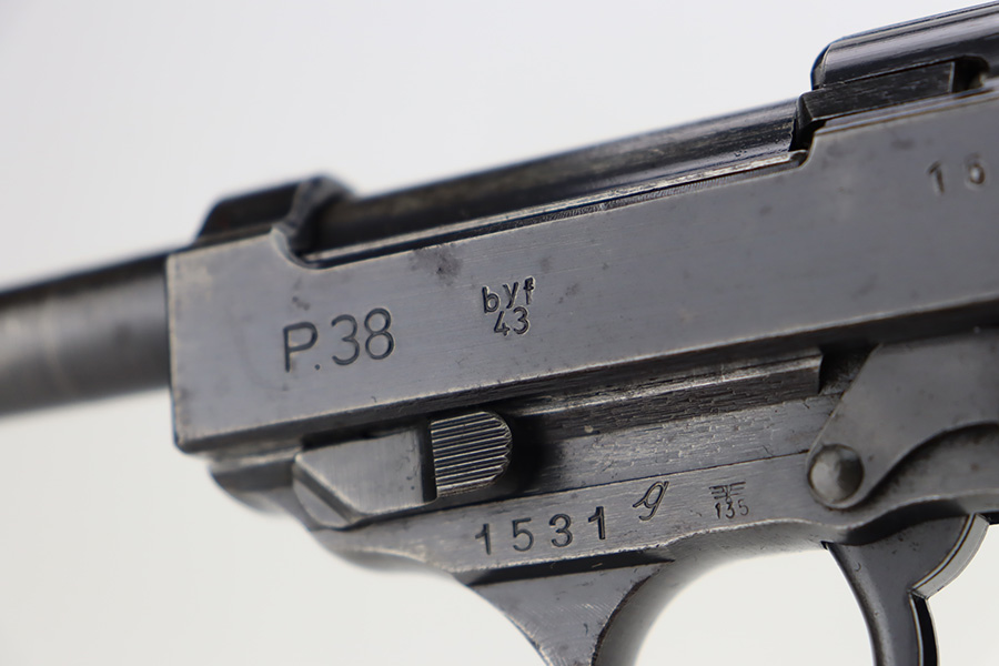 11/1/23 – This is a BYF 43 Mauser P.38 issued to the Nazi military in 1943. All matching with the proper “Eagle 135” military acceptance proofs throughout. It has retained roughly 80% of its original finish. There is thinning on the front strap and along the barrel. Minor general high edge wear. Some areas of spotty oxidation here and there, most noticeable on the front strap and along the barrel. Fitted with excellent period-correct bakelite grips and comes with a reproduction magazine. The bore has great rifling with pin-pricking throughout. De-cocker is functional.