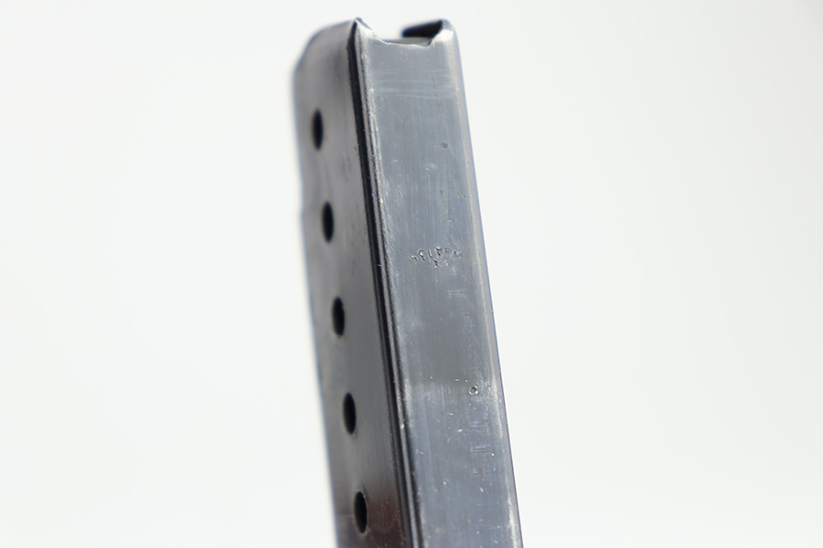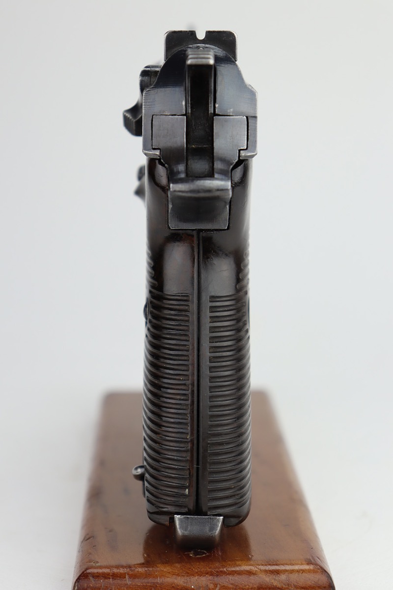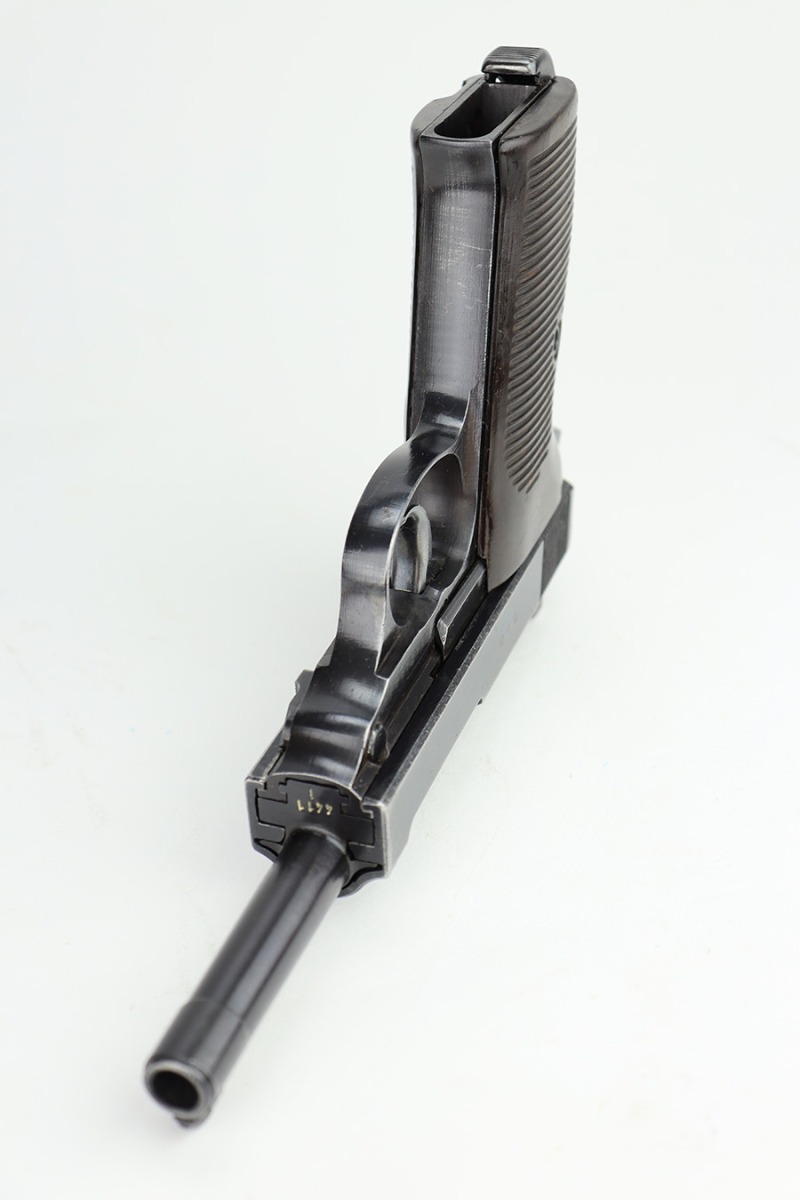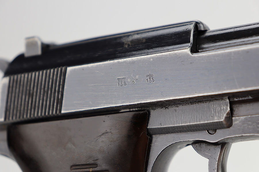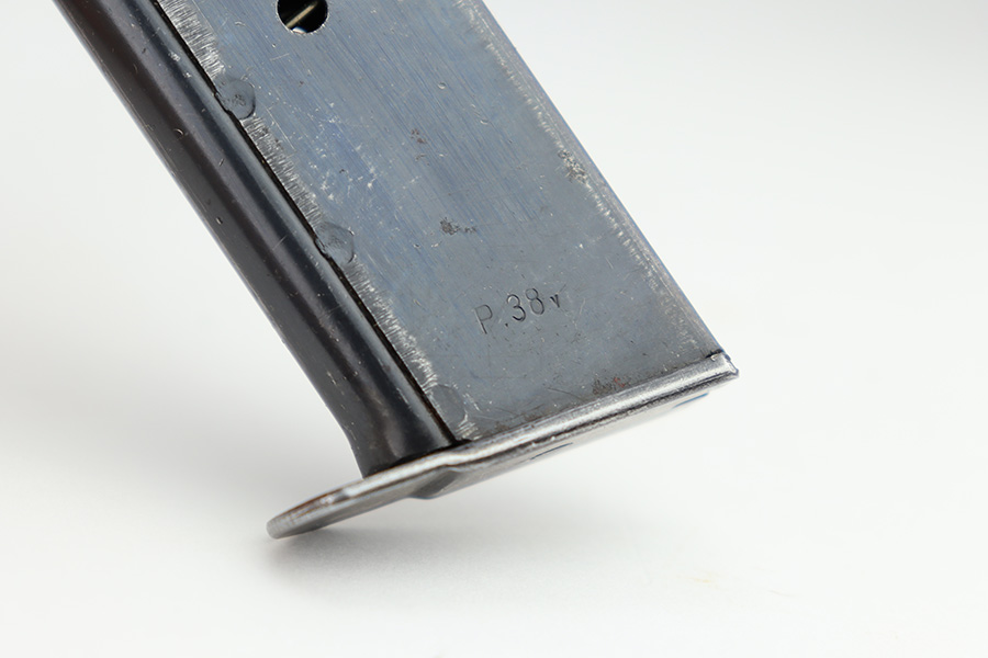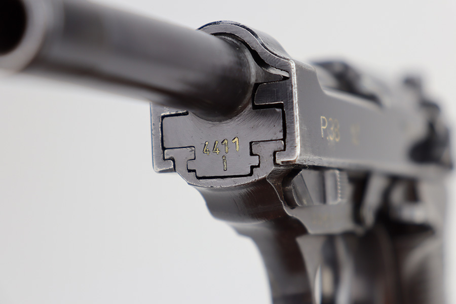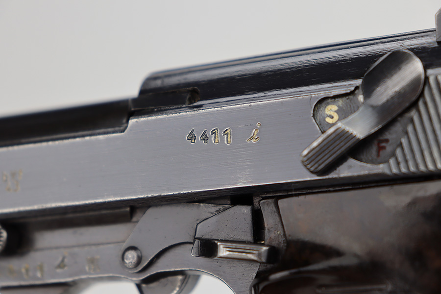 11/13/23 – This is a very nice example of a BYF 43 Mauser P.38 issued to the Nazi military in 1943. It is all matching and has the proper “Eagle 135” military acceptance proofs. It has retained about 94% of its original dusty-blue finish. Minor wear around the muzzle and on the high edges in general. Fitted with excellent period-correct blackish-brown bakelite grips and comes with one “Waffen 135” marked Mauser magazine. The bore has great rifling with minor frosting throughout. De-cocker is functional.