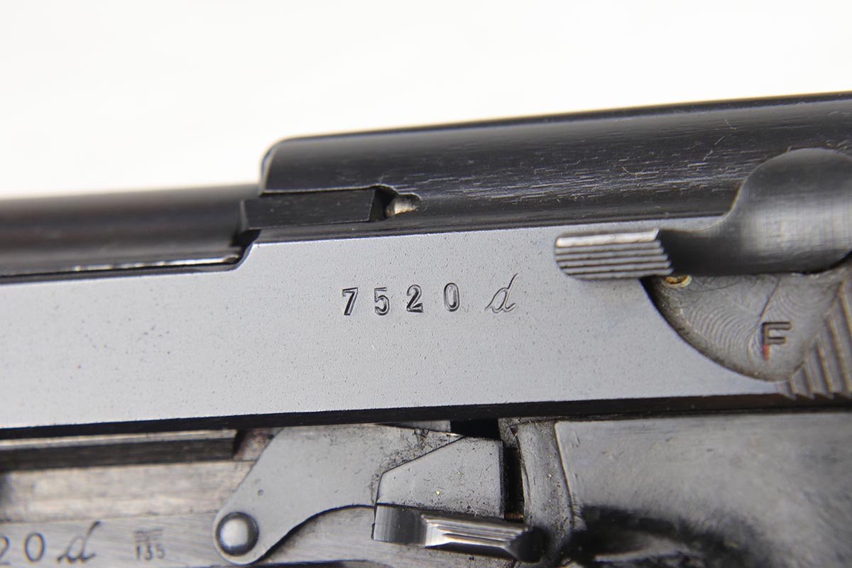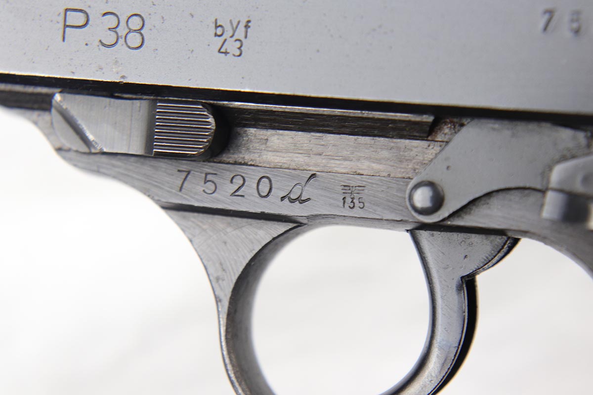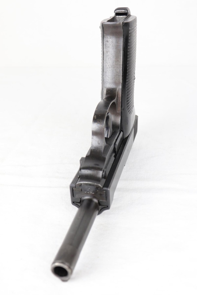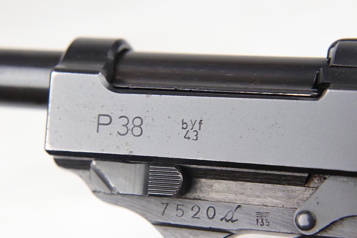 10/18/18 – This is a nice Nazi Mauser P.38 from 1943 with the earlier ‘dust blue’ style of bluing that was more commonly seen on the ‘byf 42’ Mauser P.38s. This gun is all matching and original with 93-94% dust blue remaining, showing minor wear on the left side barrel and some thinning of the front strap. Minty bore and nice grips.