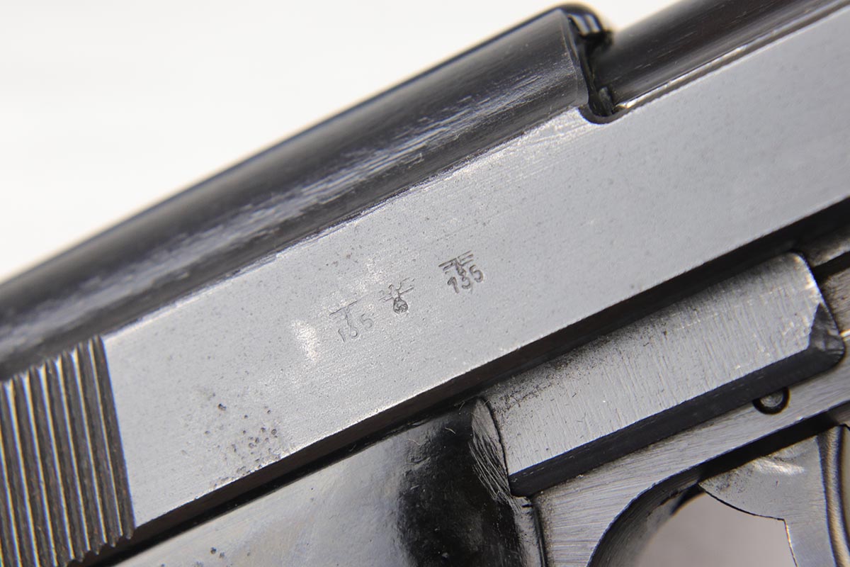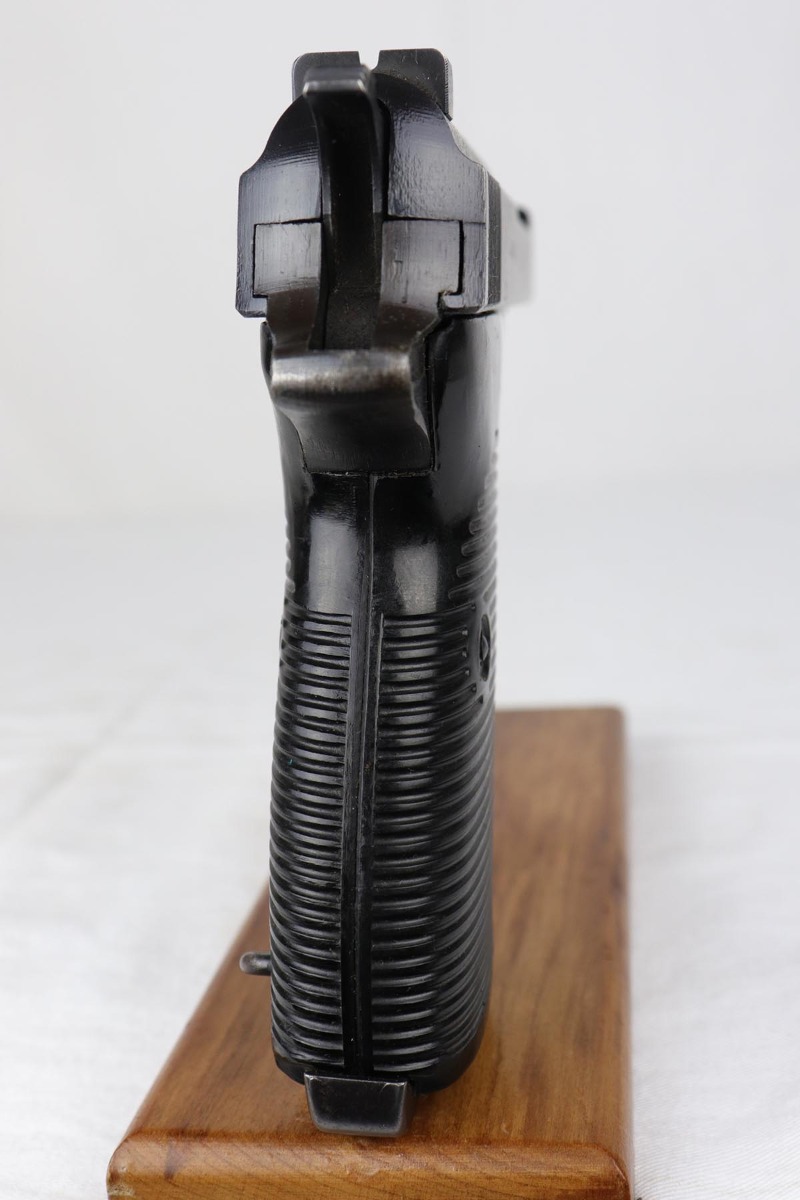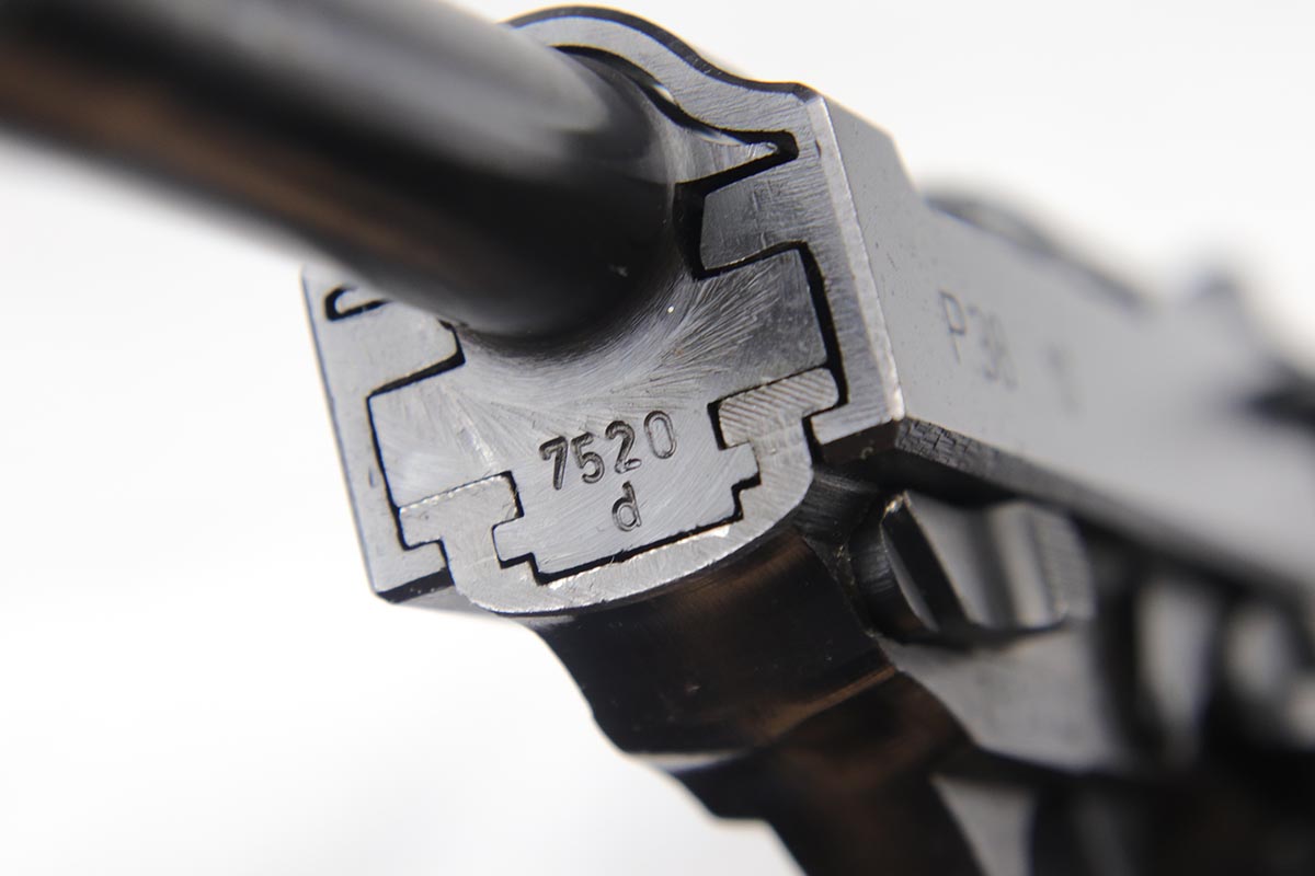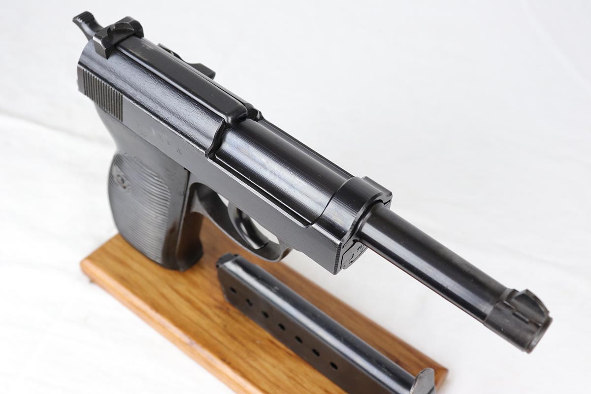 10/18/18 – This is a nice Nazi Mauser P.38 from 1943 with the earlier ‘dust blue’ style of bluing that was more commonly seen on the ‘byf 42’ Mauser P.38s. This gun is all matching and original with 93-94% dust blue remaining, showing minor wear on the left side barrel and some thinning of the front strap. Minty bore and nice grips.