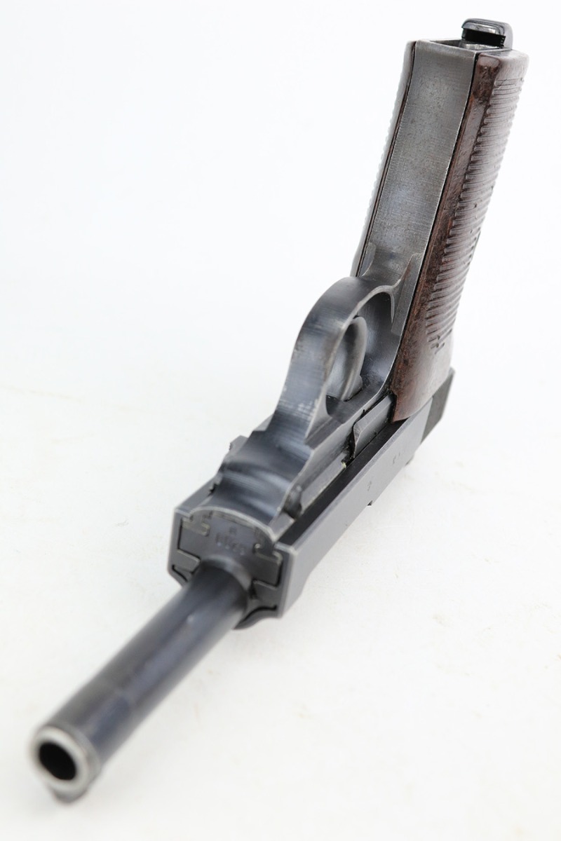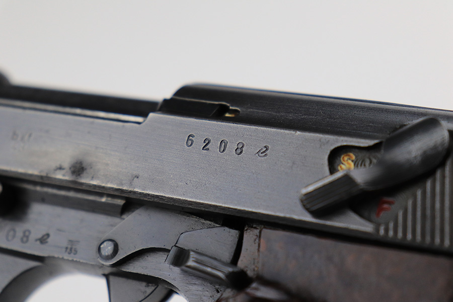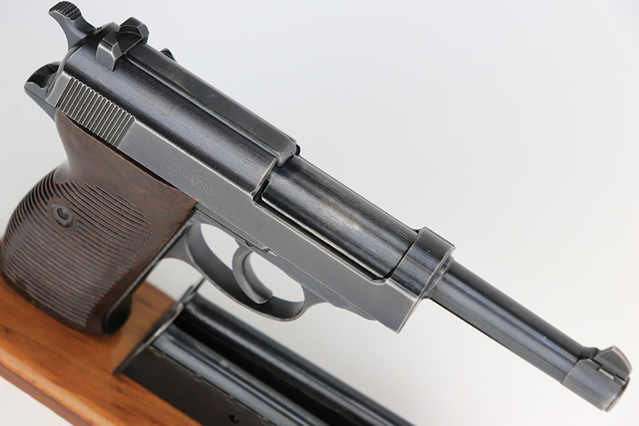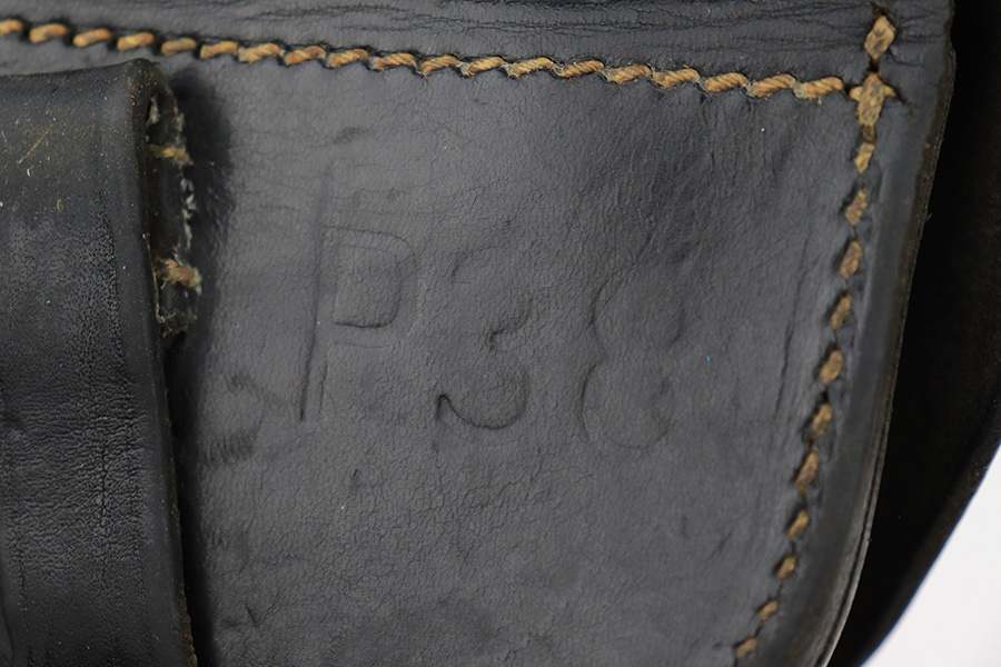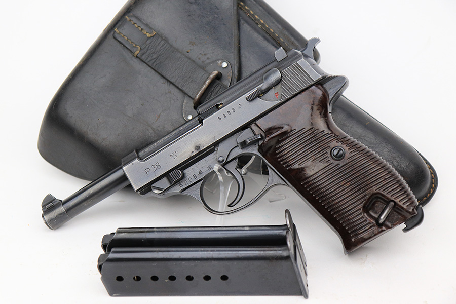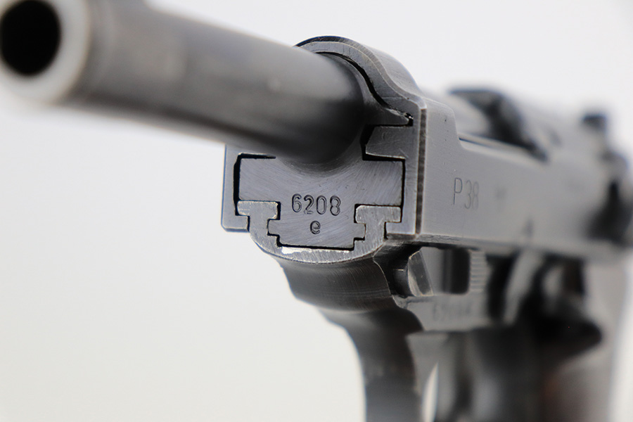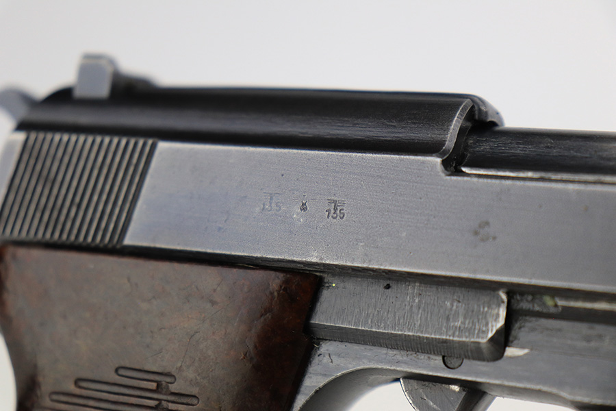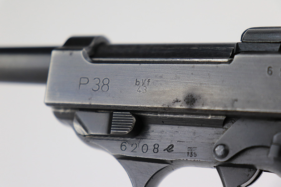 5/18/23 – This is a very nice example of a BYF 43 Mauser P.38 issued to the Nazi military in 1943. It is all matching and has the proper “Eagle 135” military acceptance proofs throughout. It comes as a rig with a very nice 1942-dated hard shell holster, one “Eagle 135” marked Mauser magazine, and one “Eagle 359” Walther magazine. The gun has retained about 94% of its dusty-blue finish, unique to the BYF 43’s. There is minor wear around the muzzle and on the high edges of the slide. Areas of minor wear on the top plate and on the top of the barrel through the ejection port. One small spot of minor pitting on the left side of the slide and light freckling on the front grip strap. Fitted with excellent reddish bakelite grips. Mint bore. De-cocker is functional.