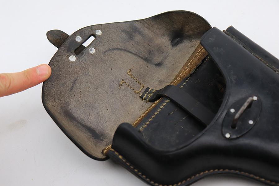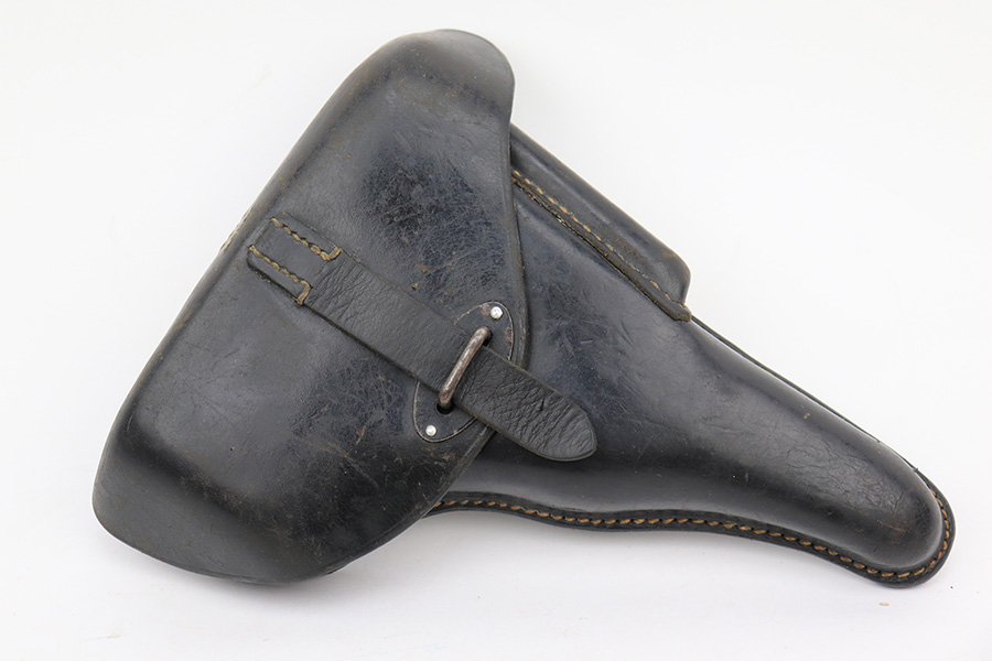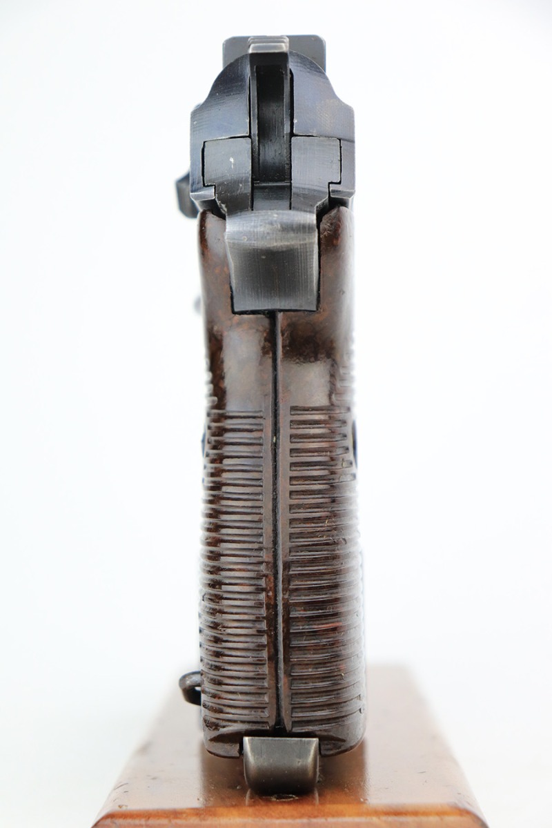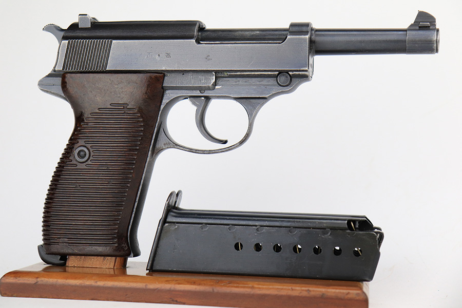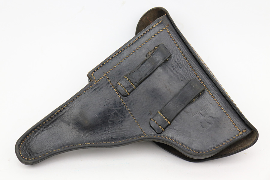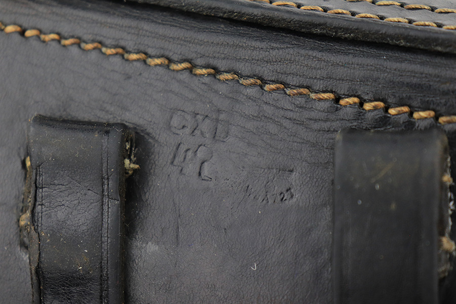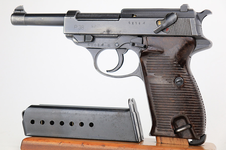 5/18/23 – This is a very nice example of a BYF 43 Mauser P.38 issued to the Nazi military in 1943. It is all matching and has the proper “Eagle 135” military acceptance proofs throughout. It comes as a rig with a very nice 1942-dated hard shell holster, one “Eagle 135” marked Mauser magazine, and one “Eagle 359” Walther magazine. The gun has retained about 94% of its dusty-blue finish, unique to the BYF 43’s. There is minor wear around the muzzle and on the high edges of the slide. Areas of minor wear on the top plate and on the top of the barrel through the ejection port. One small spot of minor pitting on the left side of the slide and light freckling on the front grip strap. Fitted with excellent reddish bakelite grips. Mint bore. De-cocker is functional.