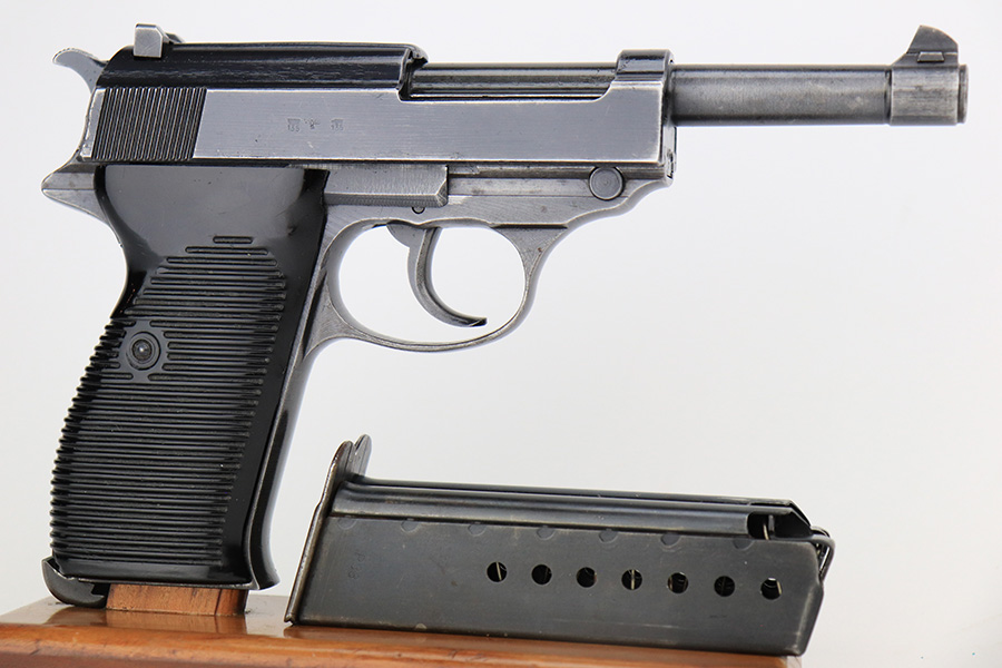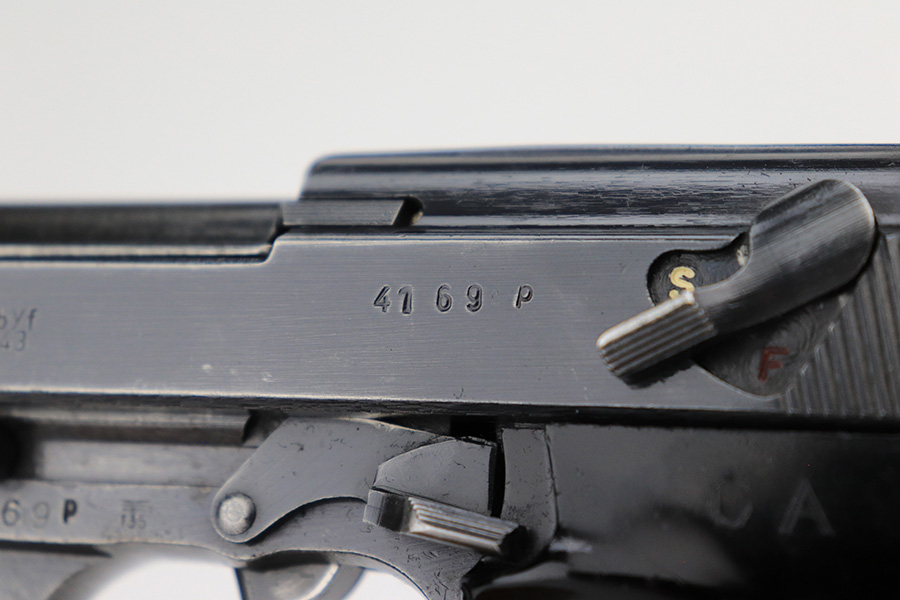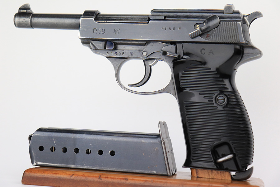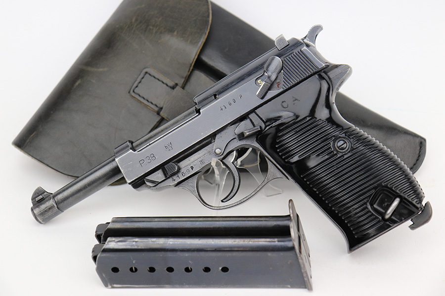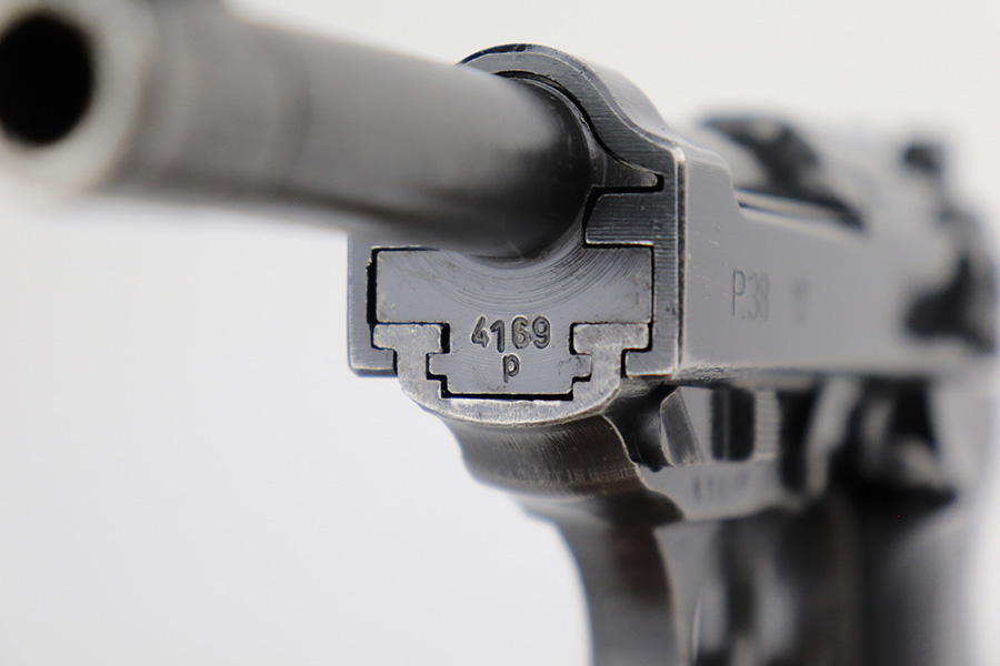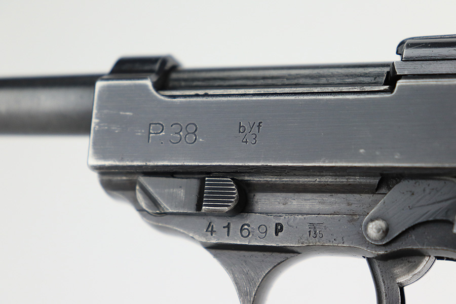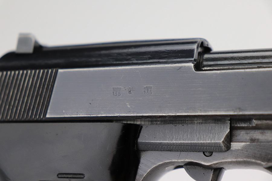 6/5/23 – This is a nice example of a BYF 43 Mauser P.38 issued to the Nazi military in 1943. It is all matching with the proper “Eagle 135” military acceptance proofs throughout. It comes as a rig with an “Eagle 135” marked Mauser magazine, an “Eagle 359” marked Walther magazine, and a nice reproduction holster. The gun itself has retained roughly 85% of its finish. The majority of the finish loss is on the front strap and along the barrel. There is also general minor high edge wear. Fitted with nice black plastic grips – the left side is slightly shaved and the initials “CA” are lightly scratched into it. The bore has great rifling, but there is very light pin-pricking throughout. De-cocker is functional.
