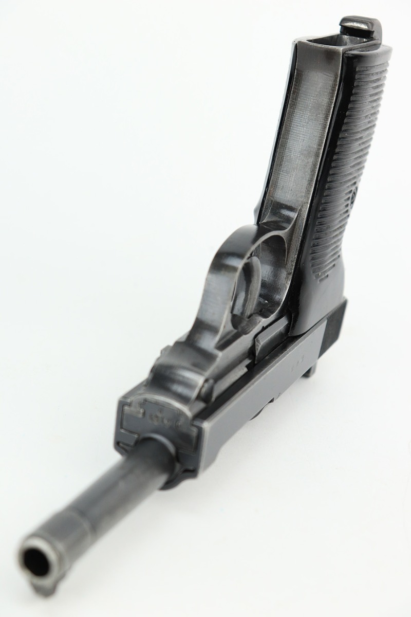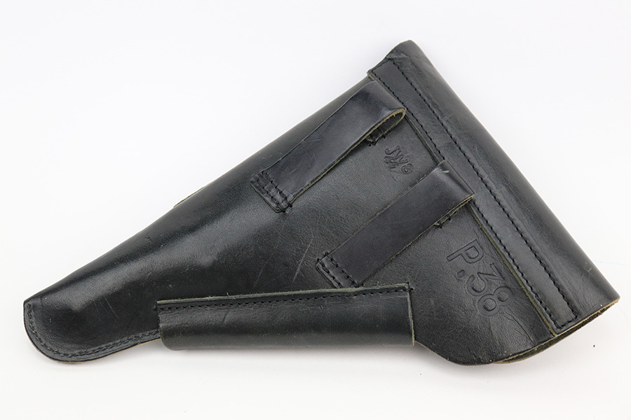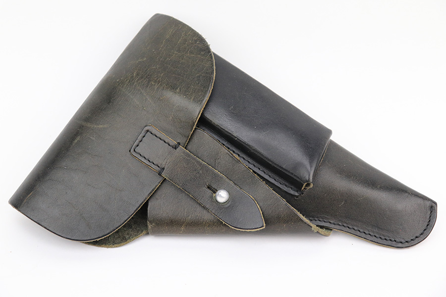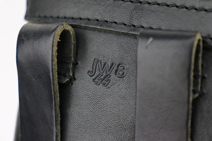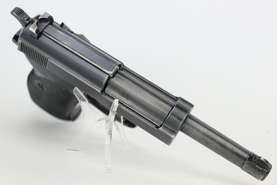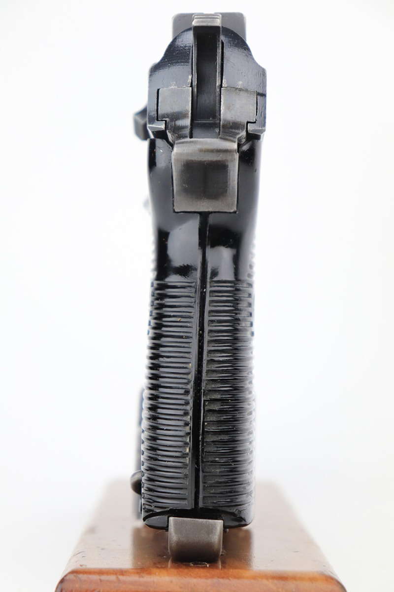 6/5/23 – This is a nice example of a BYF 43 Mauser P.38 issued to the Nazi military in 1943. It is all matching with the proper “Eagle 135” military acceptance proofs throughout. It comes as a rig with an “Eagle 135” marked Mauser magazine, an “Eagle 359” marked Walther magazine, and a nice reproduction holster. The gun itself has retained roughly 85% of its finish. The majority of the finish loss is on the front strap and along the barrel. There is also general minor high edge wear. Fitted with nice black plastic grips – the left side is slightly shaved and the initials “CA” are lightly scratched into it. The bore has great rifling, but there is very light pin-pricking throughout. De-cocker is functional.