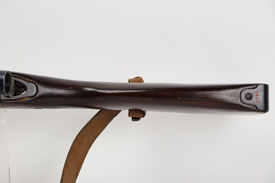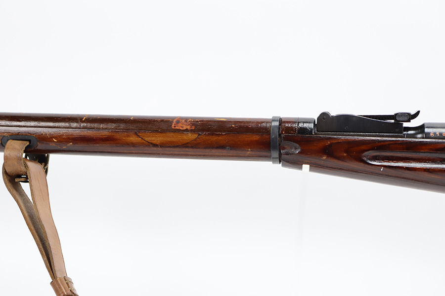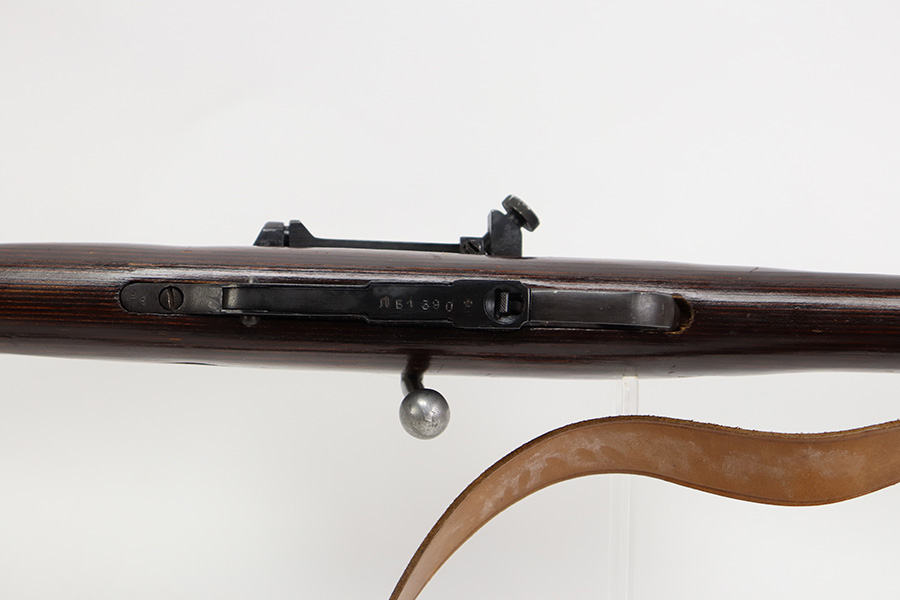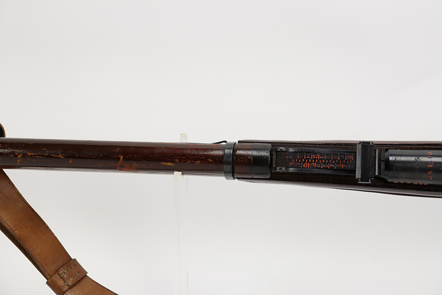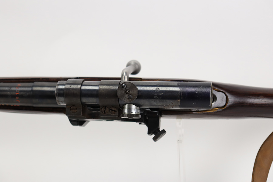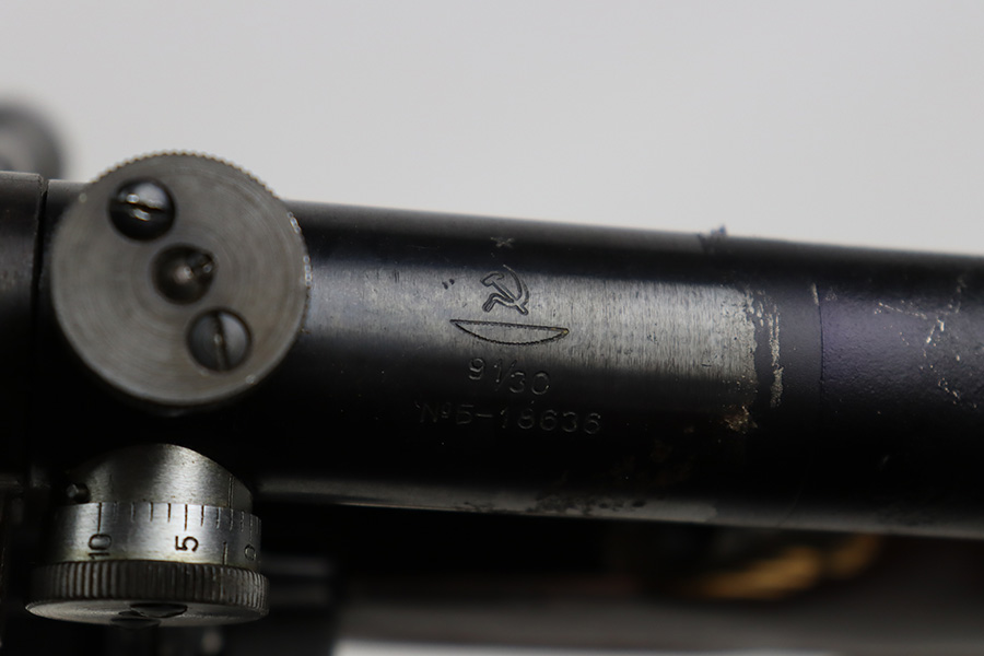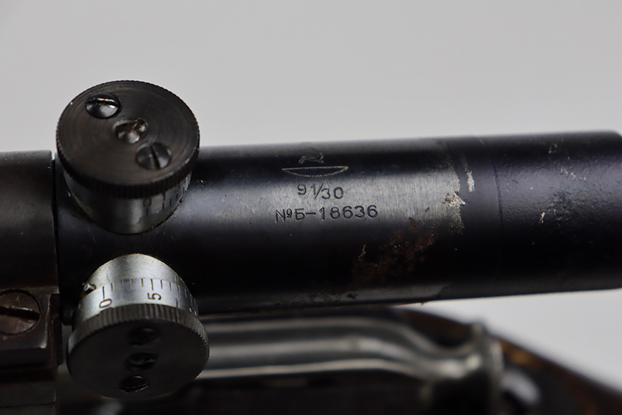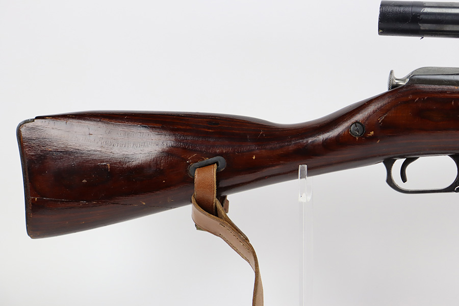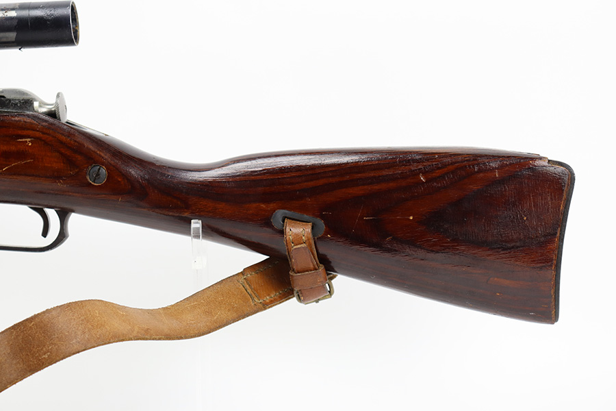 8/30/23 – This is an excellent example of an arsenal-refurbished Mosin-Nagant Model 91/30 in a sniper configuration. All matching with import marks on the barrel. Equipped with a sniper scope that has excellent optics. Comes with a nice leather sling. The metal parts have retained nearly all of their finish, but there is some noticeable pitting on the scope. Nice wood furniture, but there are some light scratches and chipping in the wood finish here and there. Mint bore.