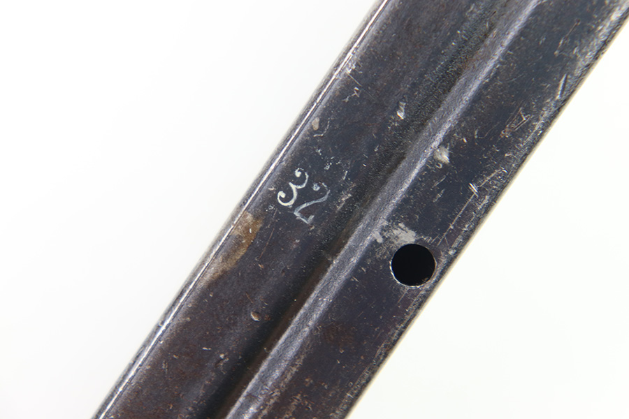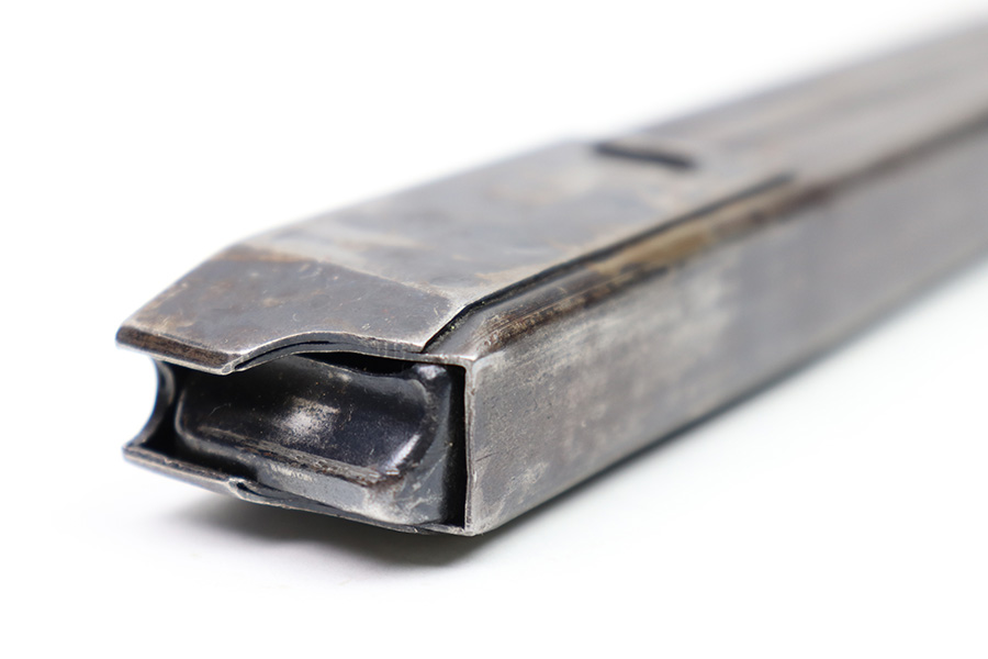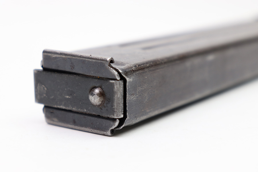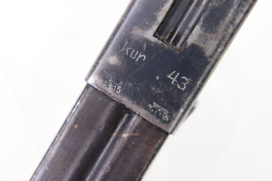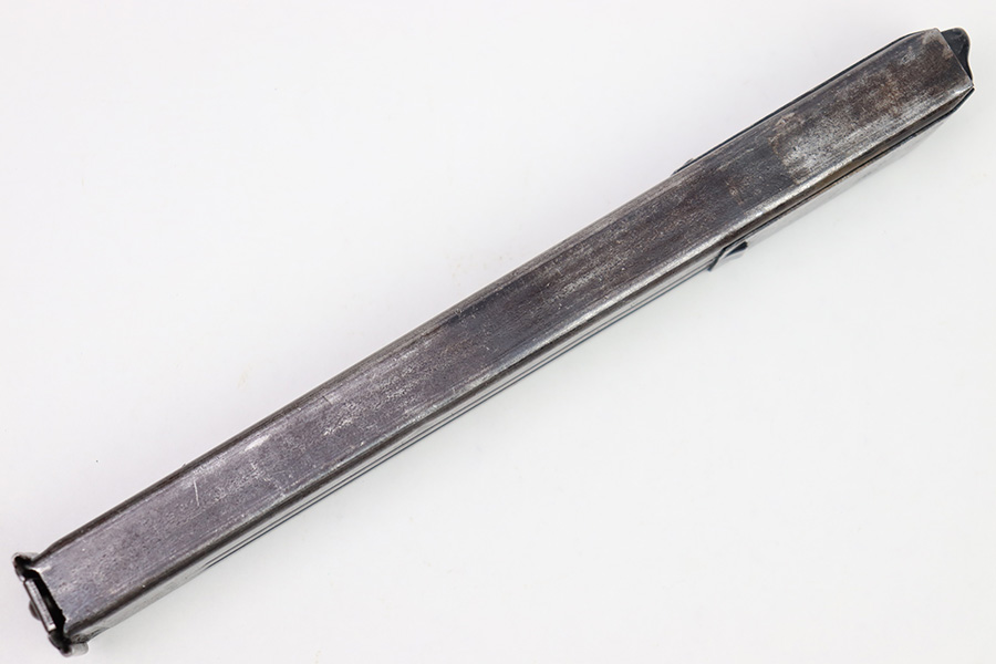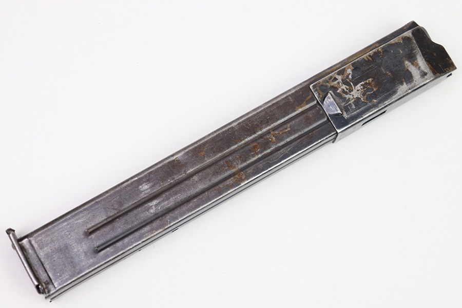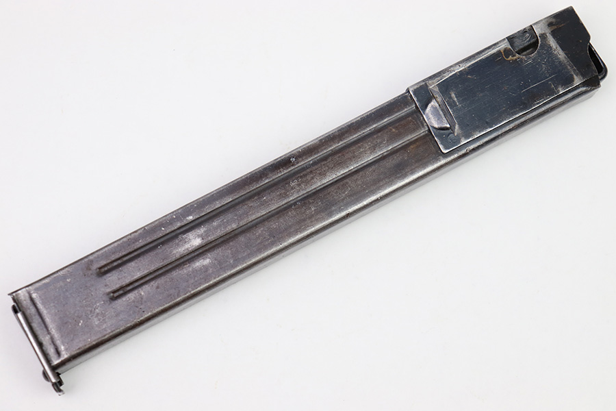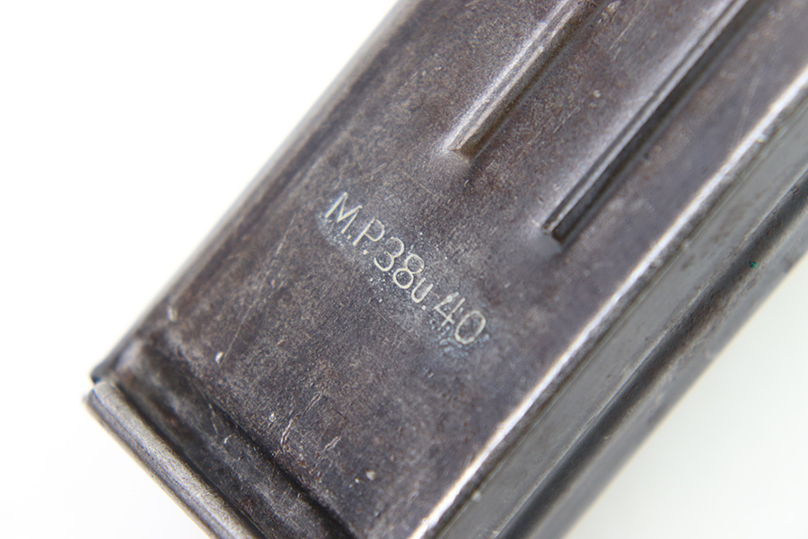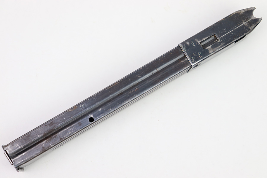 11/8/22 – This is an original MP.40 submachine gun magazine from WW2. The magazine holds 30 rounds of 9mm luger ammunition, so please do not buy if you can’t own high capacity magazines in your state. The magazine is in good overall condition with some natural patina and aging wear throughout. The blued finish is thinned and missing in areas throughout the tube. The spine of the magazine is waffen proofed, dated, and maker stamped. Strong, functional spring.