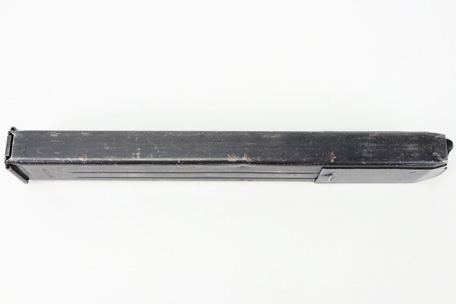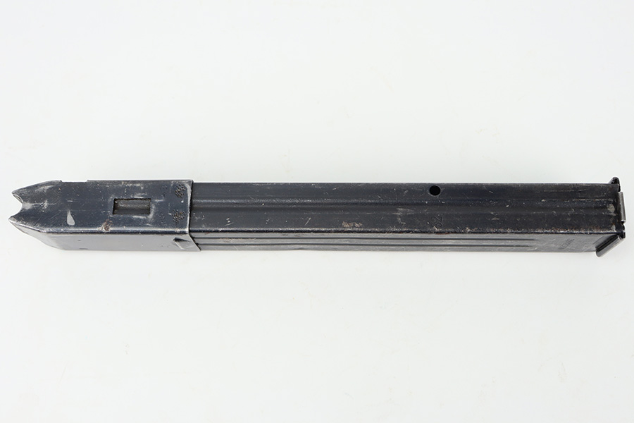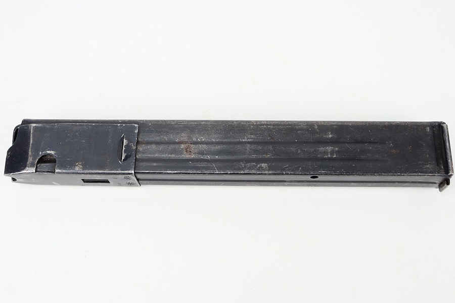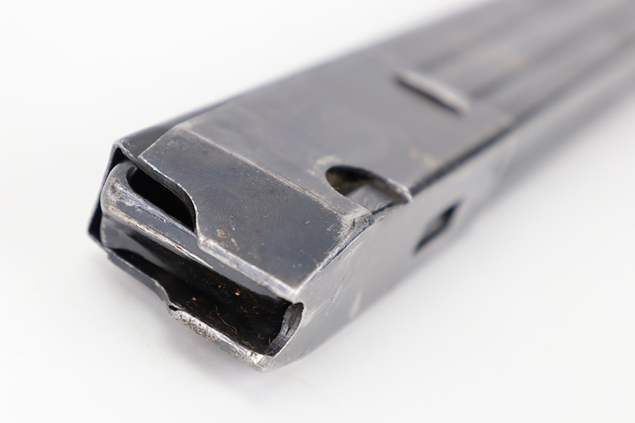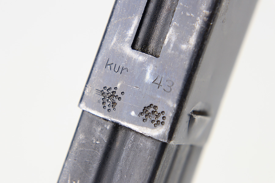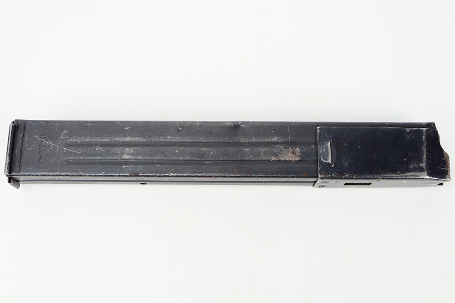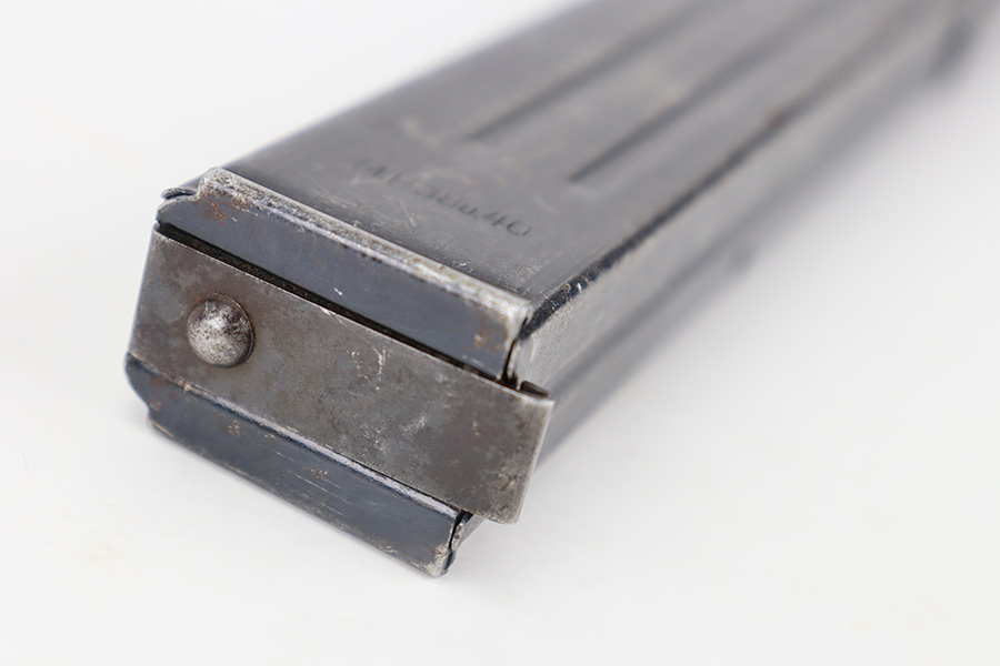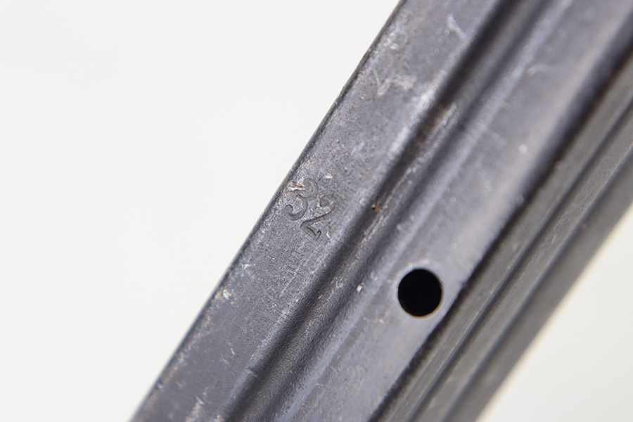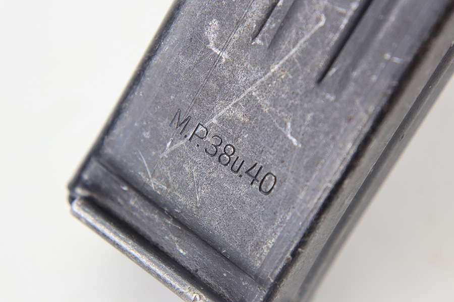 11/30/23 – This is an original 1943 production MP40 magazine. The magazine is in very good overall condition, but unfortunately the waffen military proofs have been “peened” or purposefully obscured to hide the scary Nazi proof stamps. Otherwise, there’s some natural finish loss and surface patina but no major issues. Strong, functional spring. Holds 32 rounds of 9mm.