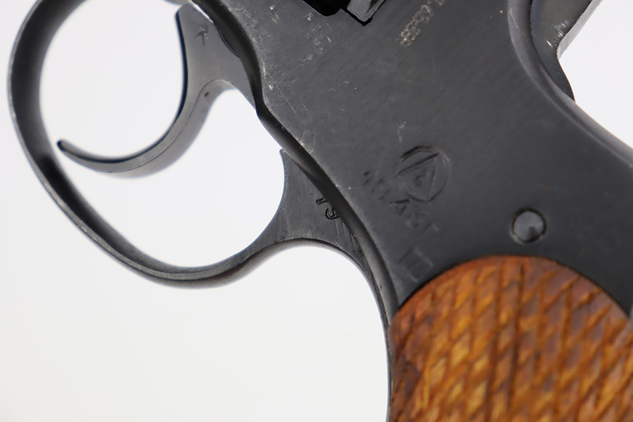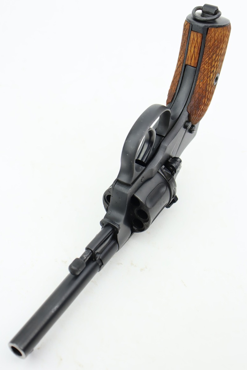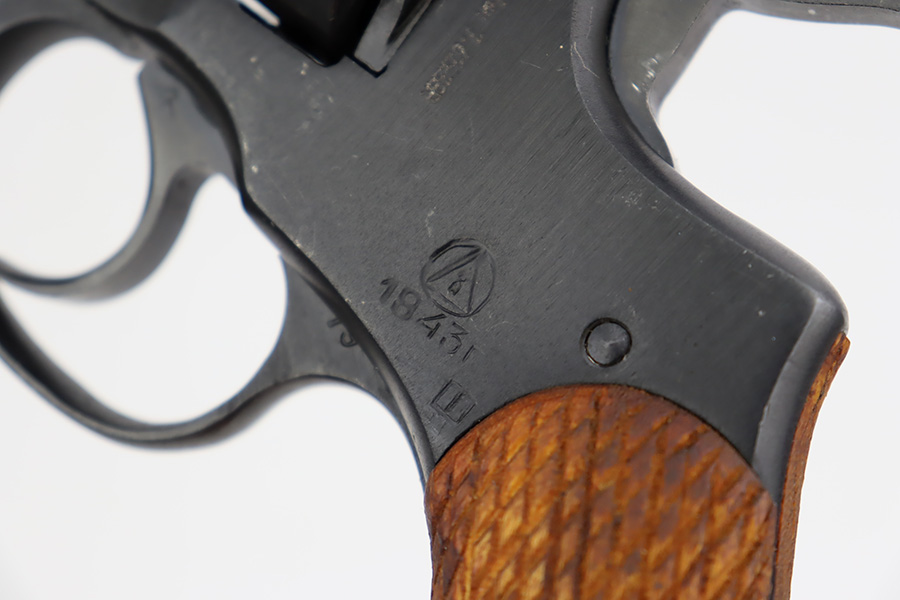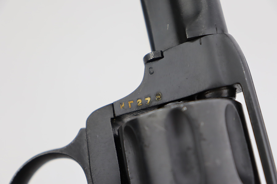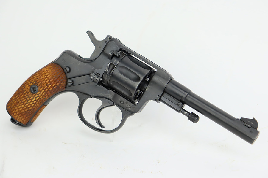 9/18/23 – This is an excellent example of a Nagant Model 1895 Revolver, issued to the Russian military in 1943. It is all matching, but there is an import mark on the left side of the frame. It comes as a rig with a holster and cleaning rod. The gun has been completely arsenal refurbished and refinished, so the bluing is really nice. Virtually no actual finish loss. Mint wood grips. Minty bore.