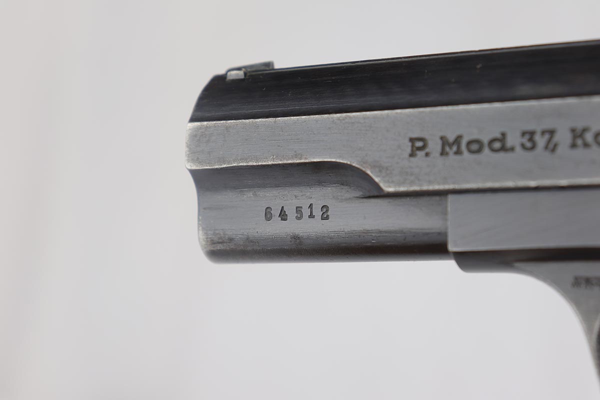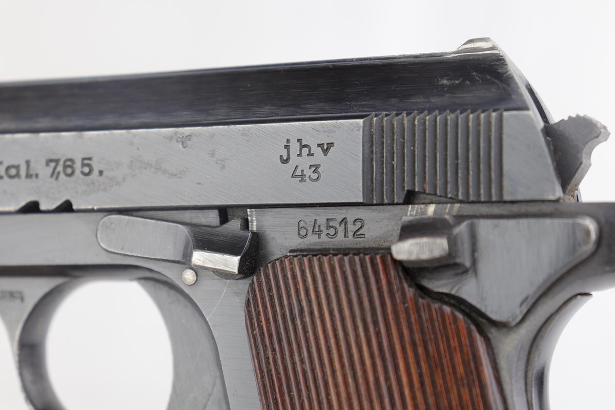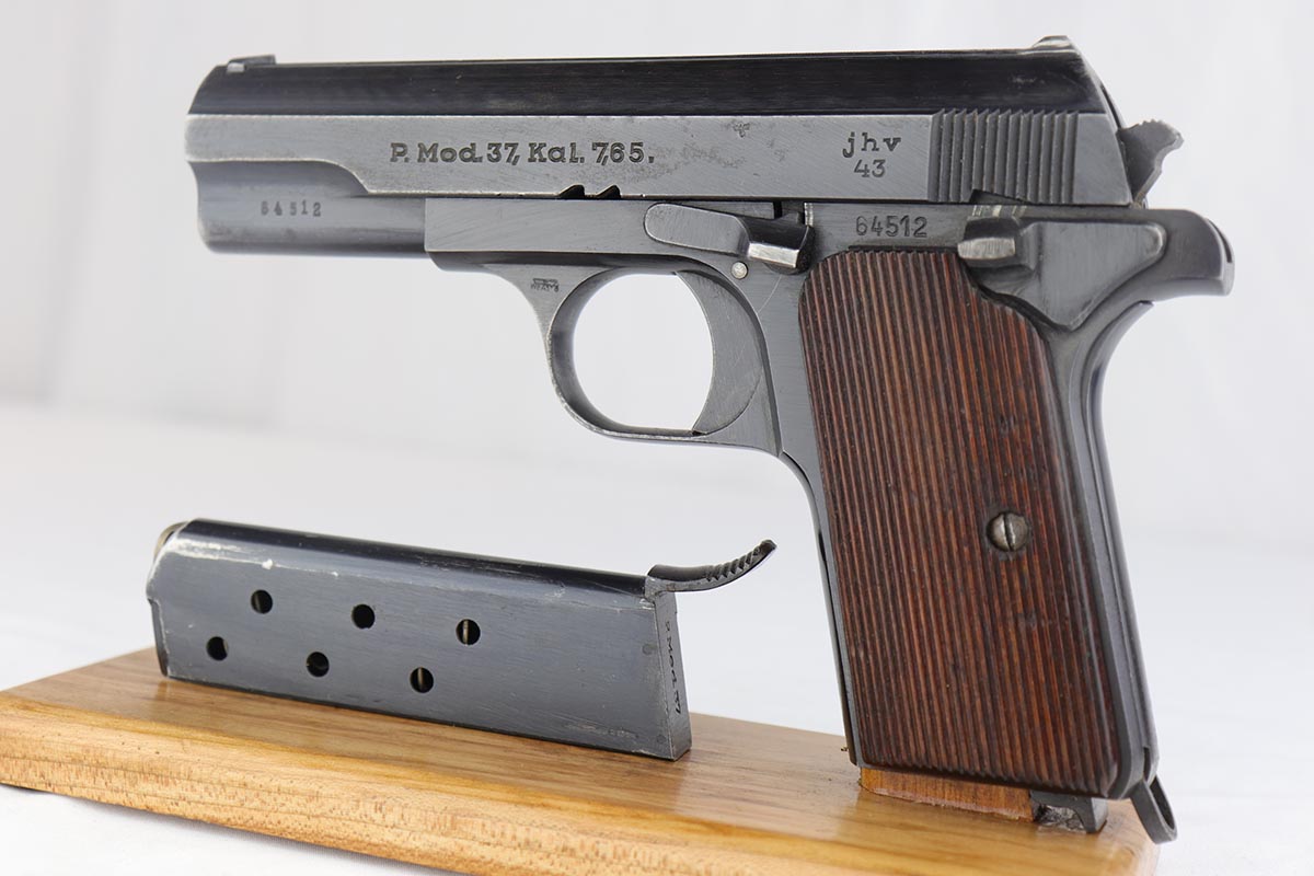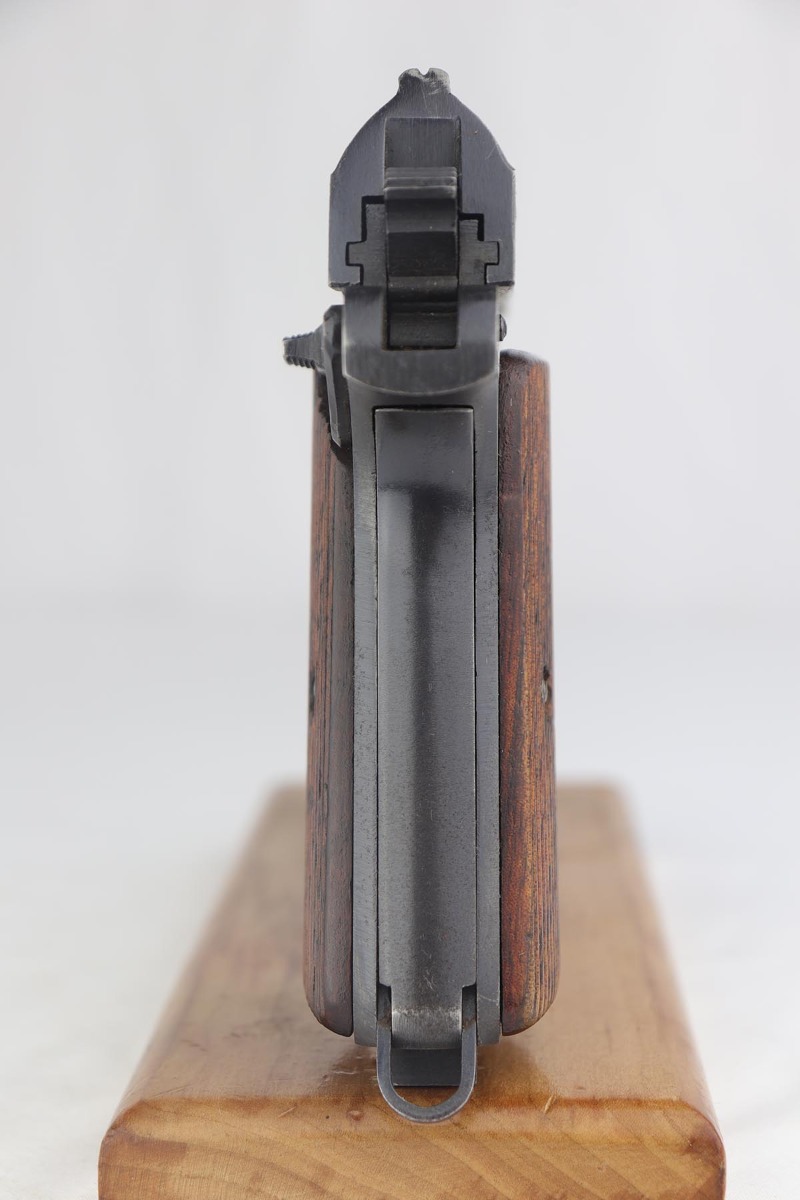 7/8/19 – This is an excellent Nazi issued Femaru M37 from 1943. The pistol is all matching and original, including the magazine. Bluing rates at 95-96% with minimal actual bluing loss on the pistol, but fairly obvious oxidation on the straps and slide. Minty bore and excellent grips.