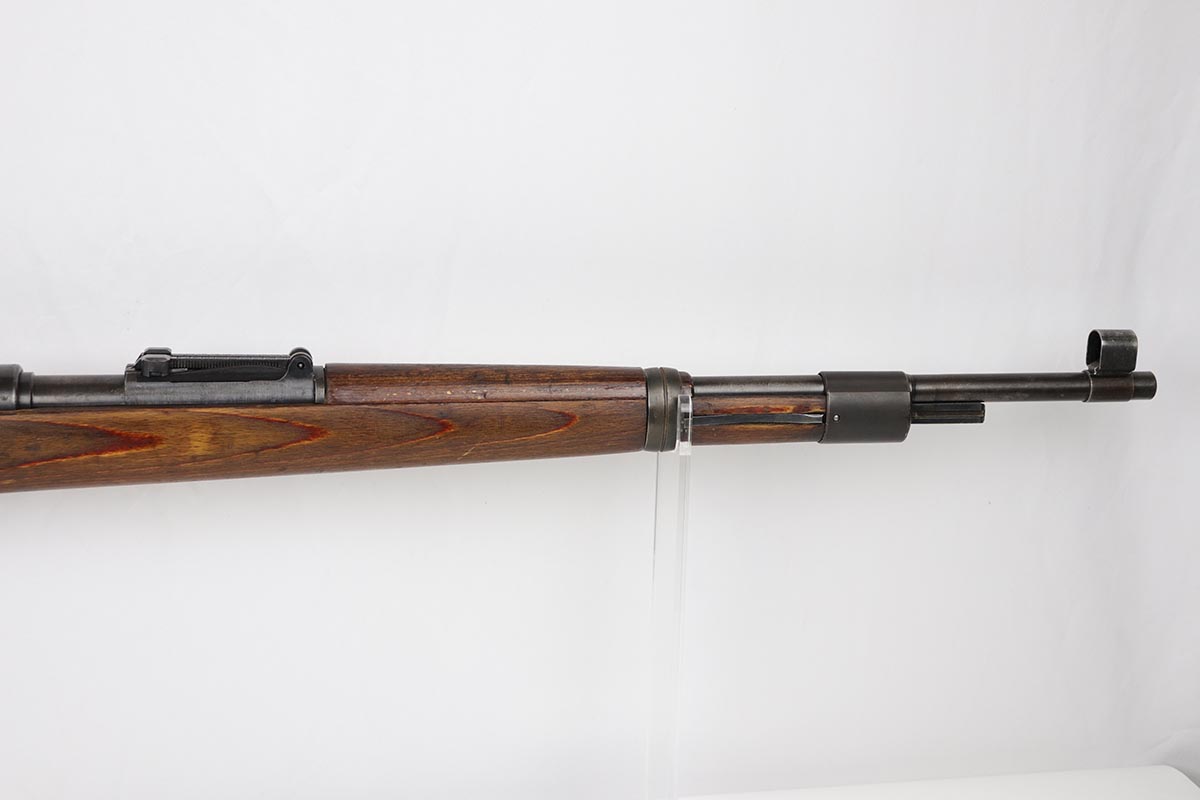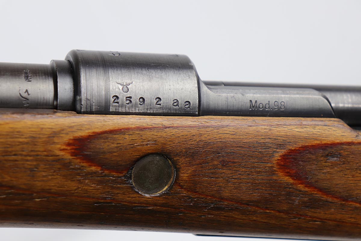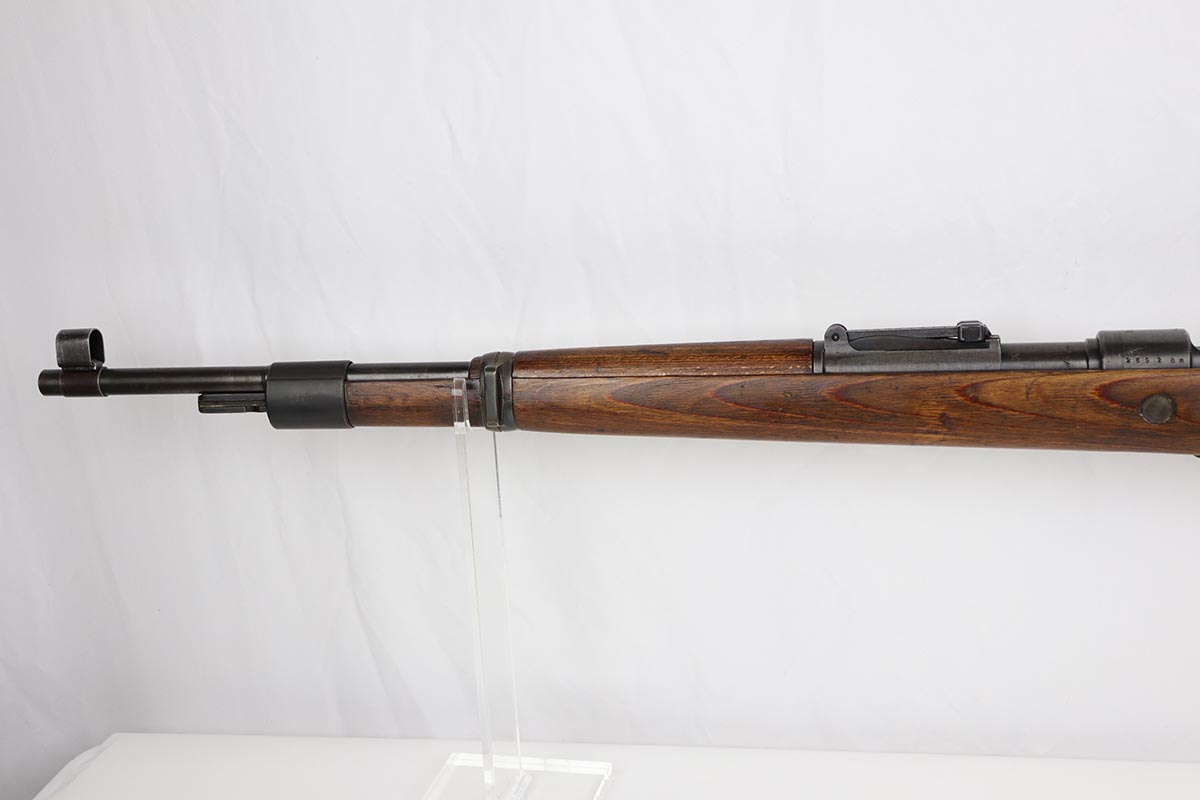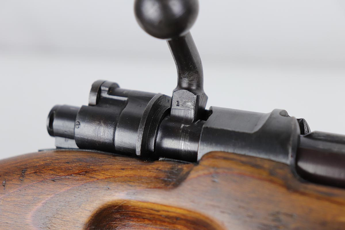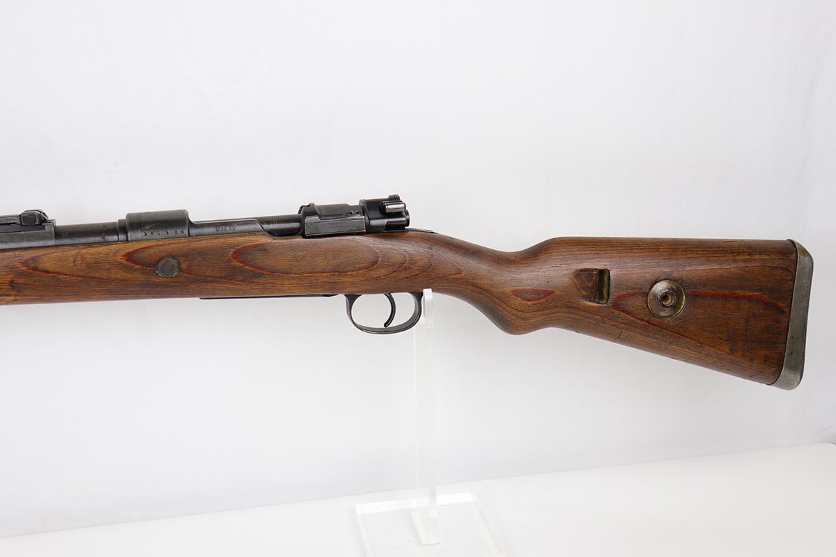 10/2/19 – This is an all matching and original K98 that was manufactured in 1943 by Gustloff Werke for the German Army. The finish rates at around 90% with a very nice receiver but some notable thinning on the trigger grouping, and some patina/thinning on the barrel and bands. The stock has sharp Heer Army proof on the right side. It’s in very good shape but does have a thin surface crack behind the rear screw of the trigger housing. Bore is shiny with strong rifling but some frost throughout. Original sight hood present, but no sling or cleaning rod.
