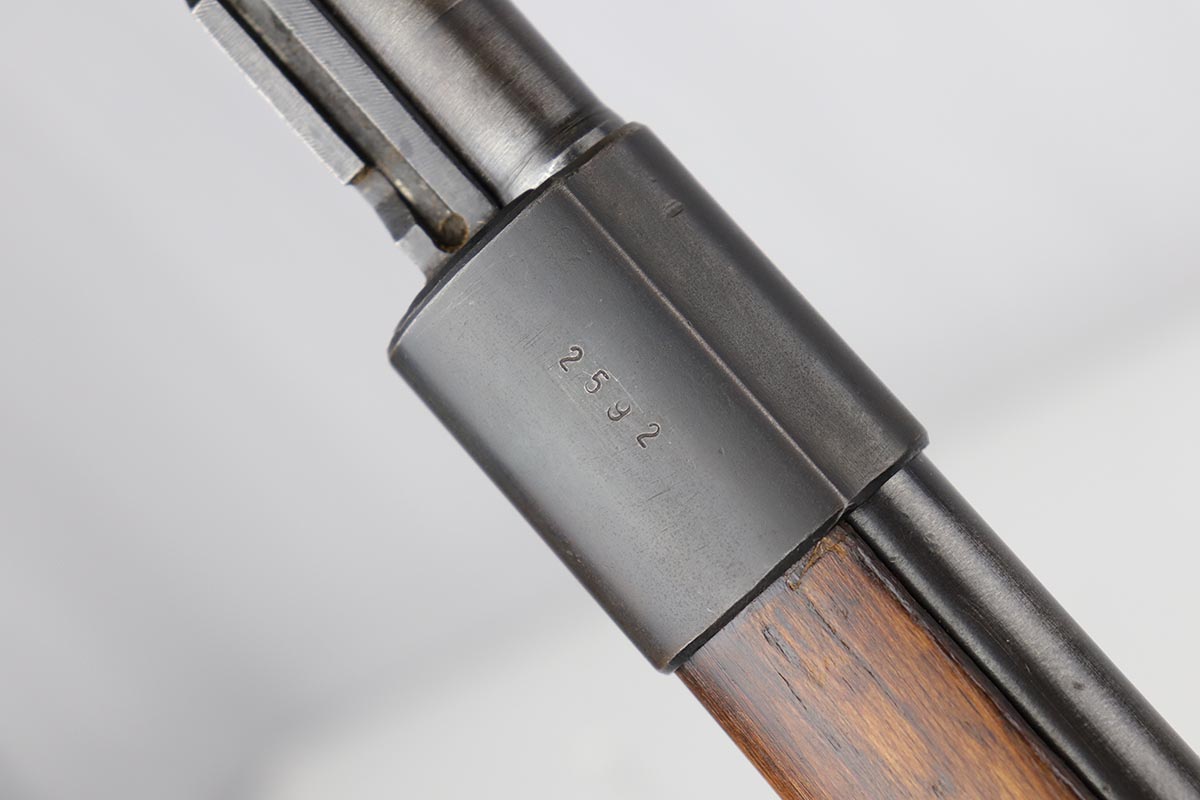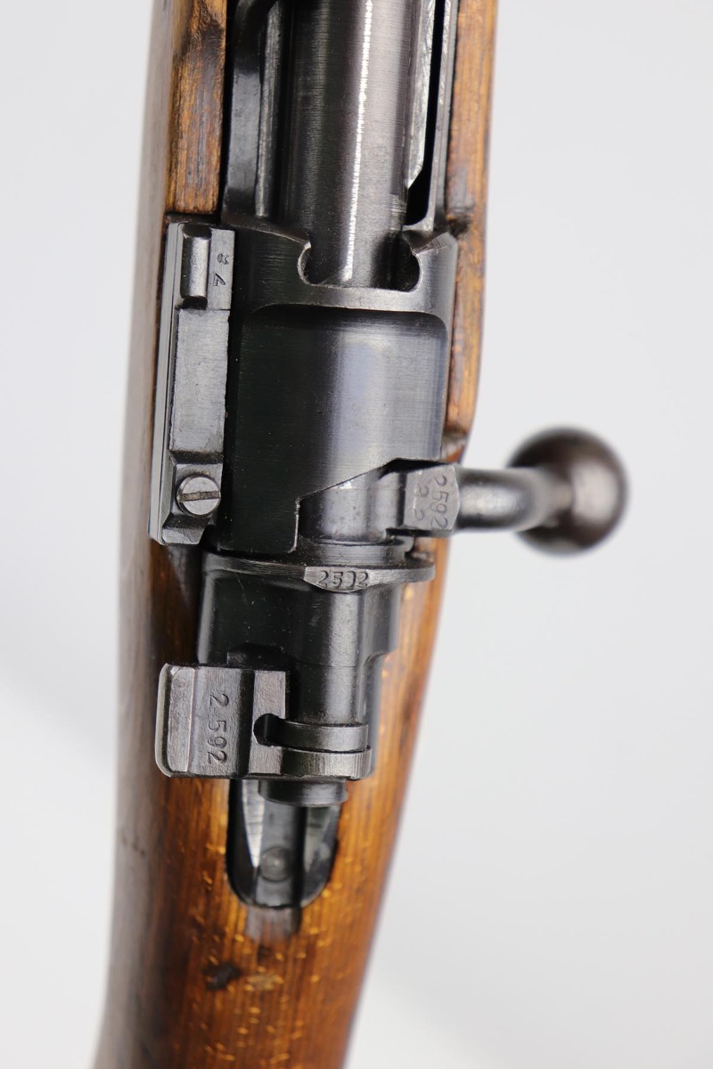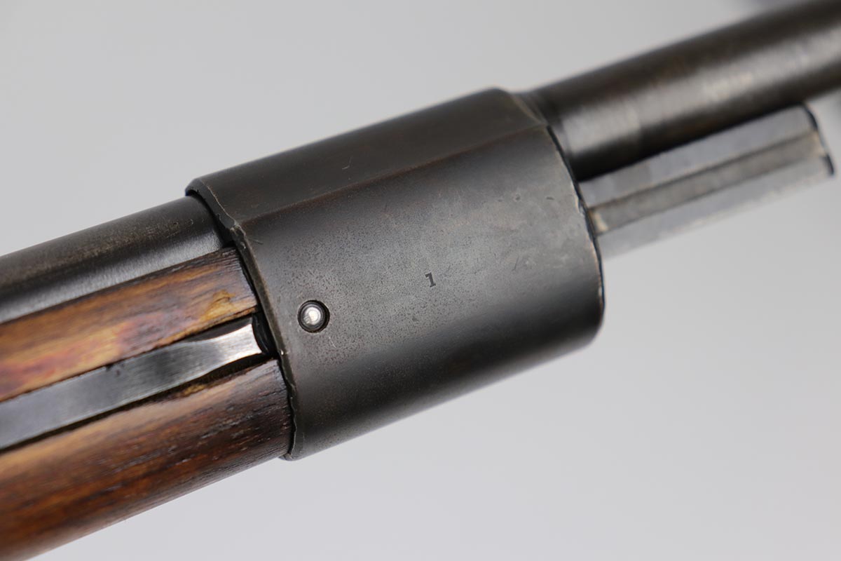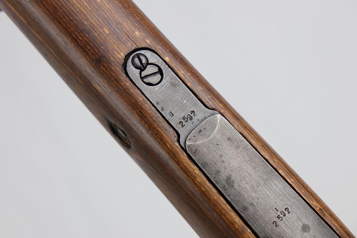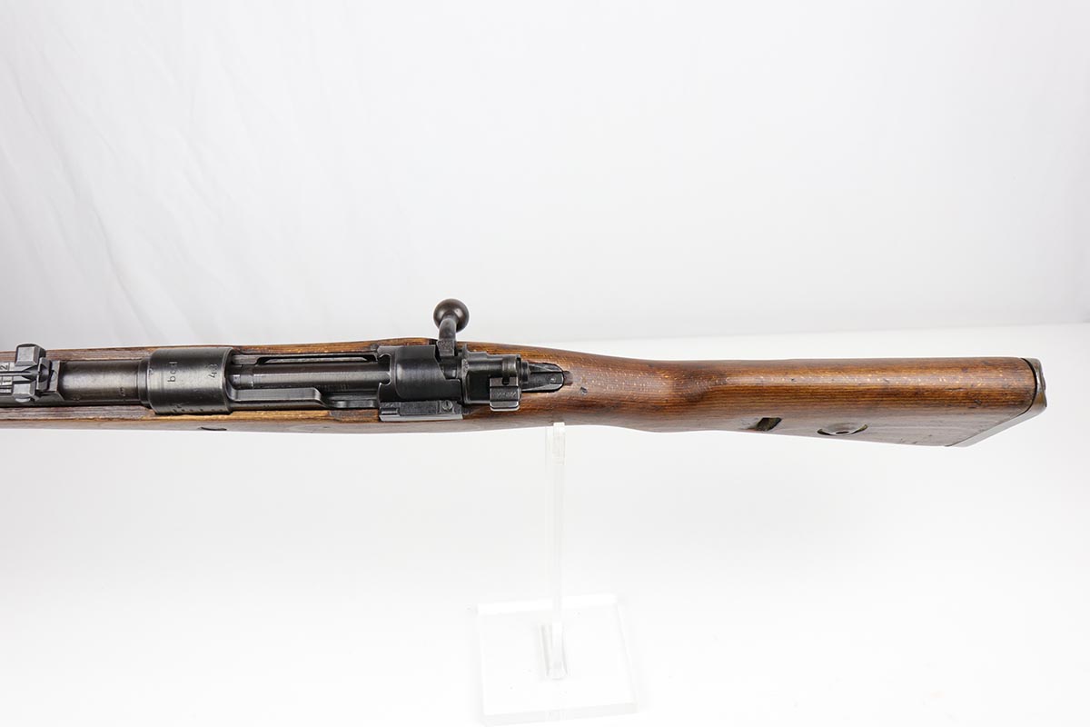 10/2/19 – This is an all matching and original K98 that was manufactured in 1943 by Gustloff Werke for the German Army. The finish rates at around 90% with a very nice receiver but some notable thinning on the trigger grouping, and some patina/thinning on the barrel and bands. The stock has sharp Heer Army proof on the right side. It’s in very good shape but does have a thin surface crack behind the rear screw of the trigger housing. Bore is shiny with strong rifling but some frost throughout. Original sight hood present, but no sling or cleaning rod.
