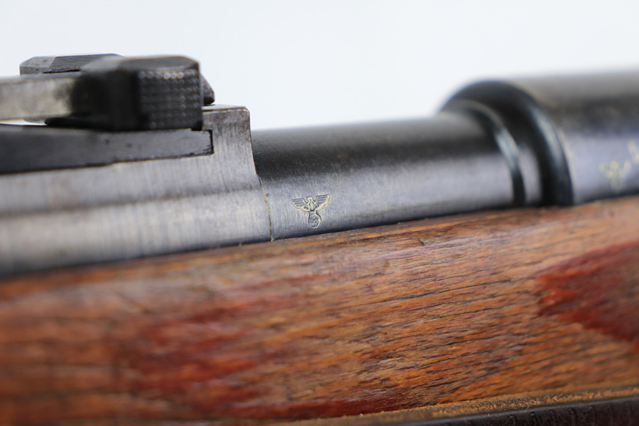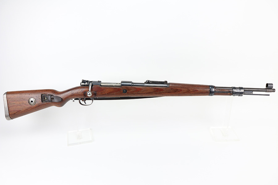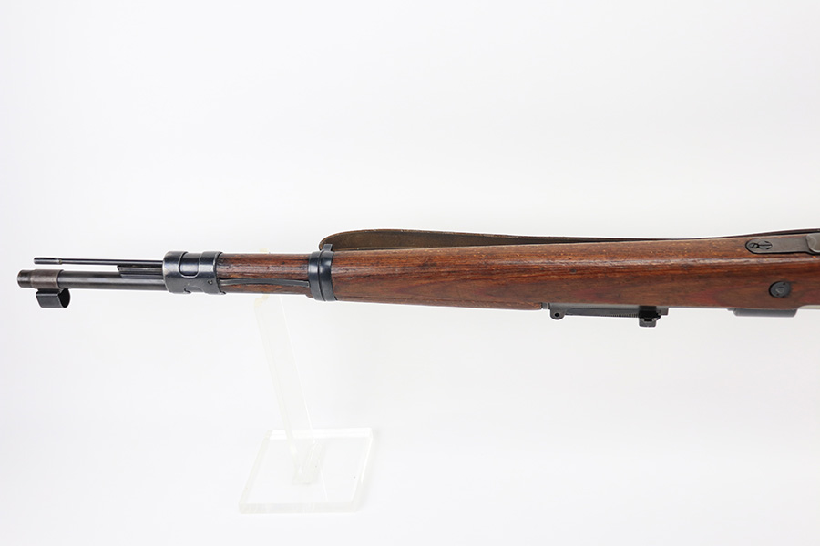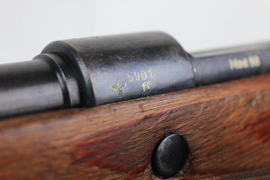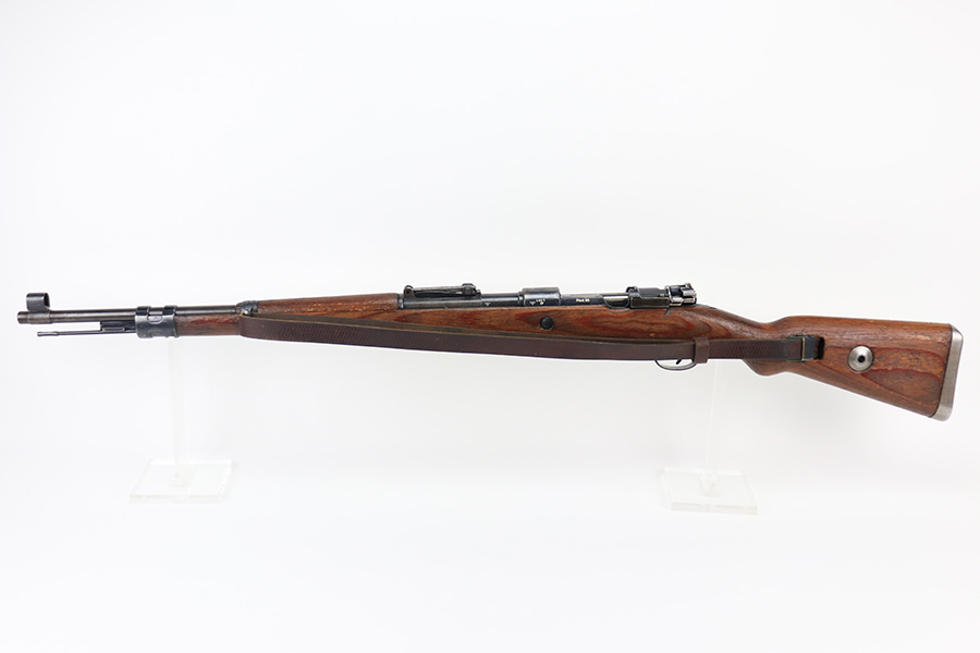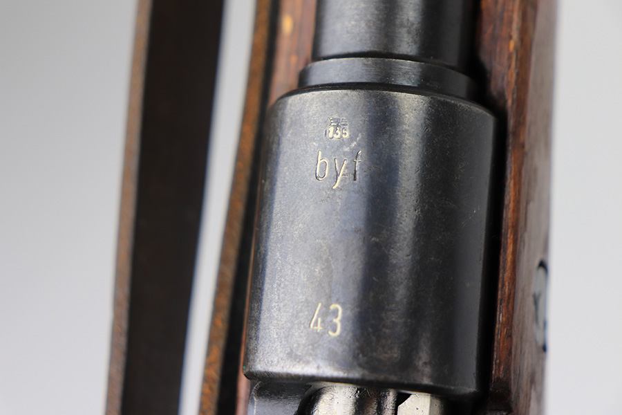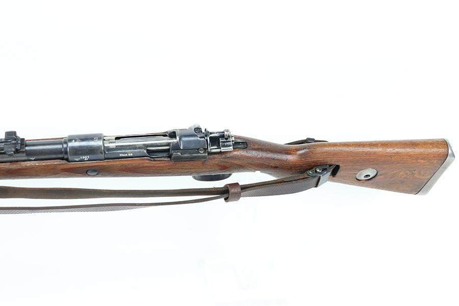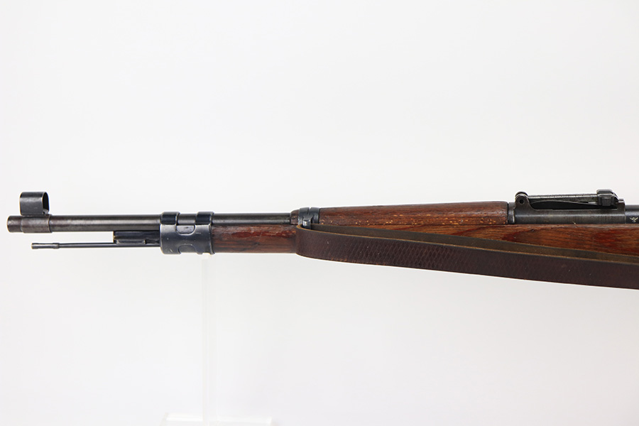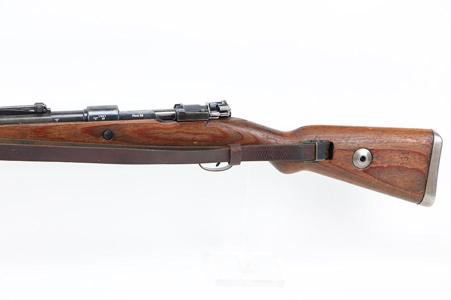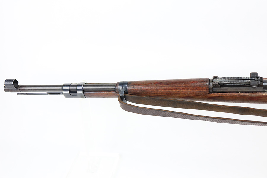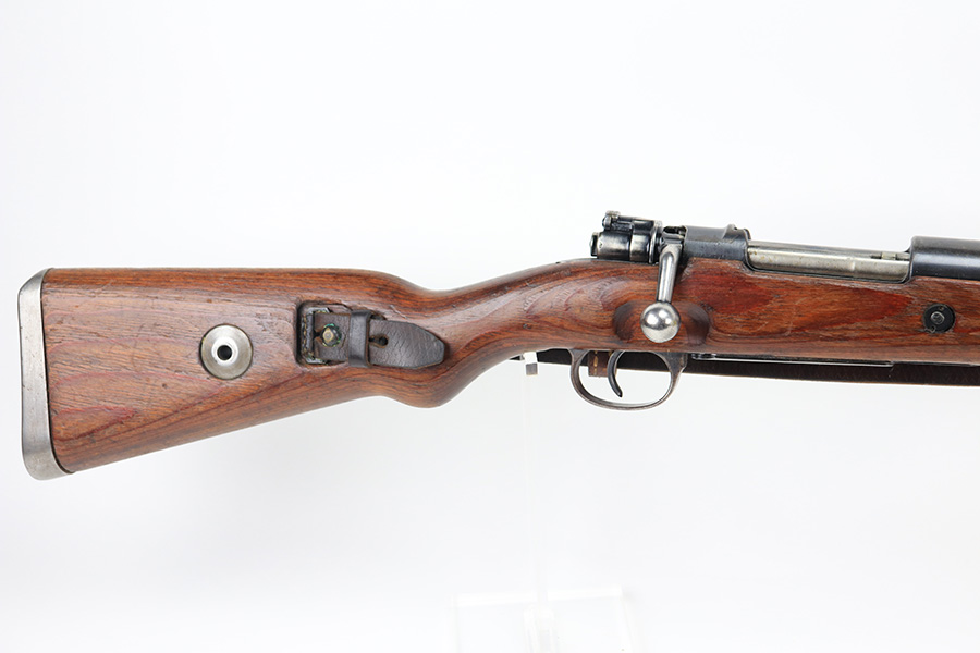 1/19/22 – This is a very nice example of a Mauser K98 rifle issued to the Nazi military in 1943. It comes with an original cleaning rod and brown leather sling. The gun is mostly matching. Mismatched parts include the rear barrel band, bolt, and stock. The front barrel band is un-numbered. No import mark. Overall, the gun is in very nice condition. There is minor splotchy discoloration on the receiver and minor thinning along the barrel. Noticeable finish loss on floor plate and trigger group. There is minor scratchy wear on the front barrel band and minor spotty oxidation along the barrel and on the floor plate/trigger group. The wood stock is nice with only minor dings, dents, and bruises throughout. The bore has good rifling with some minor pin-pricking in the grooves. This gun would make an excellent shooter.