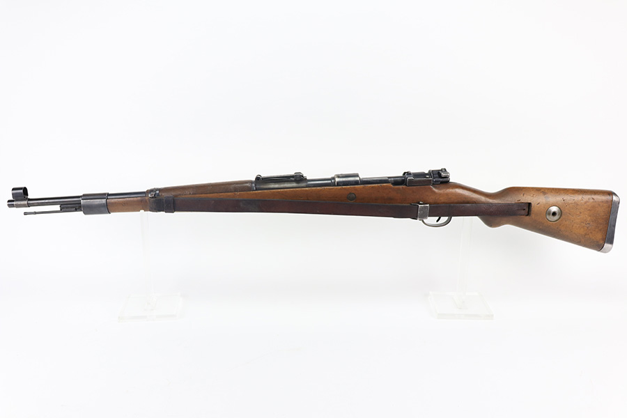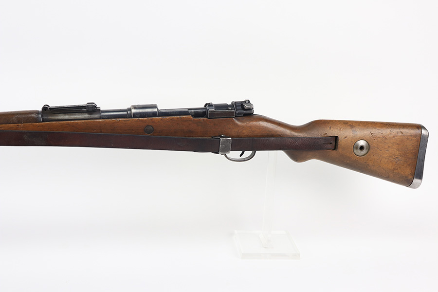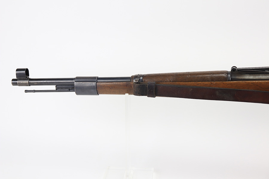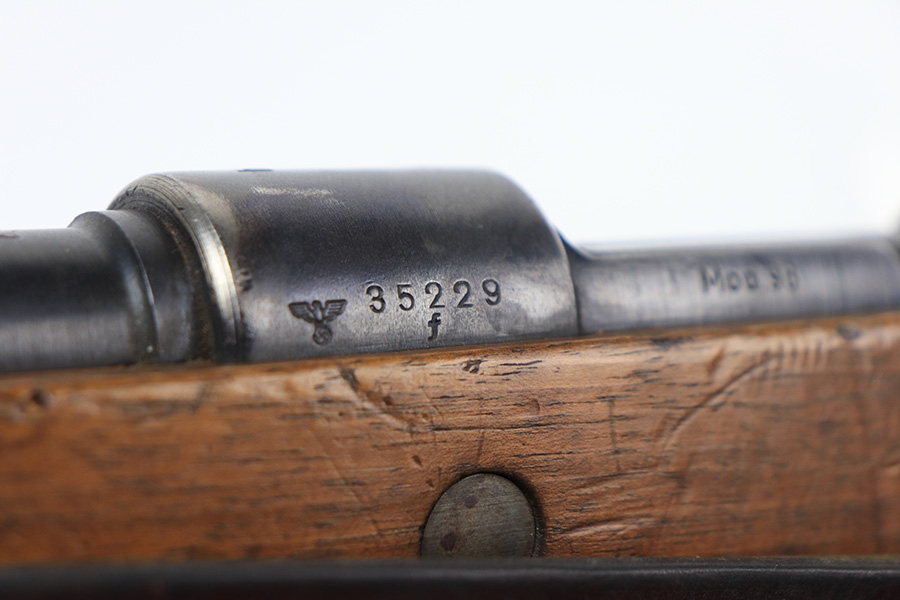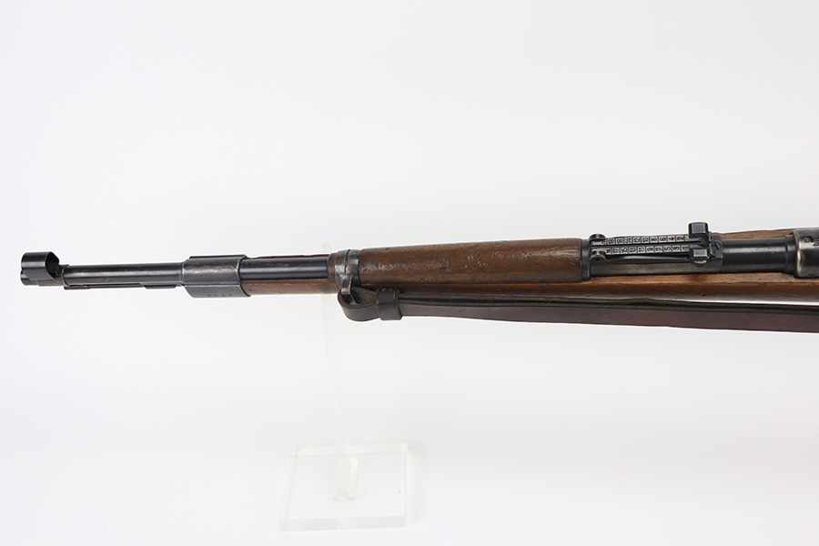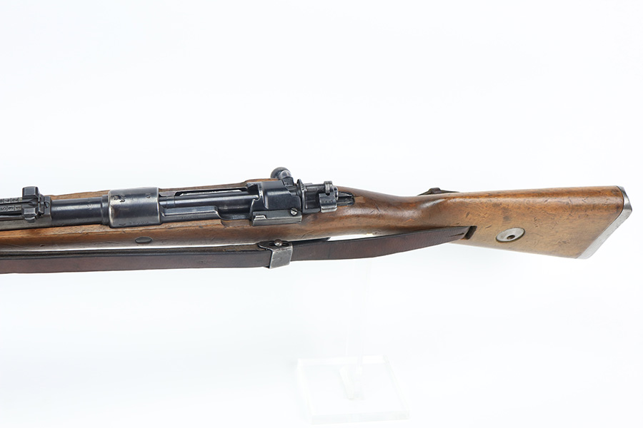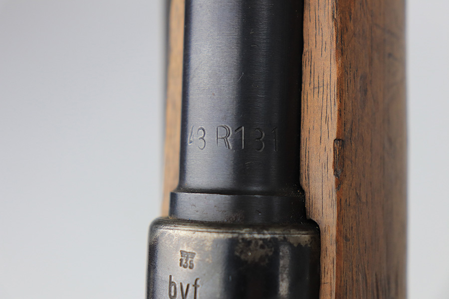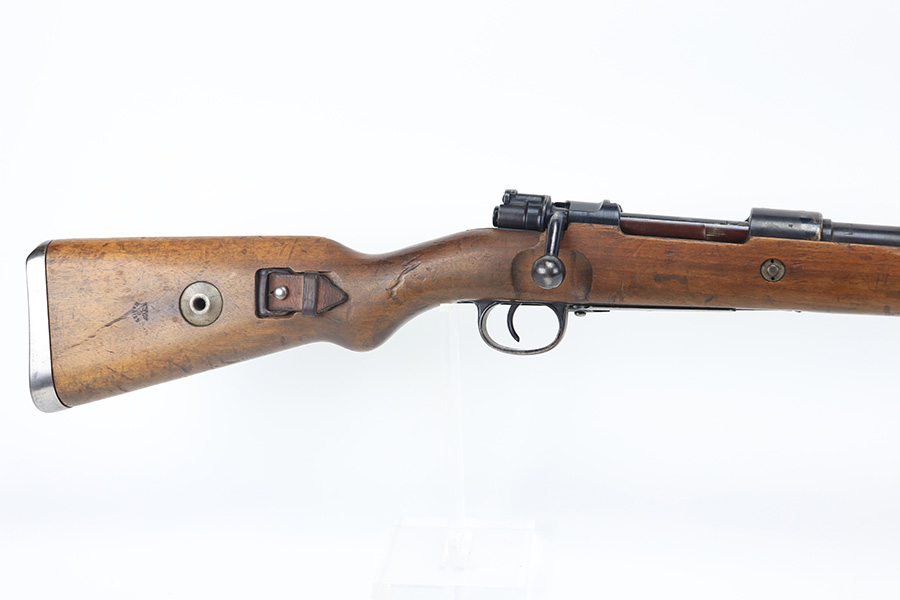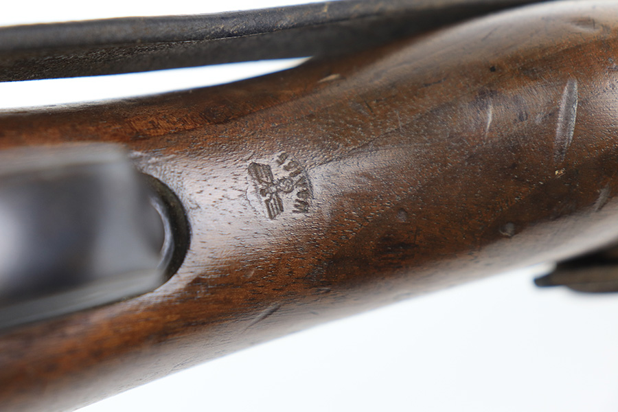 2/22/22 – This is a very nice example of a Mauser K98 issued to the Nazi military in 1943. The gun is entirely matching (including the stock and upper handguard) except for the butt plate, which is dated 1942. The stock and upper hand guard are numbered on the inside (see photos). It has the proper waffen military acceptance proofs throughout. Comes with an original cleaning rod and leather sling. Overall, the gun is in very nice condition. There is spotty, somewhat scratchy wear on the barrel, especially around the front barrel band. Some small dings in the metal in the same area as well. There is thinning on both sides of the barrel (near the rear sight) and on the floor plate. There is an area of splotchy discoloration on the top of the receiver. Spotty oxidation on the butt plate. The stock is waffen-proofed. There are small dings, dents, and scratches in the wood throughout. The bore is near-mint.