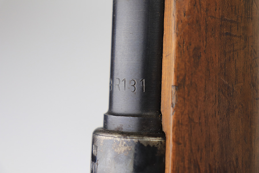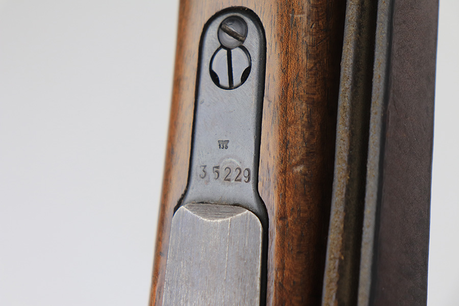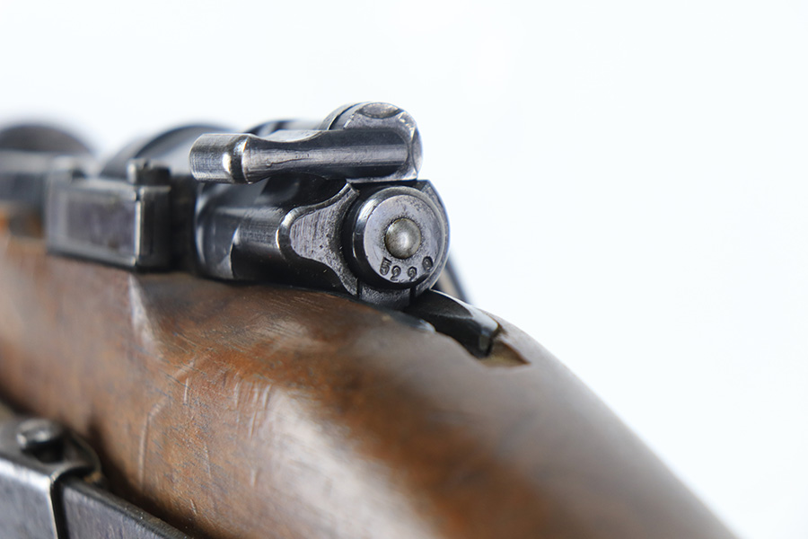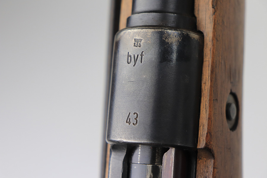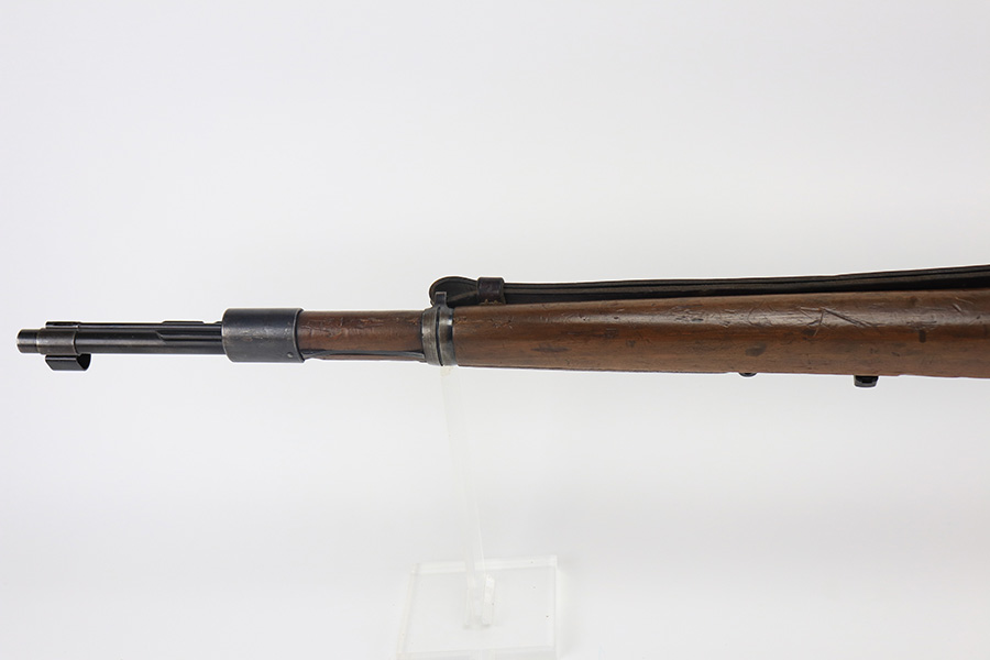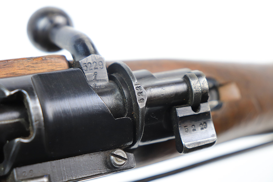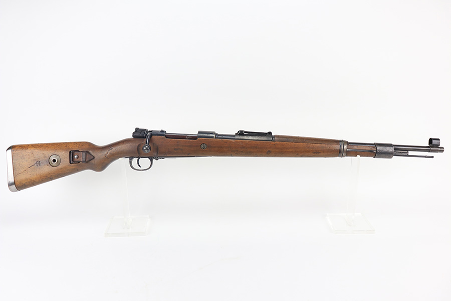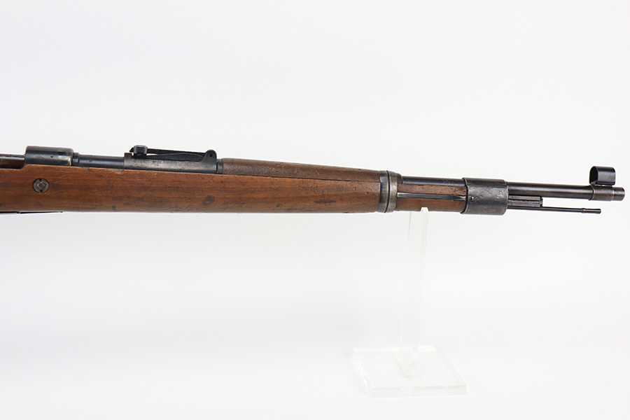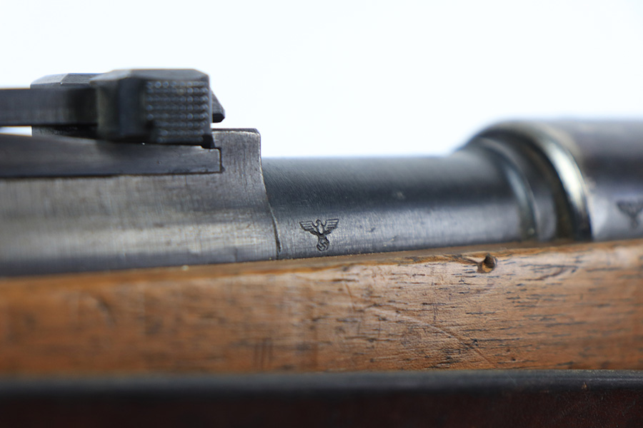 2/22/22 – This is a very nice example of a Mauser K98 issued to the Nazi military in 1943. The gun is entirely matching (including the stock and upper handguard) except for the butt plate, which is dated 1942. The stock and upper hand guard are numbered on the inside (see photos). It has the proper waffen military acceptance proofs throughout. Comes with an original cleaning rod and leather sling. Overall, the gun is in very nice condition. There is spotty, somewhat scratchy wear on the barrel, especially around the front barrel band. Some small dings in the metal in the same area as well. There is thinning on both sides of the barrel (near the rear sight) and on the floor plate. There is an area of splotchy discoloration on the top of the receiver. Spotty oxidation on the butt plate. The stock is waffen-proofed. There are small dings, dents, and scratches in the wood throughout. The bore is near-mint.