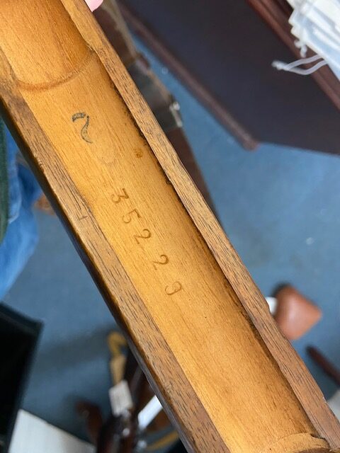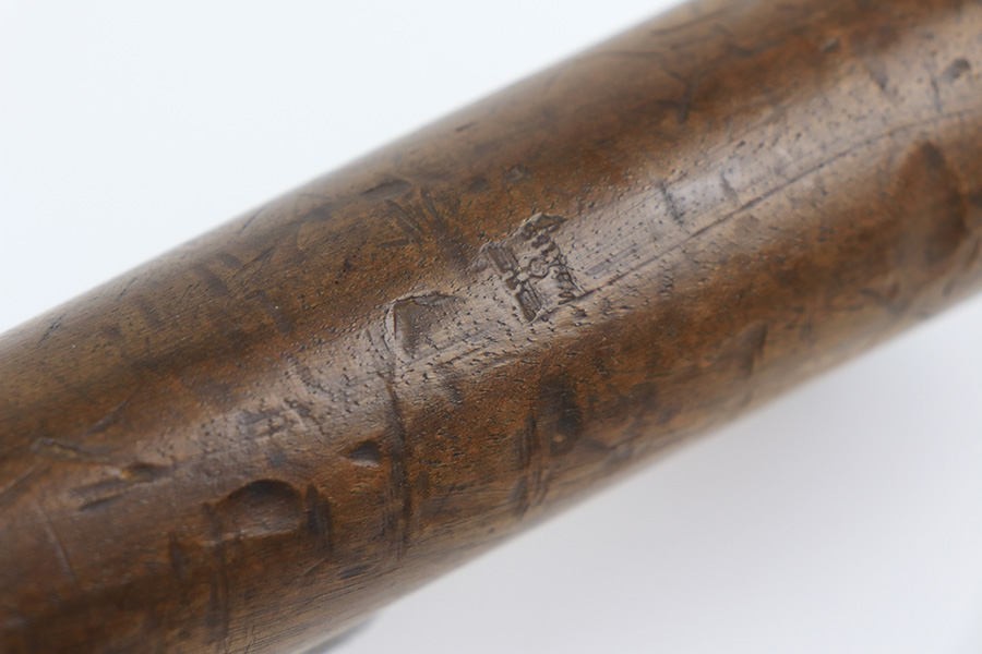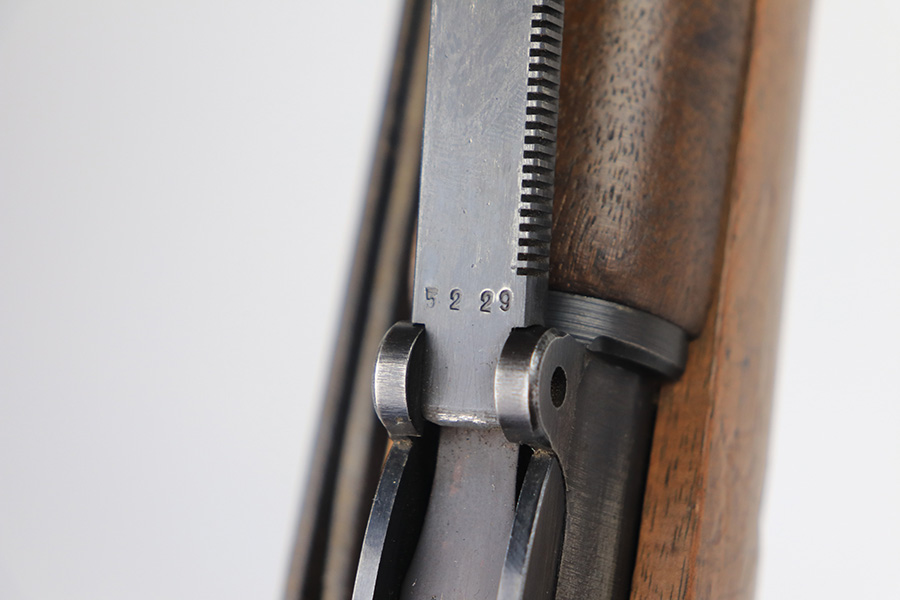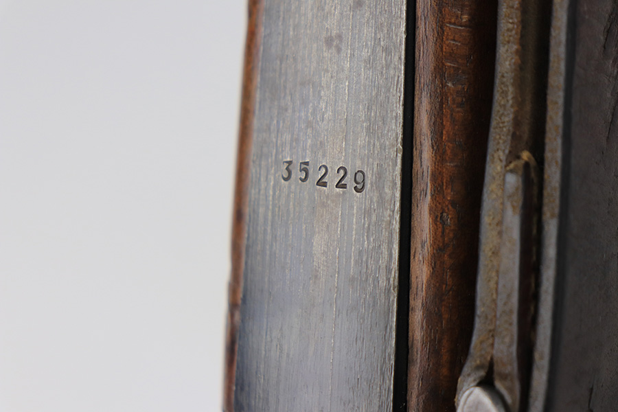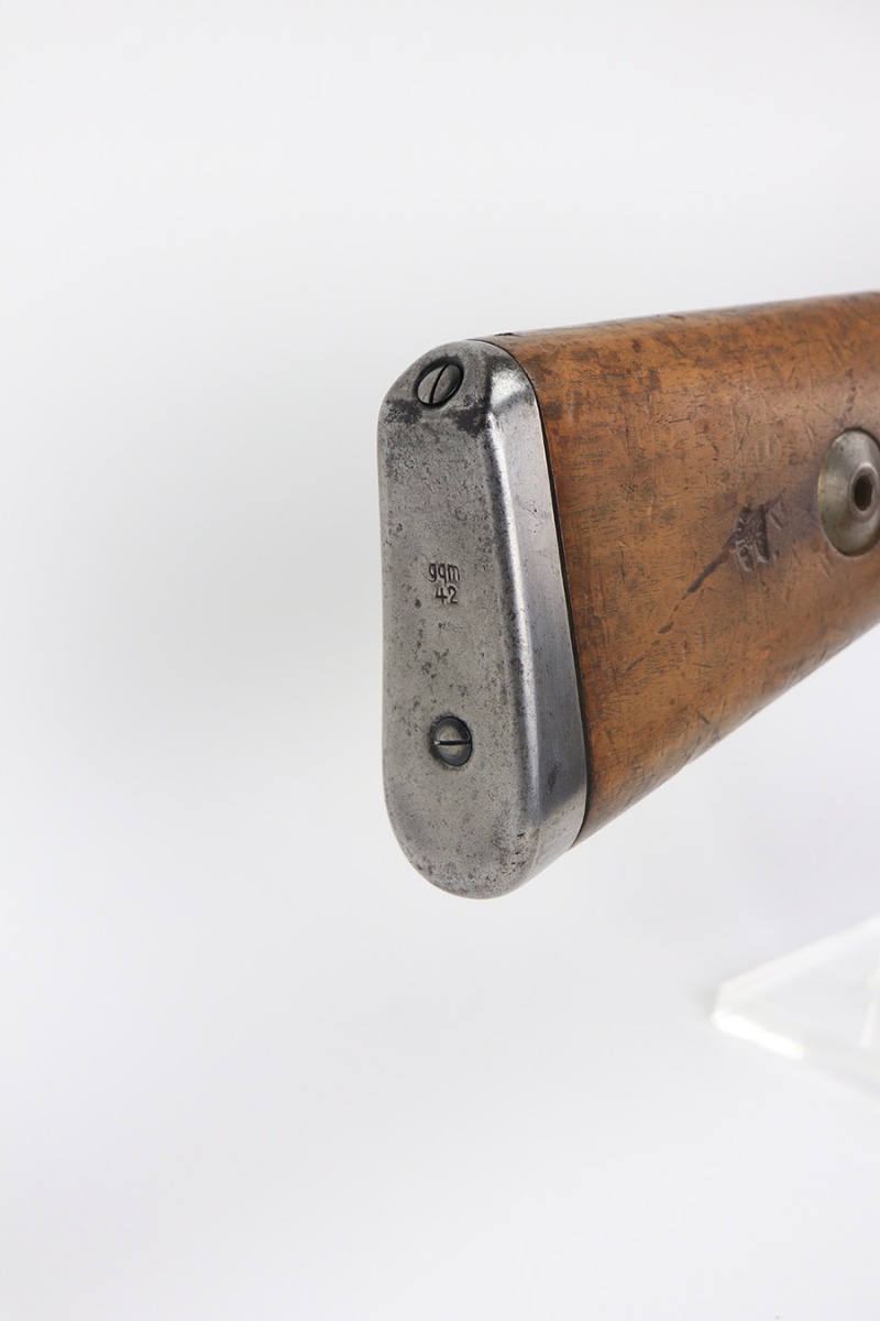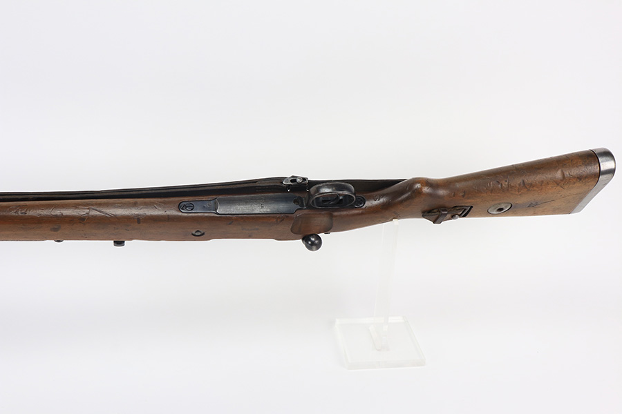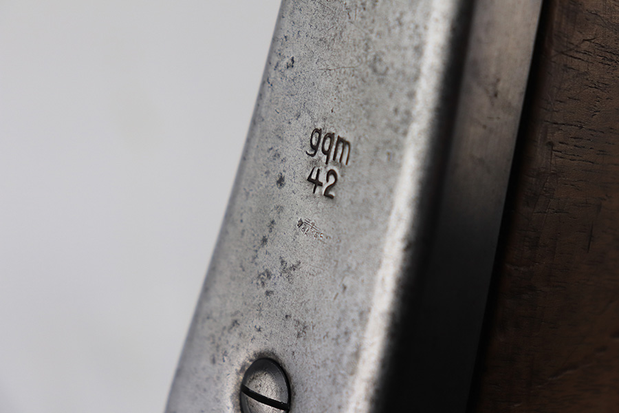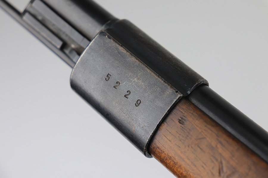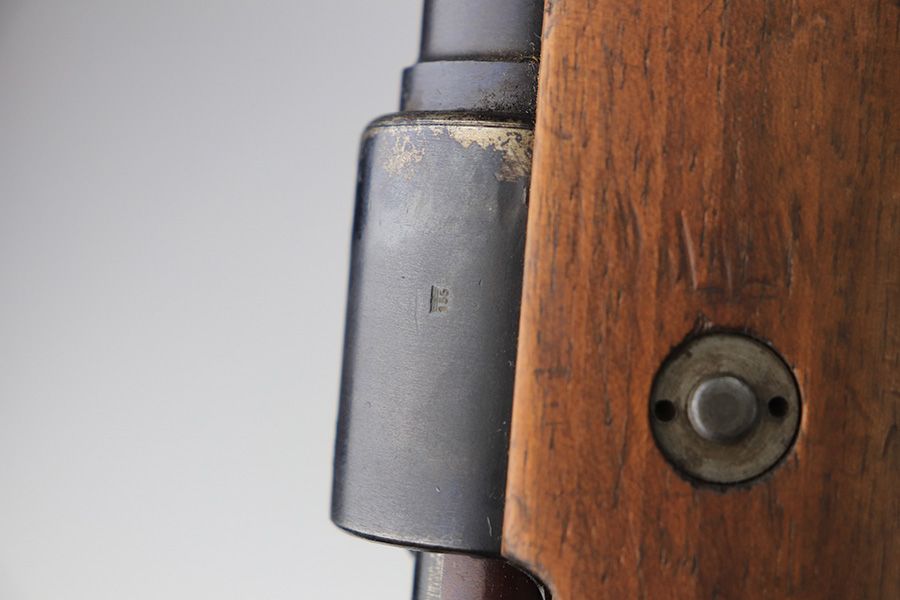 2/22/22 – This is a very nice example of a Mauser K98 issued to the Nazi military in 1943. The gun is entirely matching (including the stock and upper handguard) except for the butt plate, which is dated 1942. The stock and upper hand guard are numbered on the inside (see photos). It has the proper waffen military acceptance proofs throughout. Comes with an original cleaning rod and leather sling. Overall, the gun is in very nice condition. There is spotty, somewhat scratchy wear on the barrel, especially around the front barrel band. Some small dings in the metal in the same area as well. There is thinning on both sides of the barrel (near the rear sight) and on the floor plate. There is an area of splotchy discoloration on the top of the receiver. Spotty oxidation on the butt plate. The stock is waffen-proofed. There are small dings, dents, and scratches in the wood throughout. The bore is near-mint.