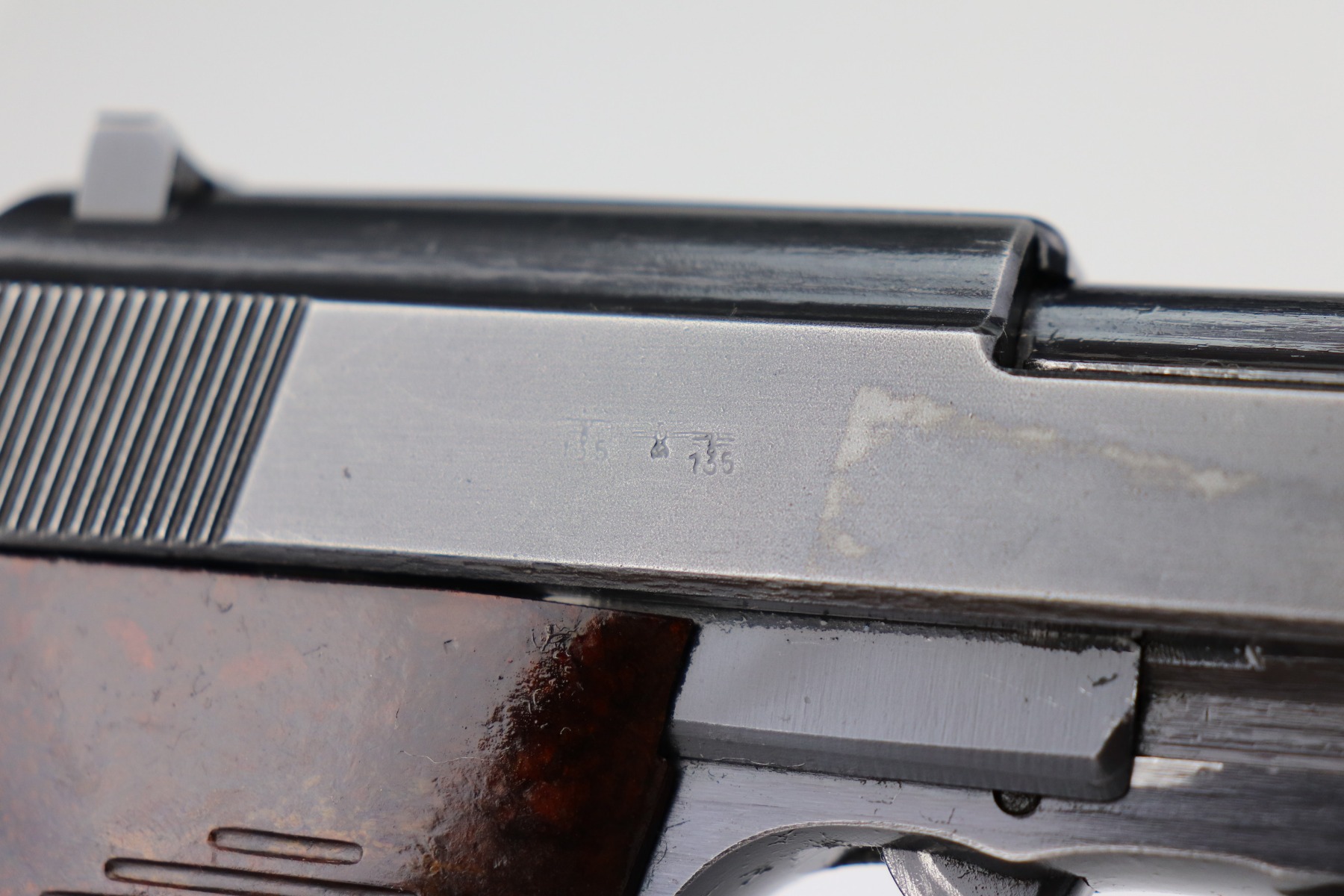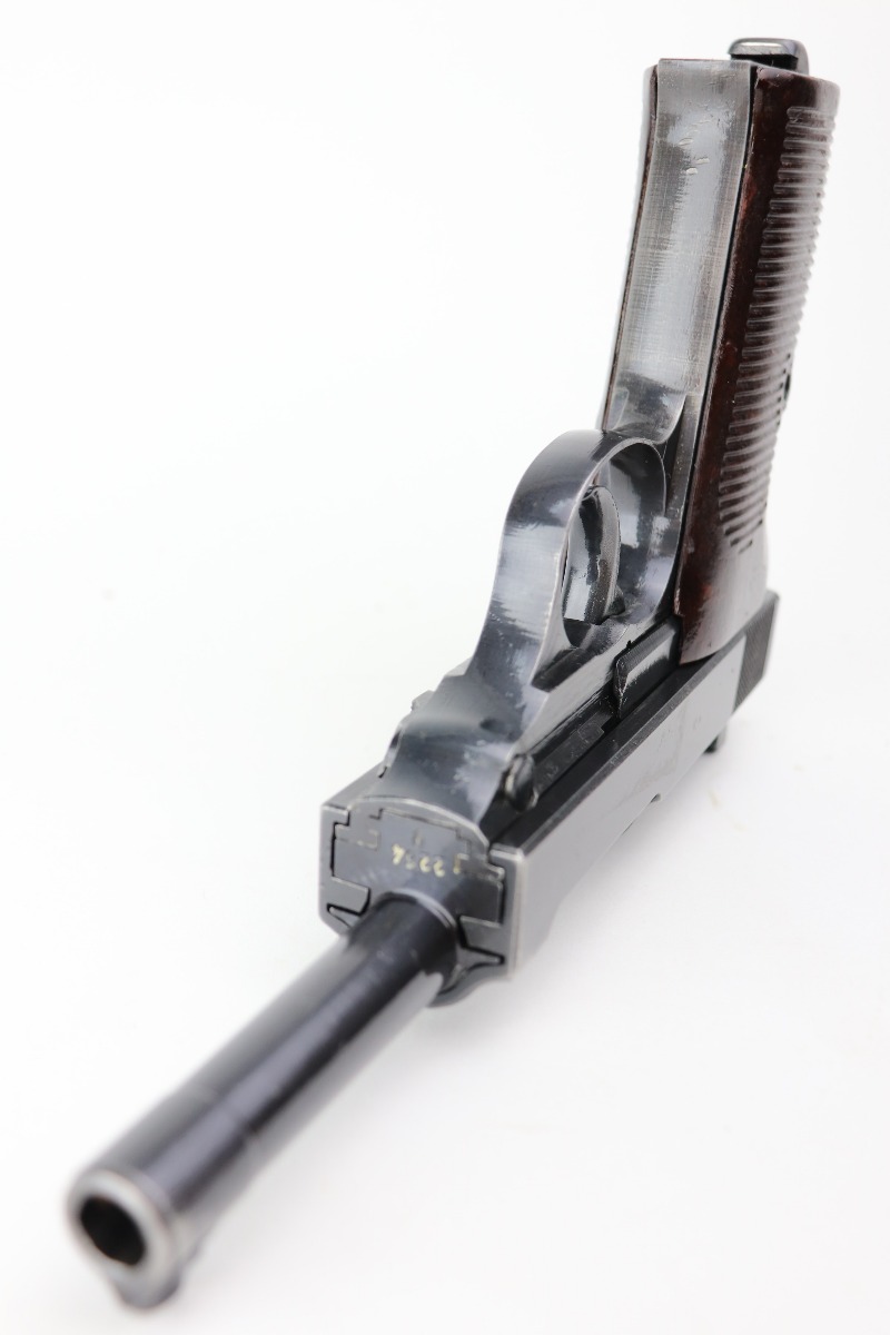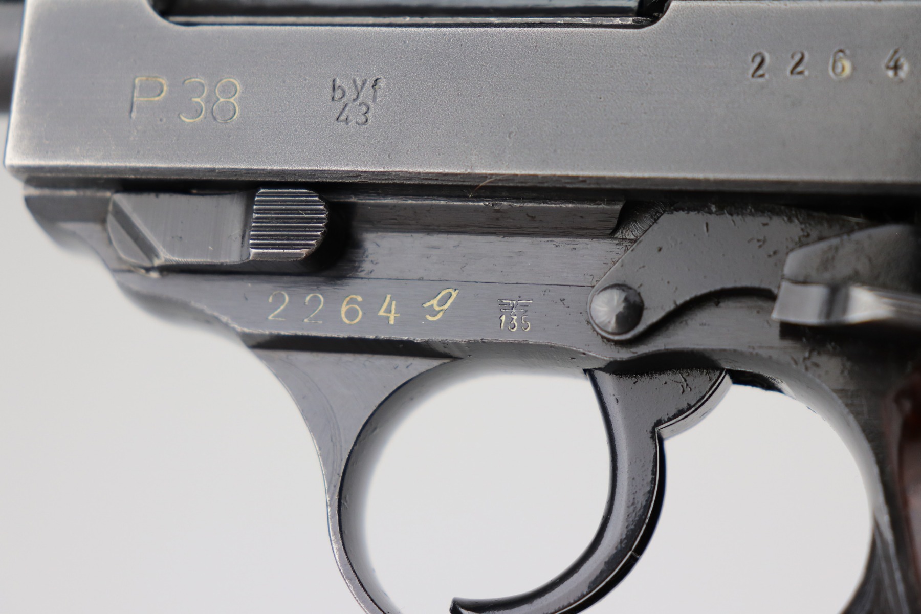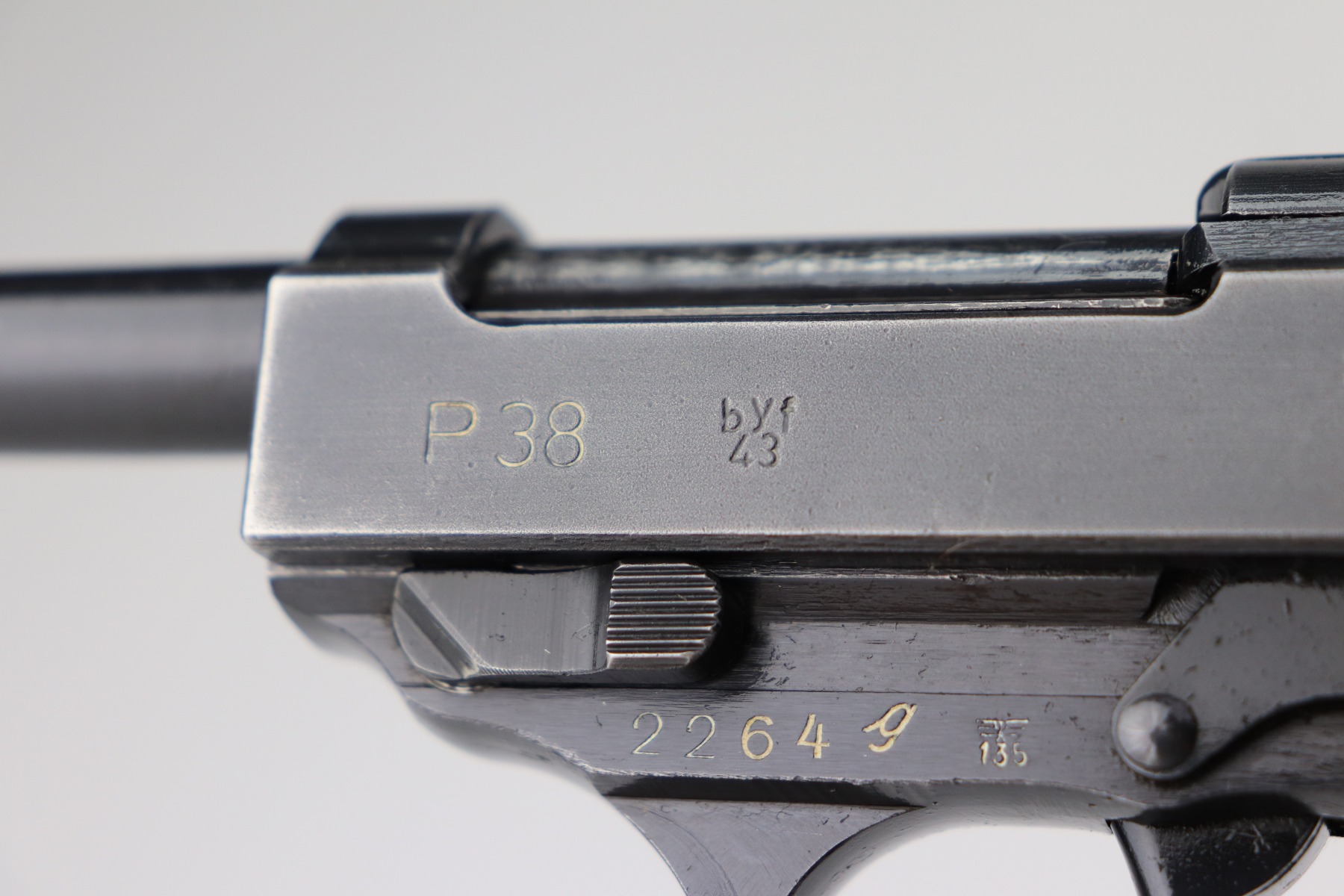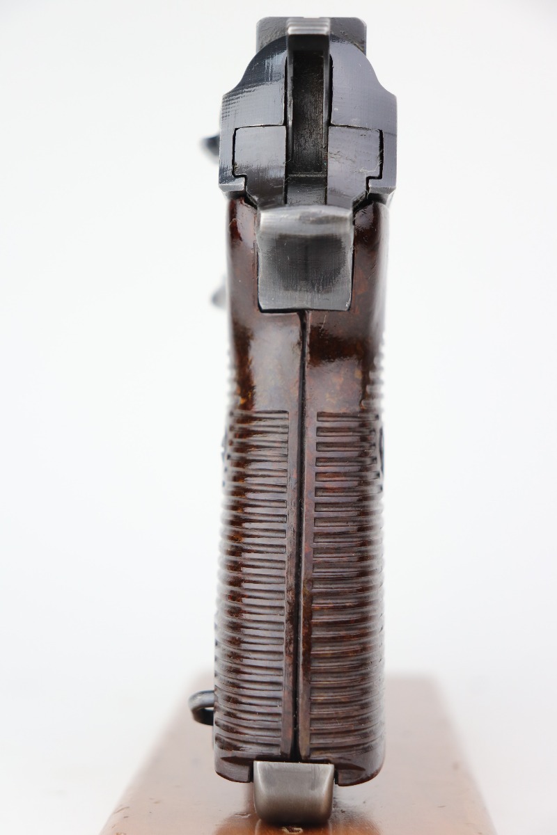 3/17/21 – This is a very nice example of a Mauser P.38 issued to the Nazi military in 1943. It is all matching and has the proper “Eagle 135” military proofs. This gun has a really interesting appearance. It has a dust-blue finished slide and a more typical blued finish on the frame and barrel, giving it sort of a dual tone finish. It has retained somewhere between 85-90% of its original finish. There is thinning on the front strap and minor wear around the muzzle and high edges of the slide. Some minor wear on the top of the barrel in the ejection port. Comes with excellent grips and a period-correct magazine. The bore is excellent – shiny with strong rifling. De-cocker is functional.