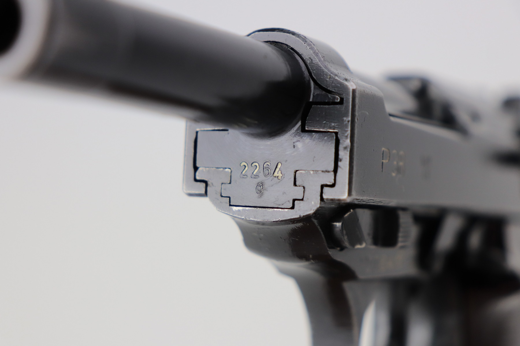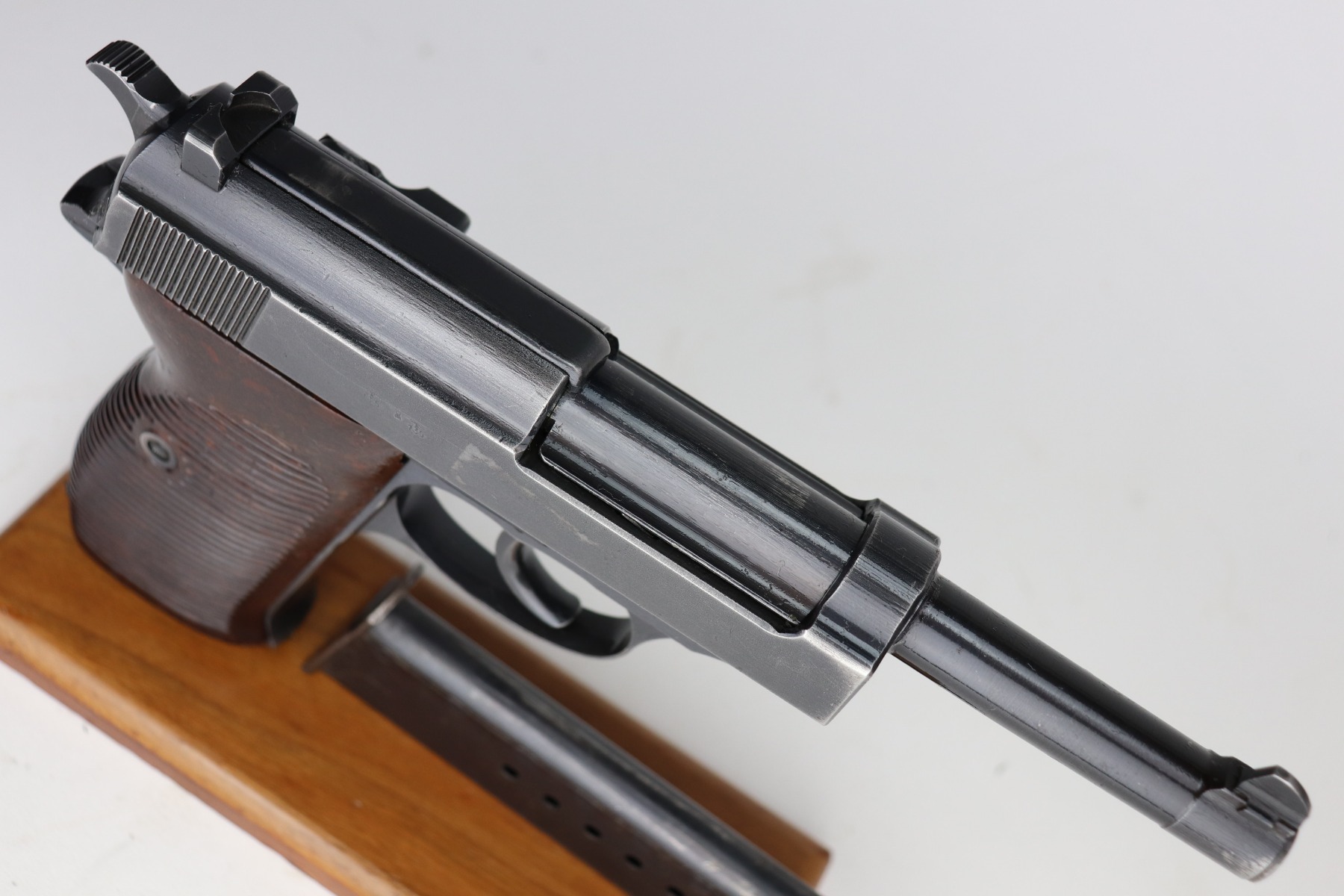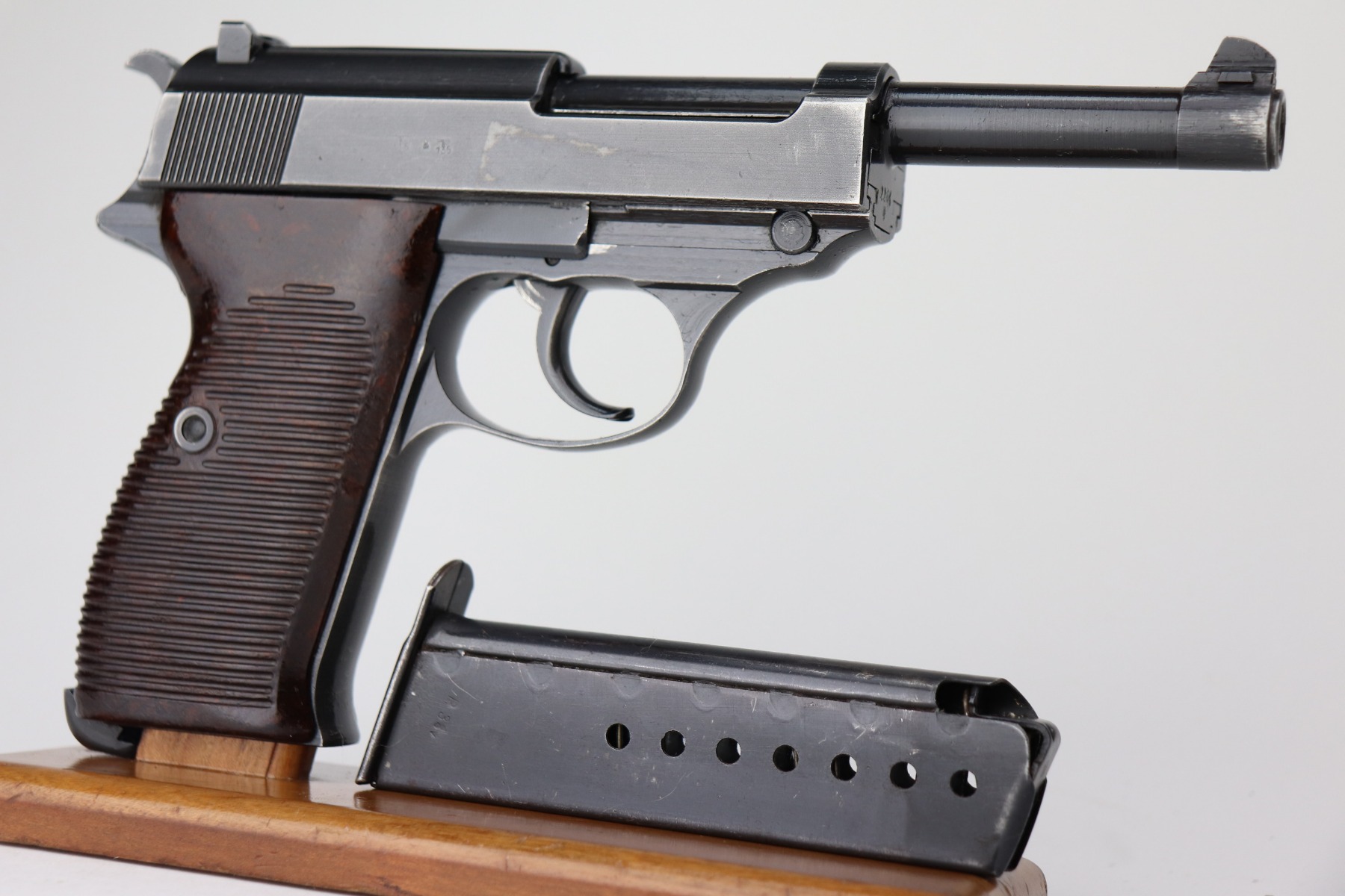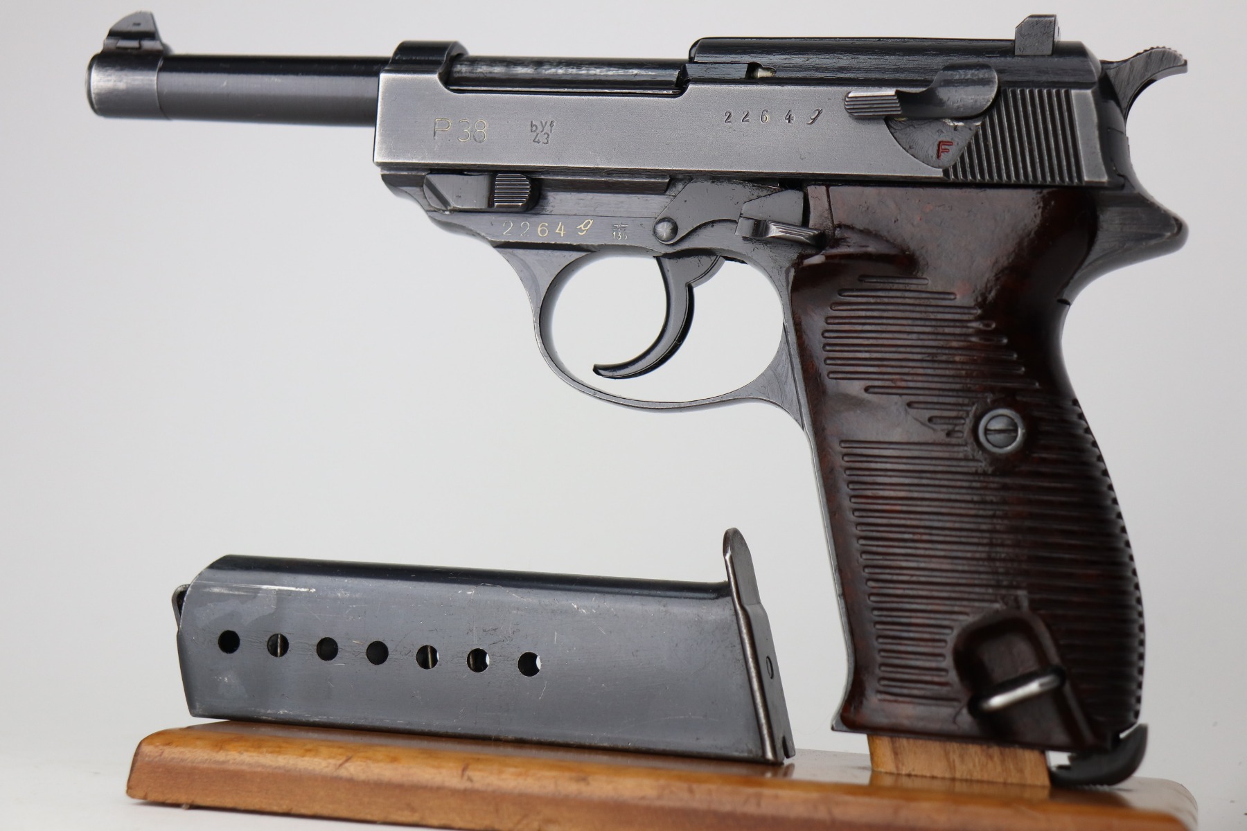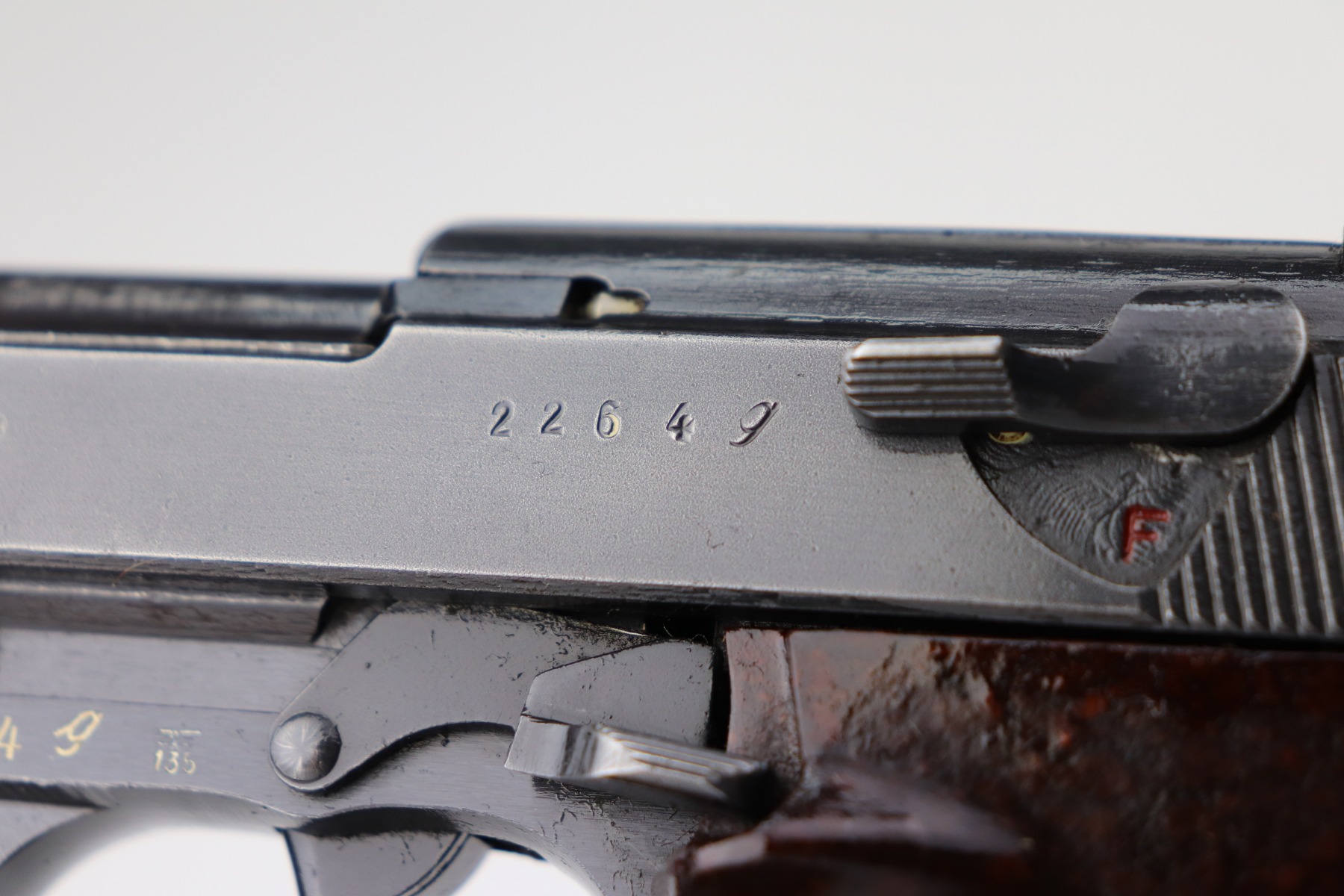 3/17/21 – This is a very nice example of a Mauser P.38 issued to the Nazi military in 1943. It is all matching and has the proper “Eagle 135” military proofs. This gun has a really interesting appearance. It has a dust-blue finished slide and a more typical blued finish on the frame and barrel, giving it sort of a dual tone finish. It has retained somewhere between 85-90% of its original finish. There is thinning on the front strap and minor wear around the muzzle and high edges of the slide. Some minor wear on the top of the barrel in the ejection port. Comes with excellent grips and a period-correct magazine. The bore is excellent – shiny with strong rifling. De-cocker is functional.