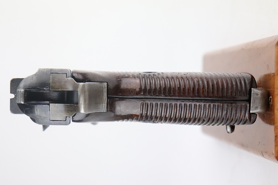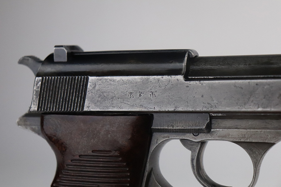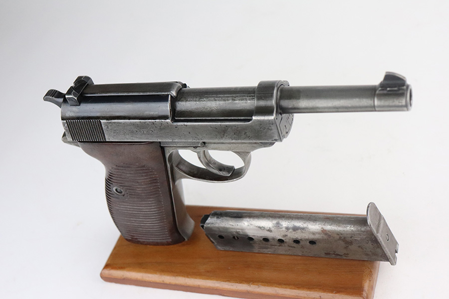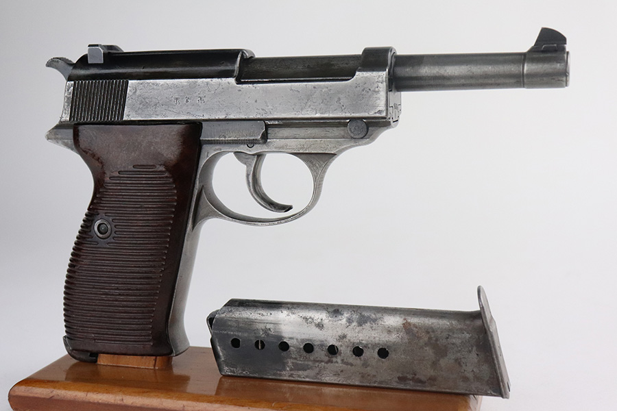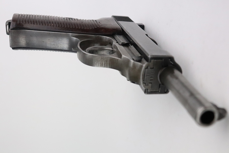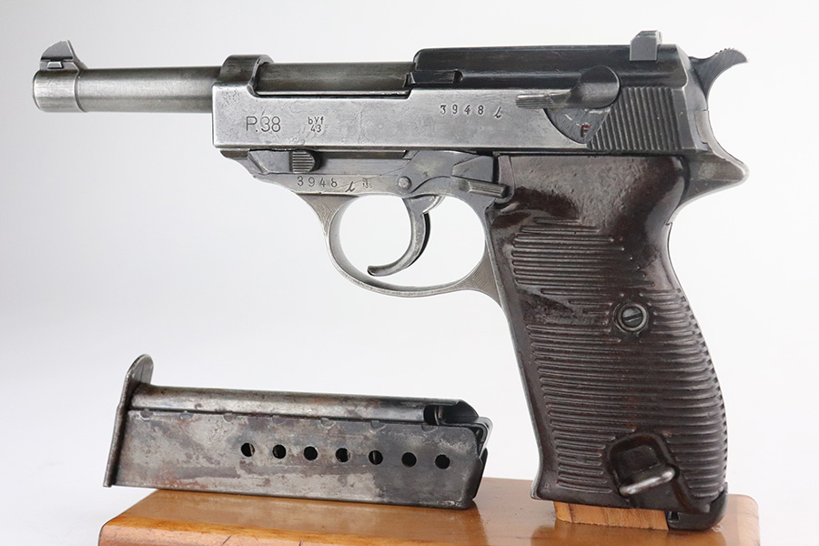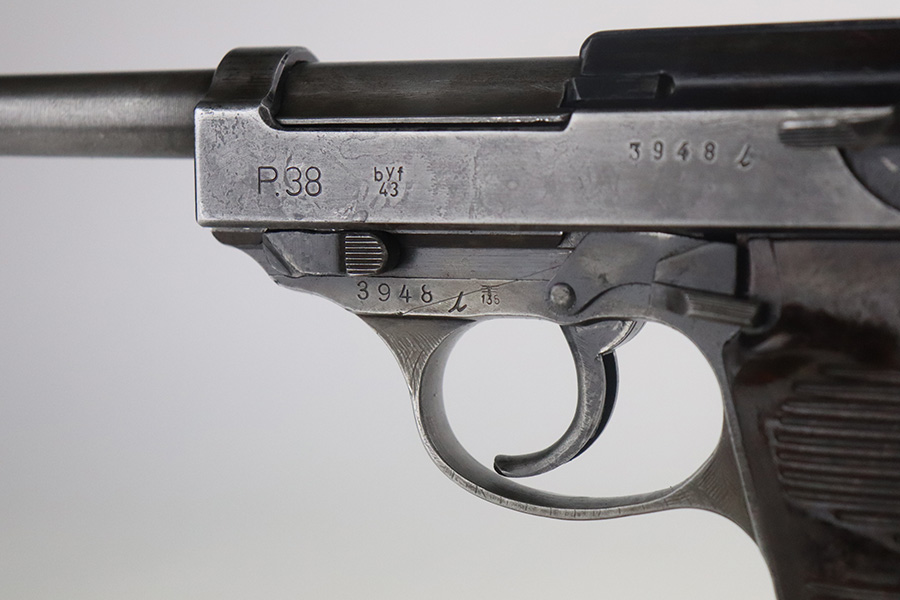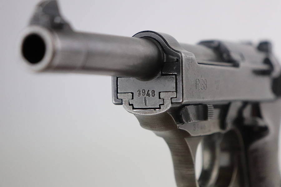 7/13/21 – This is an all matching and original Nazi Mauser P.38 from October of 1943. All matching and original but the finish is obviously quite worn throughout, with some splotchy areas on the slide. While it may not be the prettiest, this one has a fairly strong bore and is good mechanically, including the de-cocker. Seems like it would make a good shooter while also being an original and matching example. Nice red grips and an original Mauser magazine.