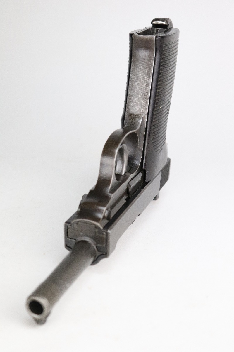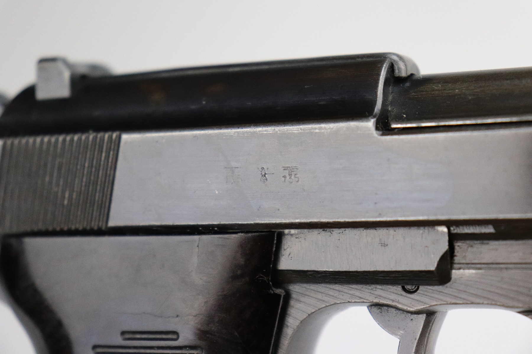 8/20/20 – This is an original, WW2, Mauser P.38 issued to the Nazi military in 1943. The slide has the “byf 43” Mauser factory code. It is all matching and has the proper “Eagle 135” Nazi military acceptance proofs. The nature of the finish makes this particular gun difficult to rate – while it doesn’t appear to have very much actual finish loss, there are areas of discoloration and patina showing under the finish throughout. Our best estimate of remaining bluing is somewhere between 85-90%. The discoloration is most noticeable on the right side of the slide. There is minor muzzle wear, wear along the top of the barrel (in ejection port), and a few light handling marks on the right side of the barrel. There is thinning on the front strap and underside of tang. The gun is fully functional, including de-cocker. Comes with excellent, original grips and a proper wartime Mauser magazine. The bore has decent rifling, but there is pitting in the grooves throughout.